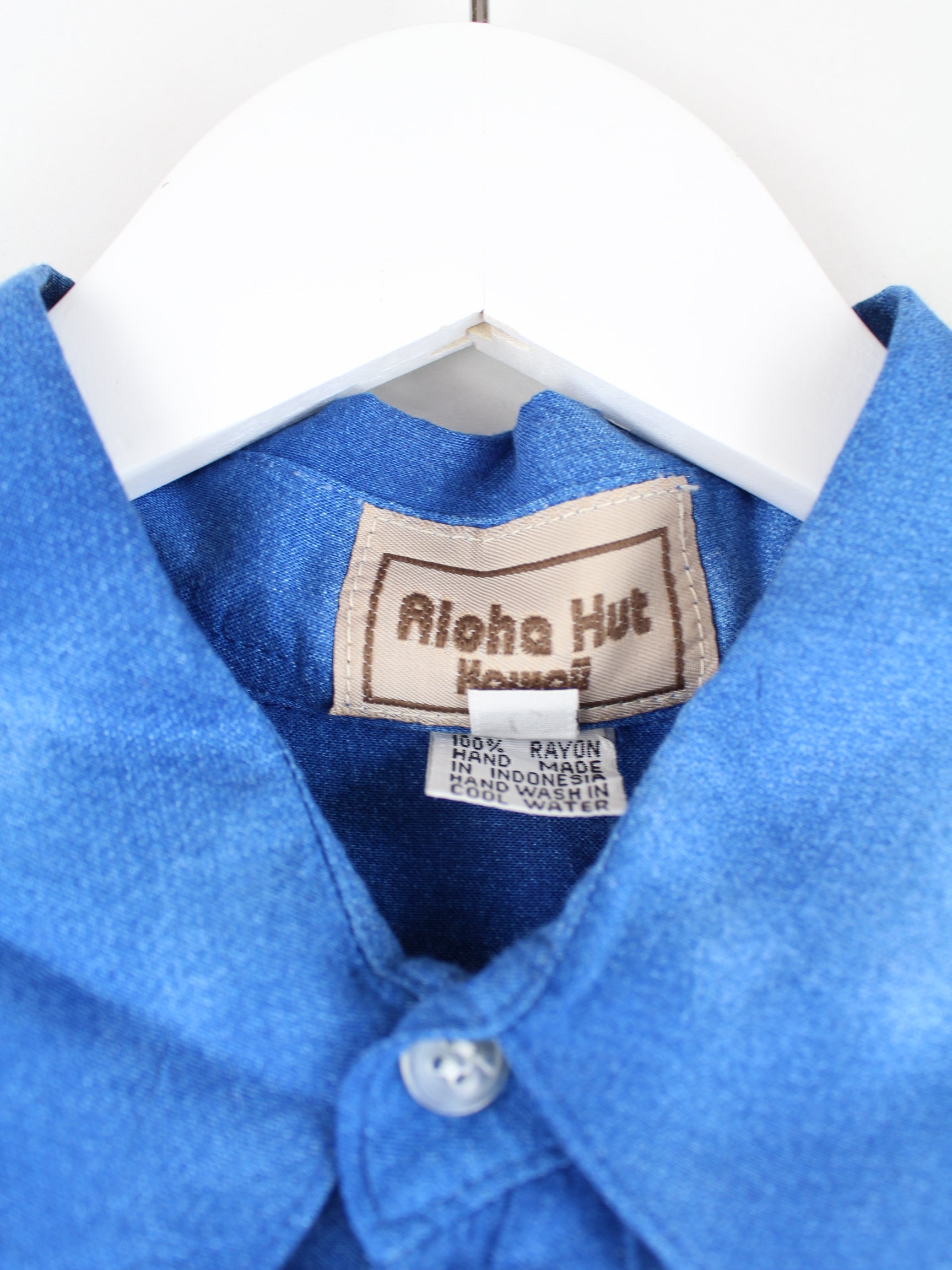 Vintage Freizeit Hemd in Größe M aus den 90'ern. Es ist aus Synthetik produziert und in Blau bei uns zu bekommen.