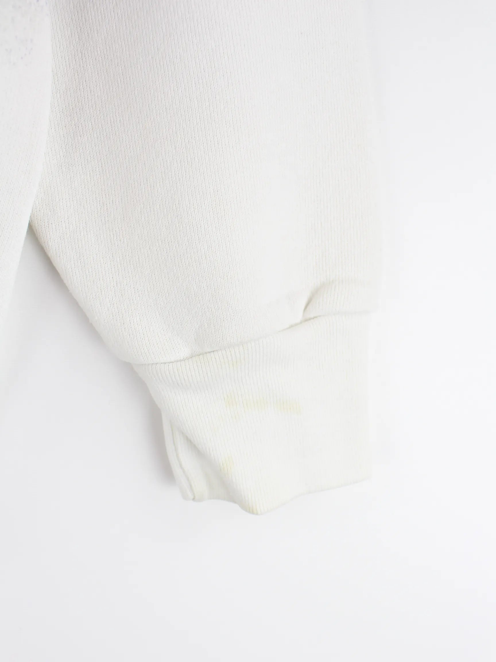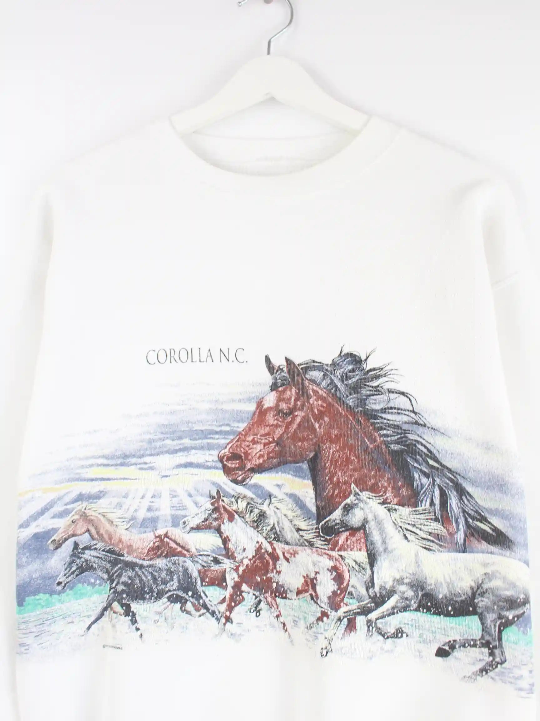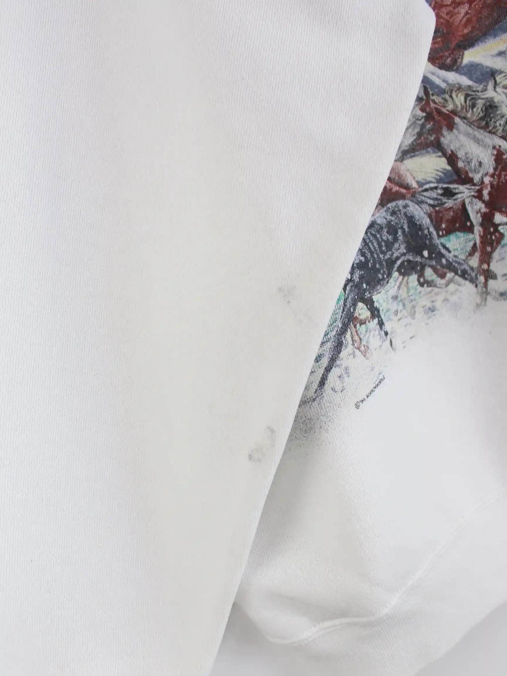 Weißer Vintage Sweater aus den 90'ern in Größe S. Er ist aus einer Baumwollmischung produziert. Den Zustand würden wir als 'In Ordnung' bezeichnen (vergl. Bilder).Mit schickem Horse Print.
