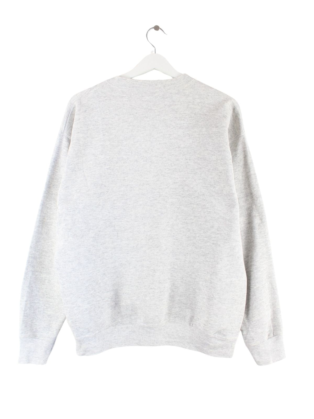 Grauer Vintage Sweater aus den 90'ern in Größe L. Er ist aus einer Baumwollmischung gefertigt und in sehr gutem Zustand lieferbar. Mit schickem Hawkeyes Print.