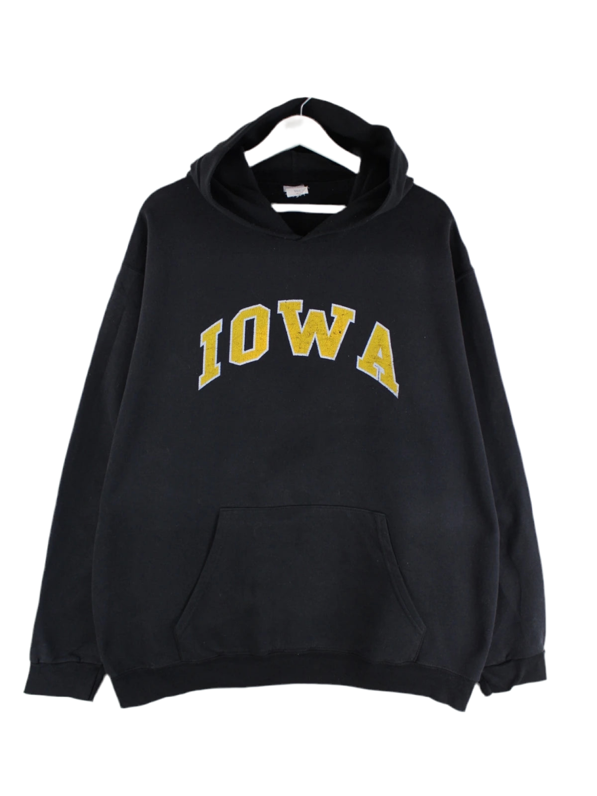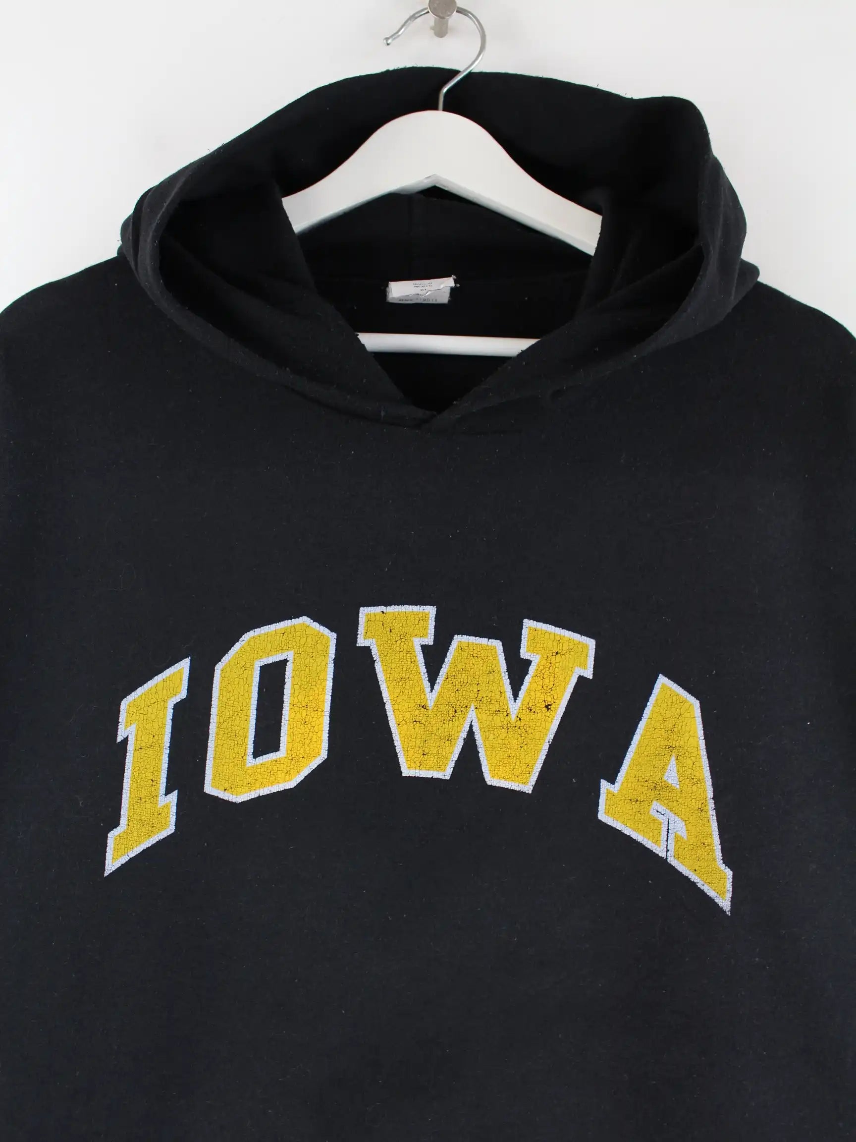 Schwarzer Vintage Hoodie aus den 90'ern in Größe XL. Er ist aus einer Baumwollmischung produziert und in gutem Zustand lieferbar. Mit schönem IOWA Print.