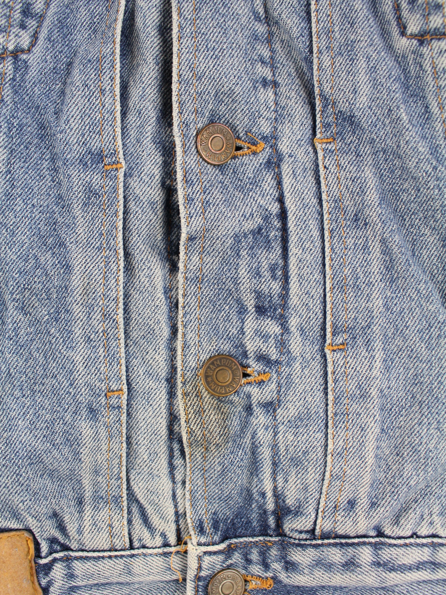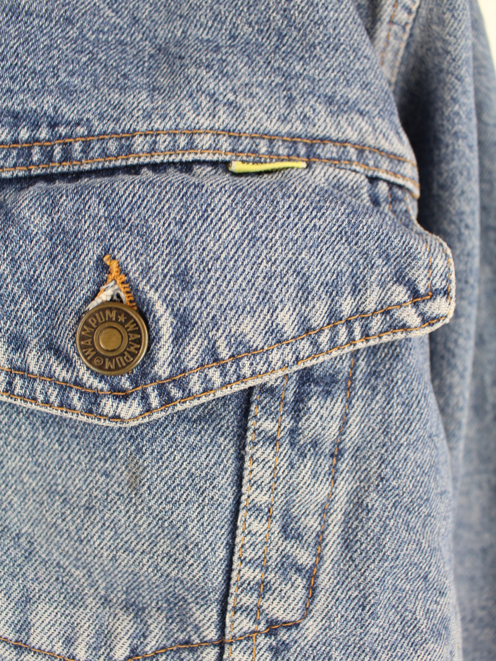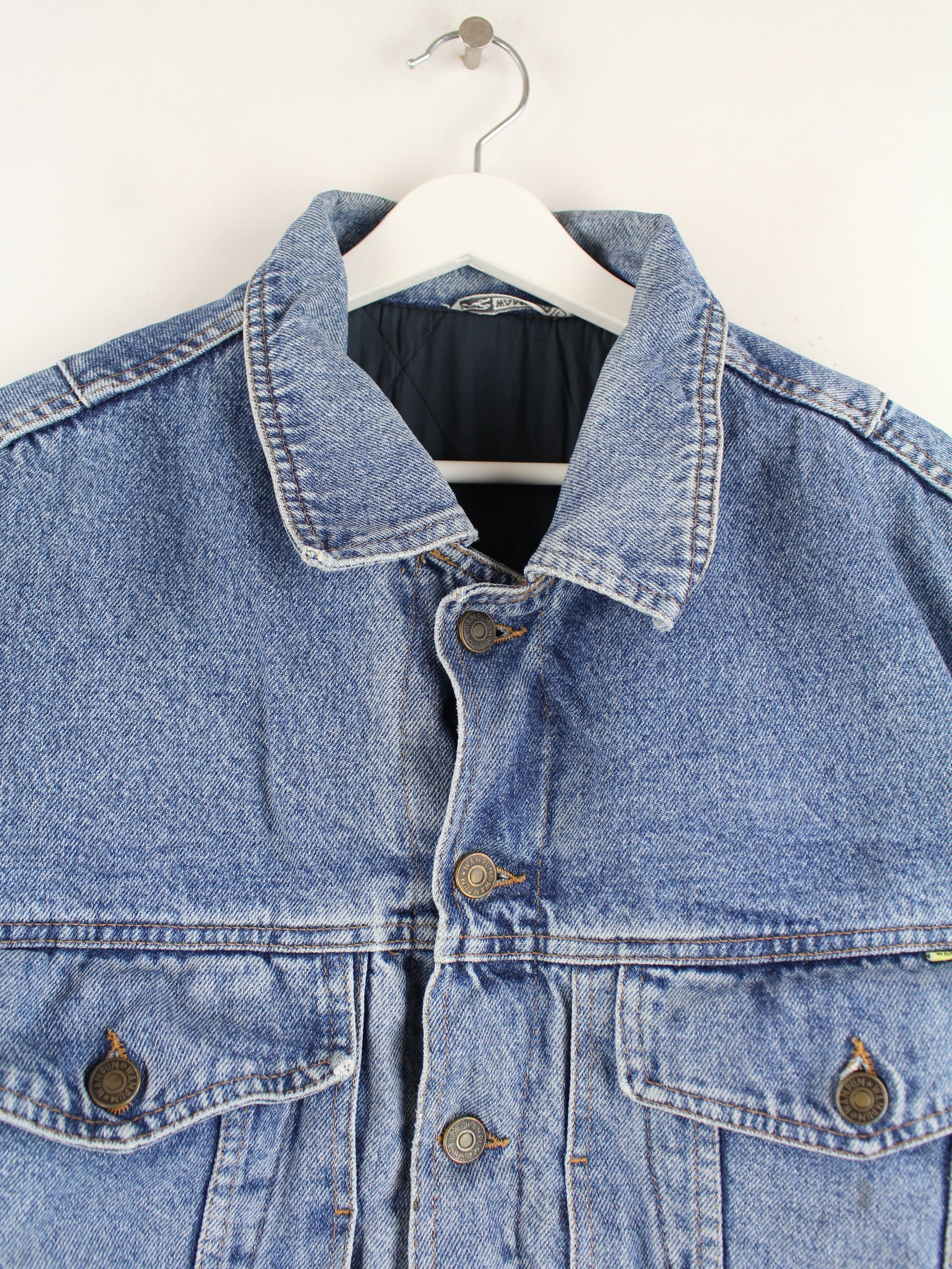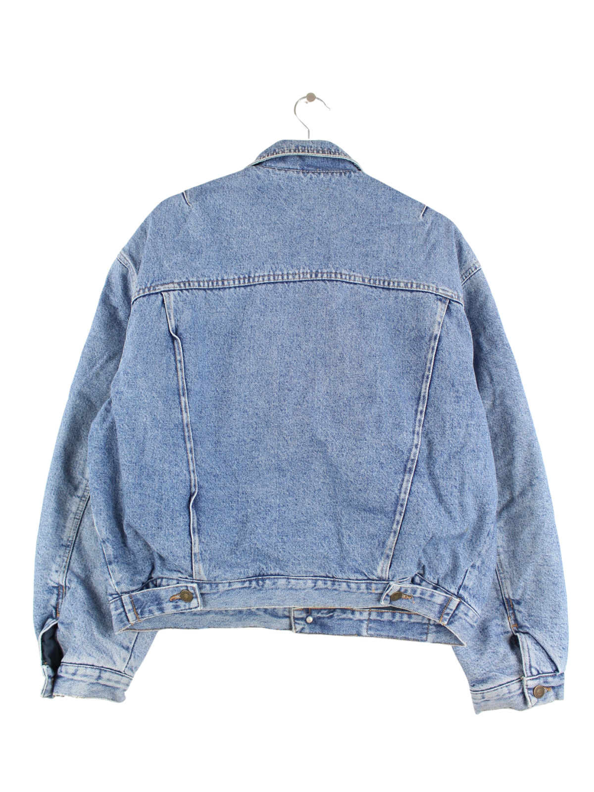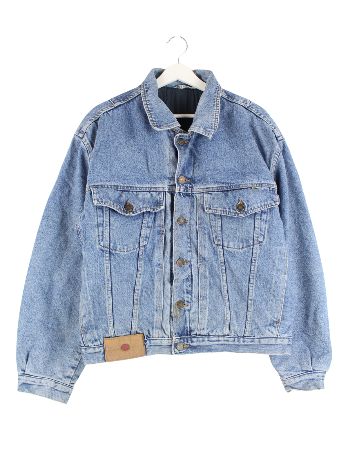 Blaue Vintage Jacke aus den 90'ern in Größe L. Sie ist aus Baumwolle hergestellt und in gutem Zustand zu haben.