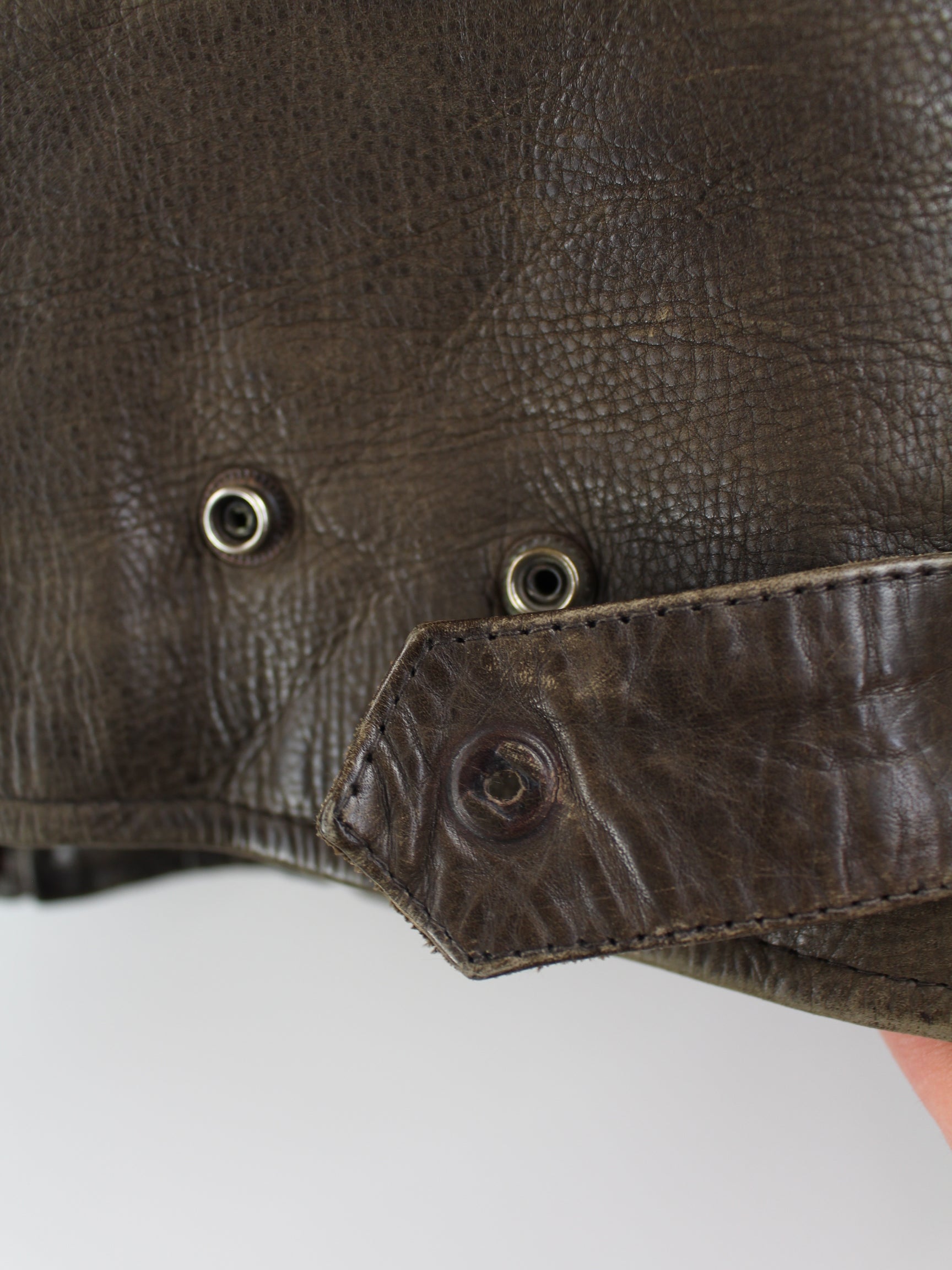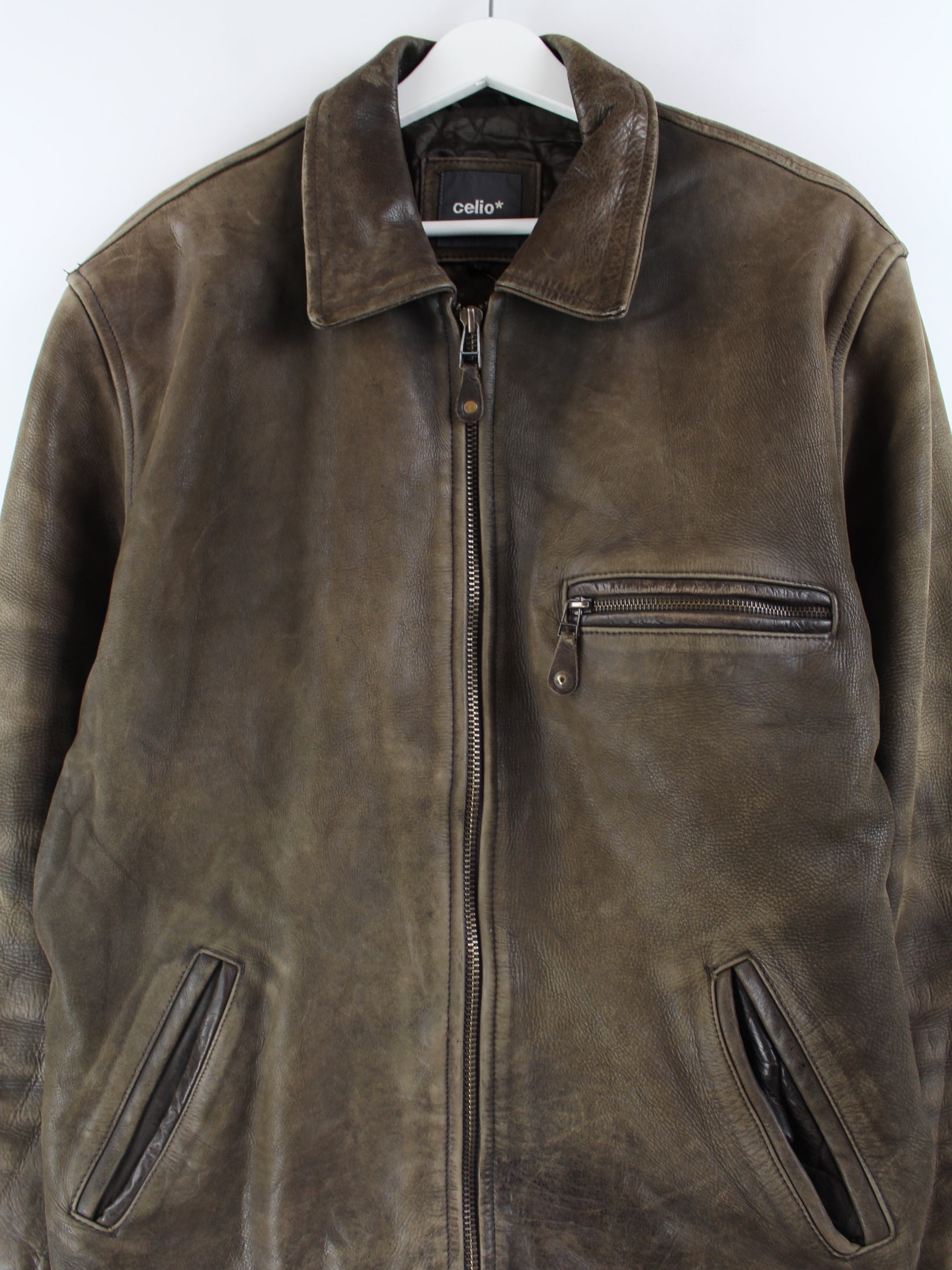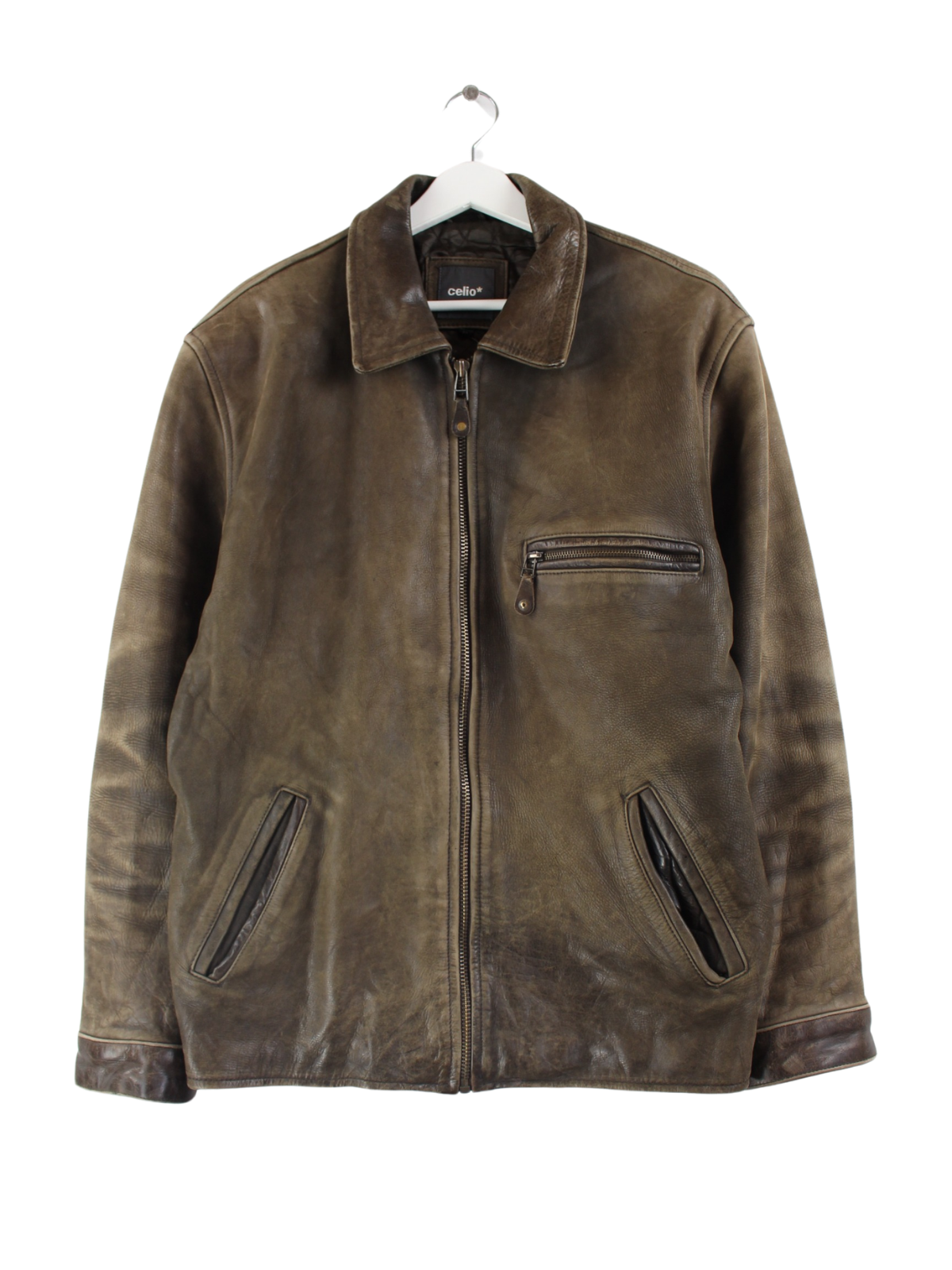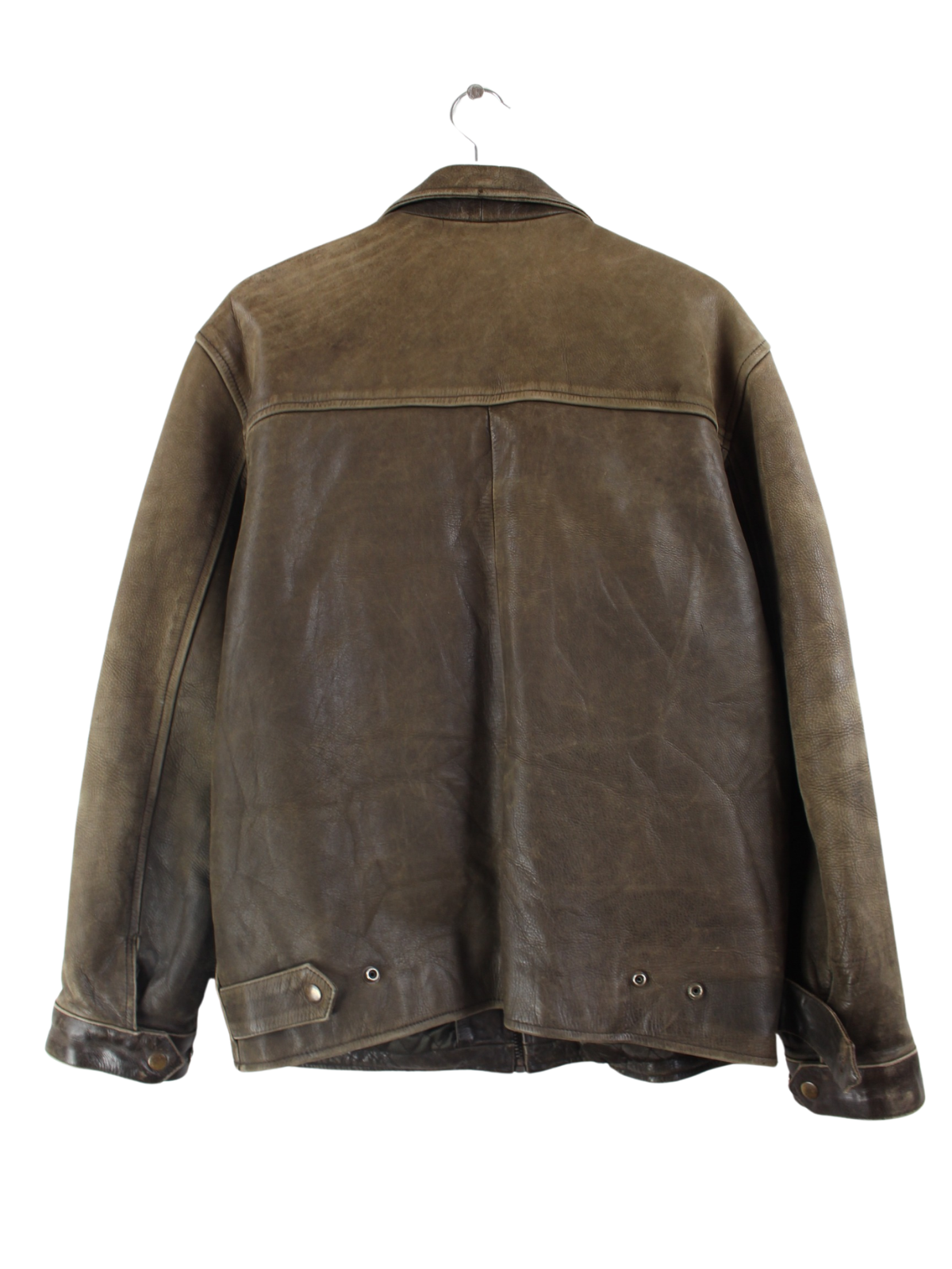 Vintage Jacke in Größe L aus den 90'ern. Sie ist aus Leder hergestellt und in Braun lieferbar.