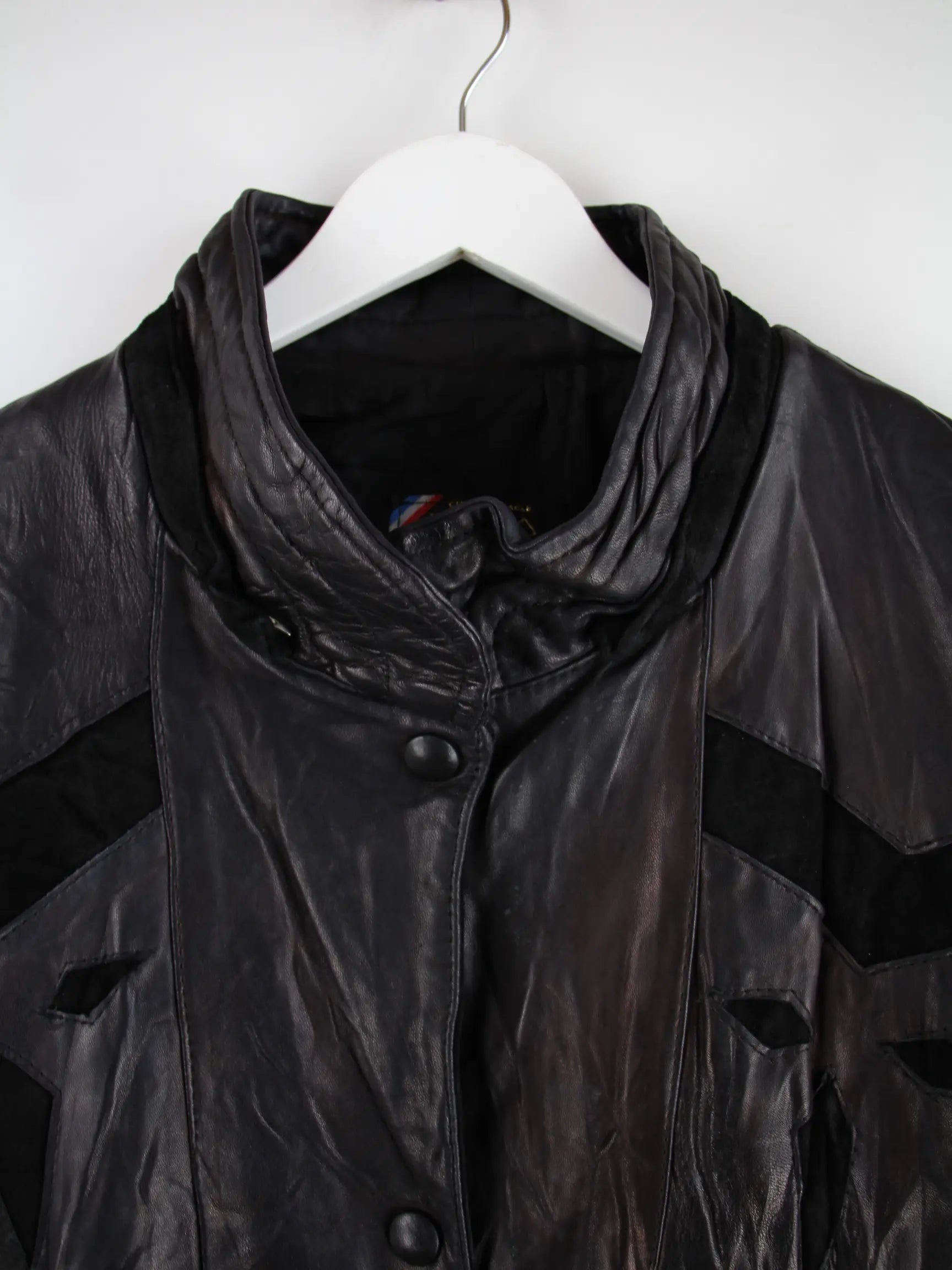 Vintage Jacke in Größe M aus den 90'ern. Sie ist aus Leder gefertigt und in Schwarz bei uns zu bekommen.