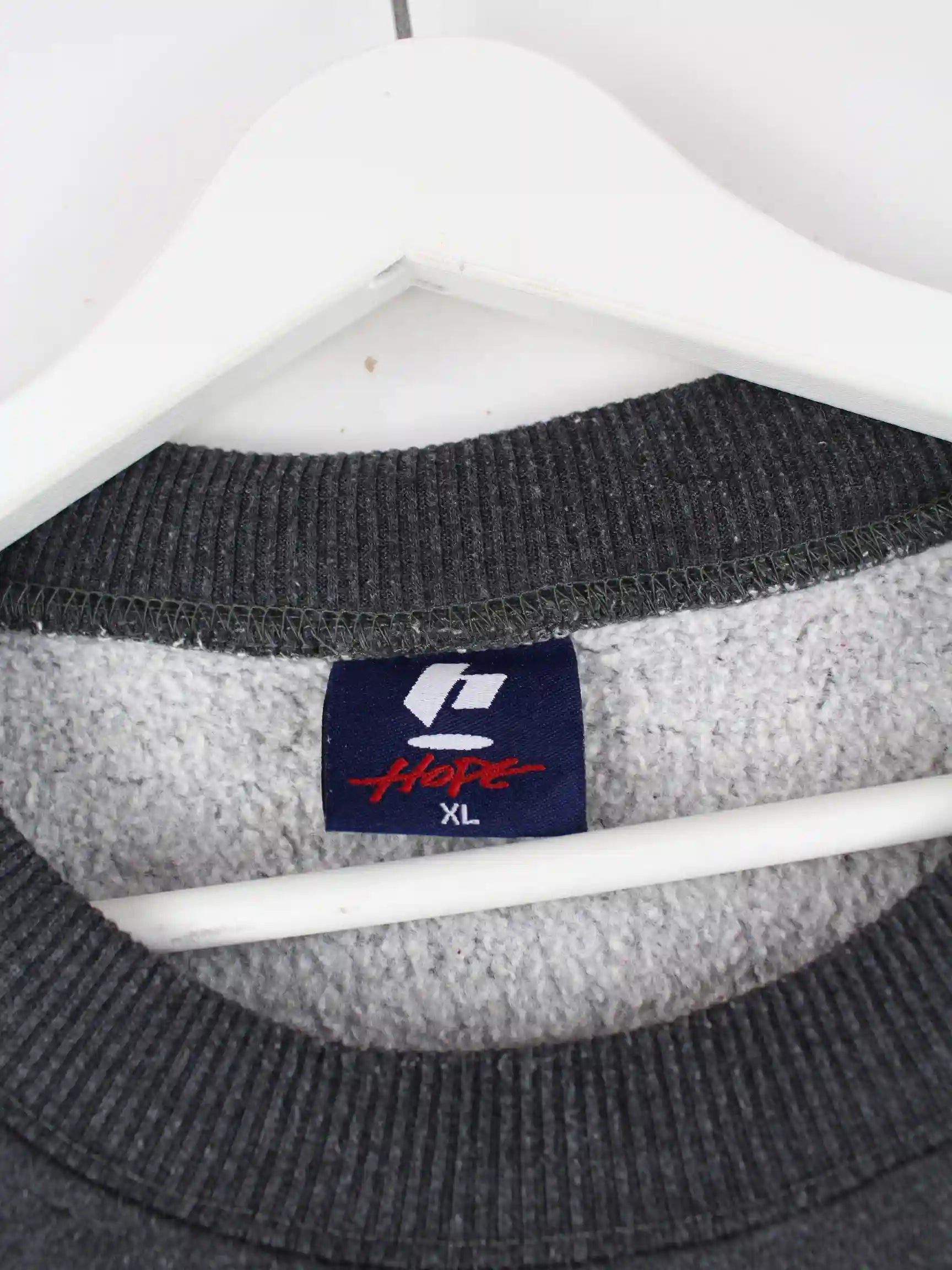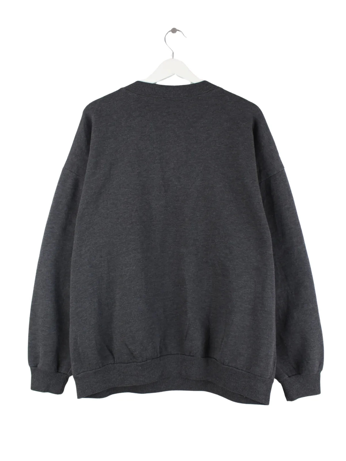 Vintage Sweater mit gesticktem Logo in Größe XL aus den 90'ern. Er ist aus einer Baumwollmischung produziert und in Grau zu haben.