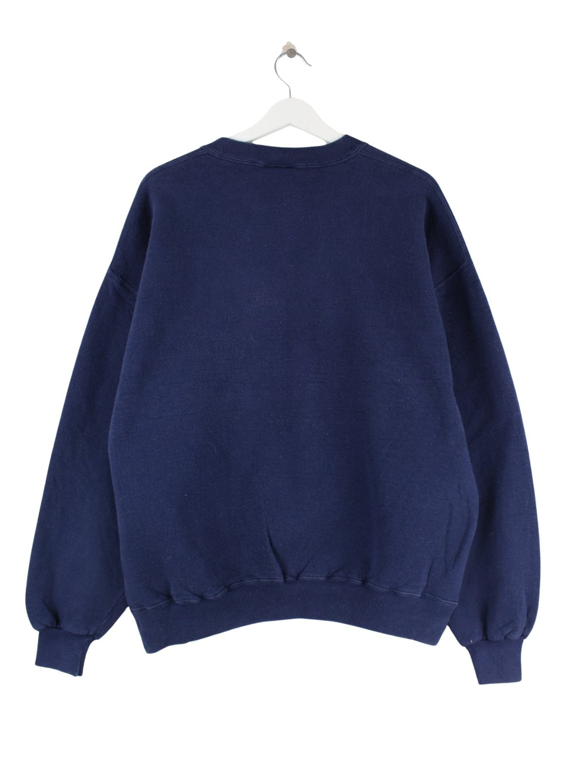 Vintage Sweater mit Stickereien in Größe XL aus den 90'ern. Er ist aus einer Baumwollmischung gemacht und in Blau bei uns vorrätig.