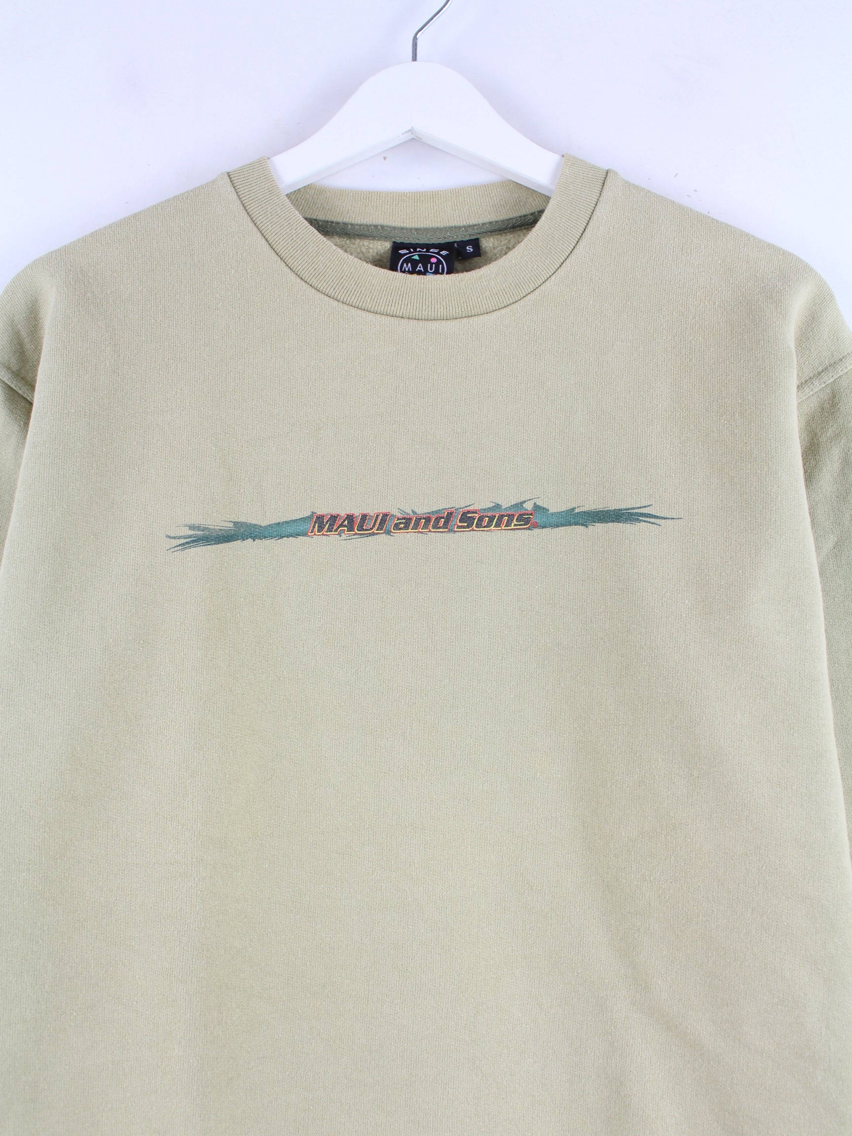 Khakifarbener Vintage Sweater aus den 90'ern in Größe S. Er ist aus Baumwolle hergestellt. Den Zustand würden wir als 'In Ordnung' bezeichnen (vergl. Bilder).Mit seltenem Sons Print.