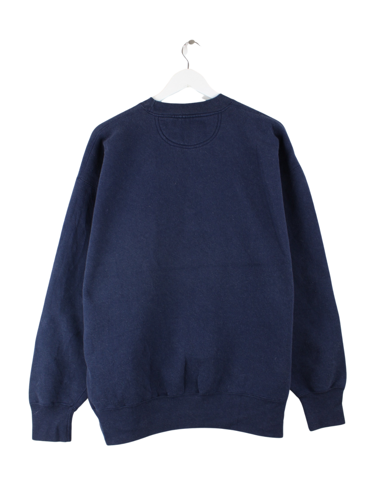 Vintage Sweater mit Stick in Größe L aus den 90'ern. Er ist aus einer Baumwollmischung gefertigt und in Blau bei uns vorrätig.