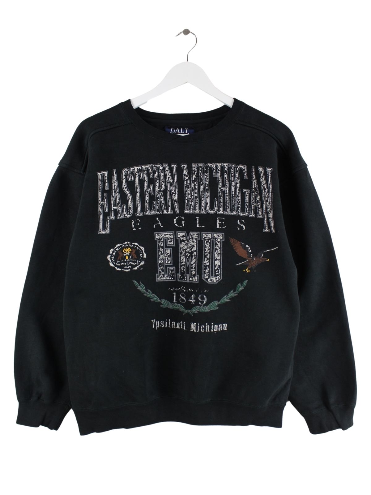 Vintage Sweater in Größe S aus den 90'ern. Er ist aus einer Baumwollmischung produziert und in Schwarz im Angebot. Mit schickem Michigan Print.