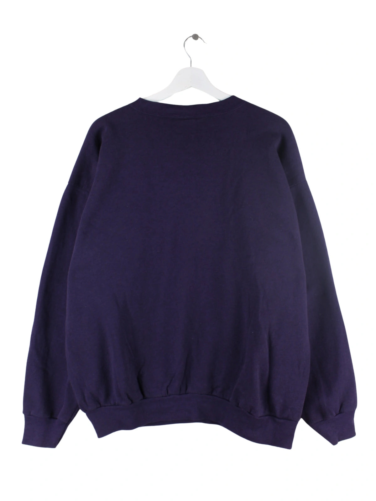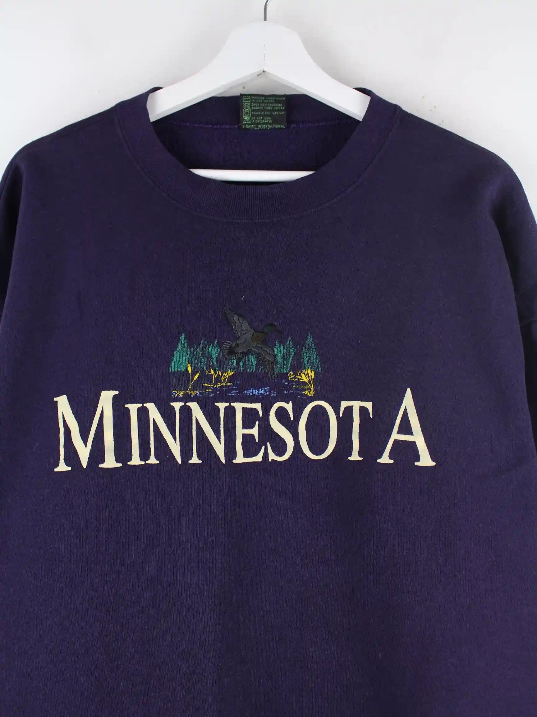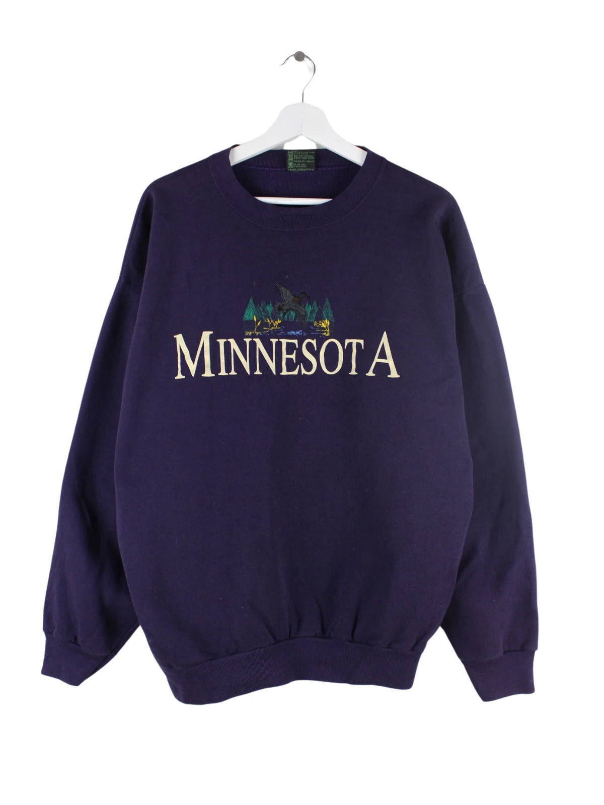 Lilafarbener Vintage Sweater aus den 90'ern in Größe XL. Er ist aus einer Baumwollmischung und in sehr gutem Zustand auf Lager. Mit tollem Minnesota Print.