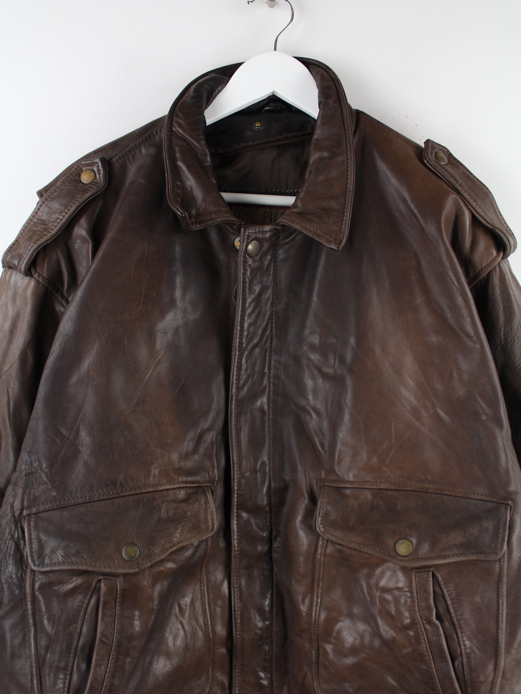 Vintage Jacke in Größe XL aus den 90'ern. Sie ist aus Leder hergestellt und in Braun lieferbar.