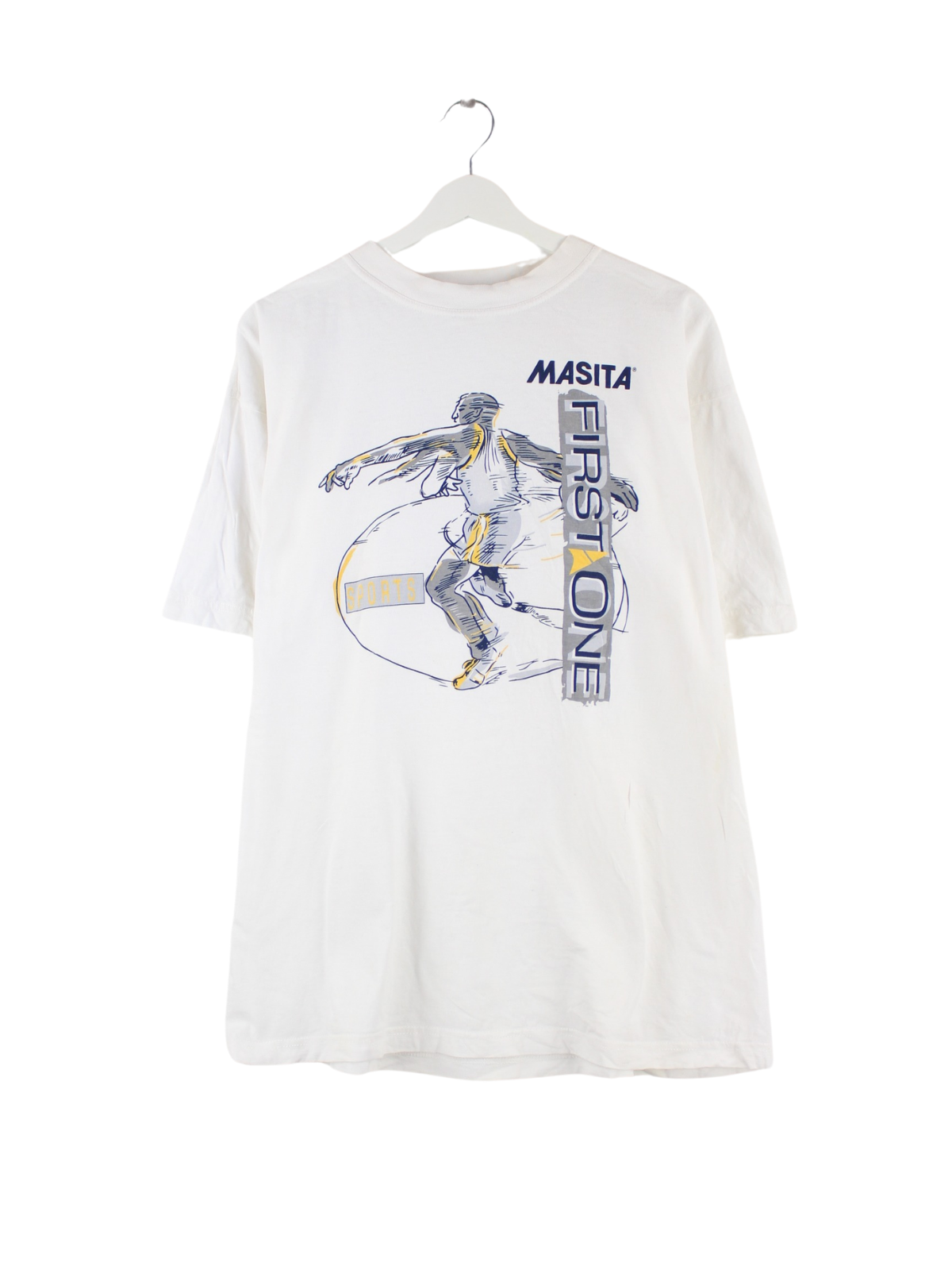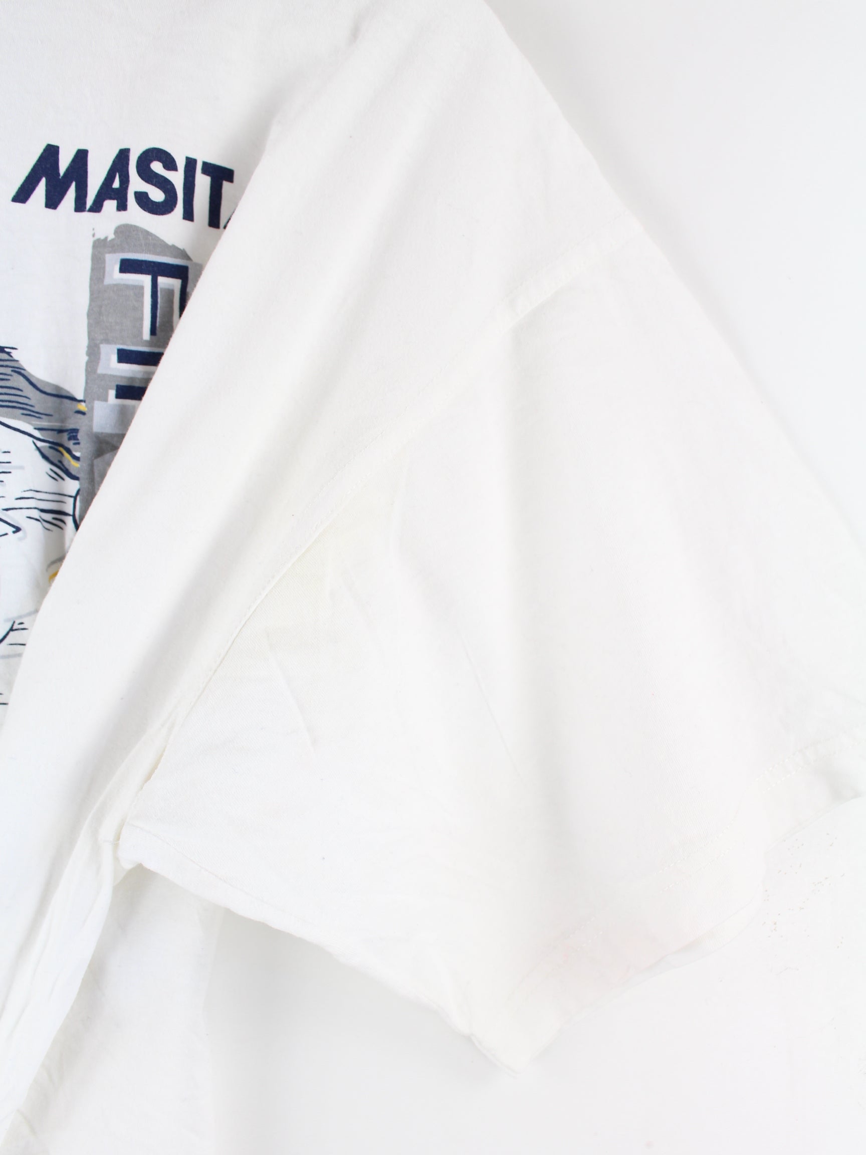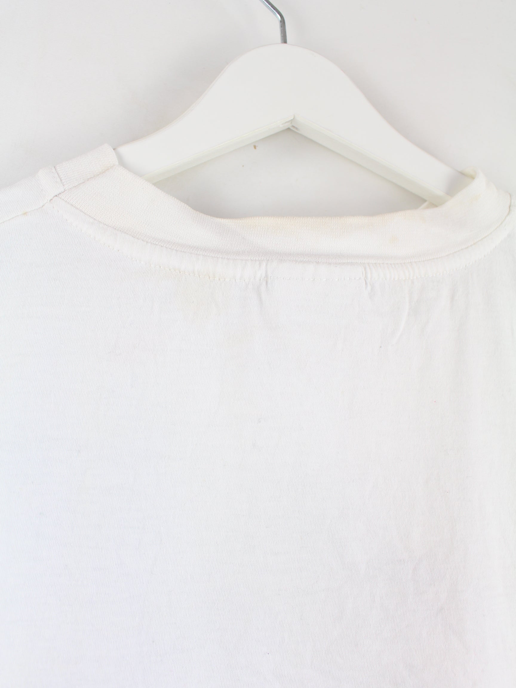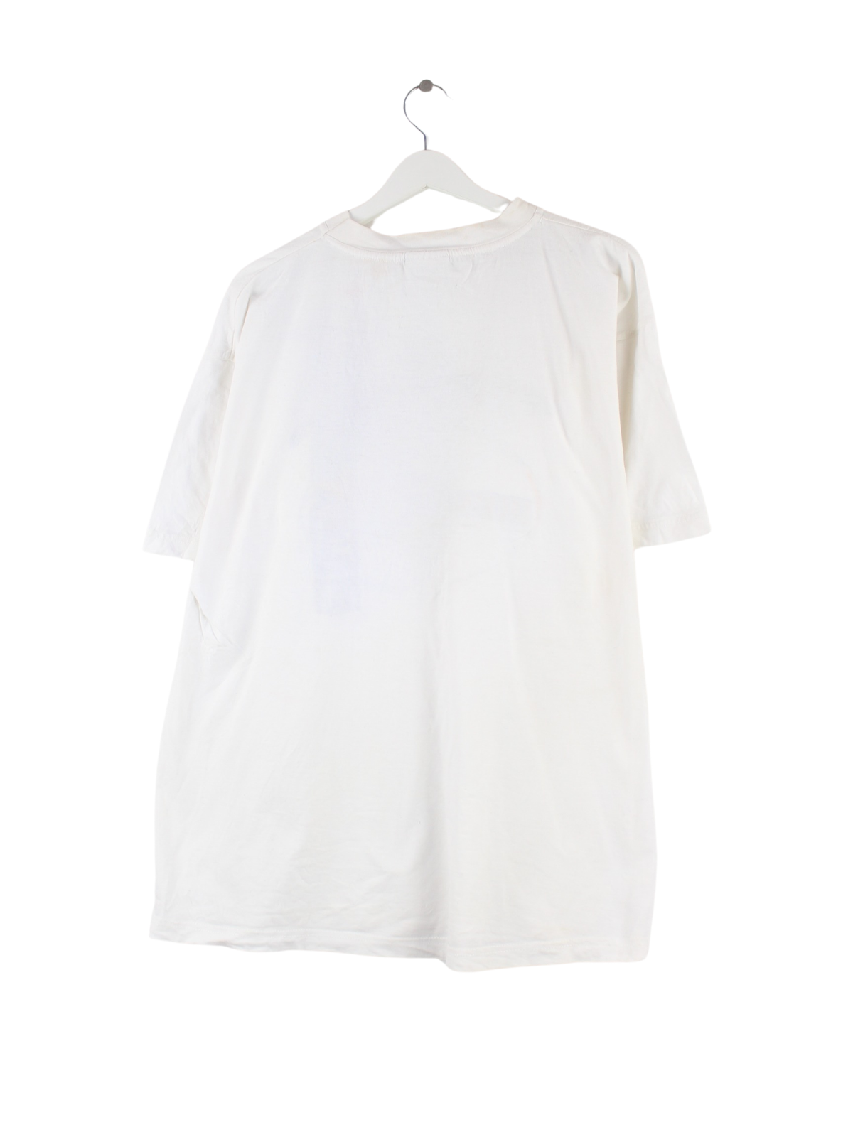 Weißes Vintage T-Shirt aus den 90'ern in Größe XL. Es ist aus Baumwolle hergestellt und in gutem Zustand vorrätig. Mit schickem 90s Print.