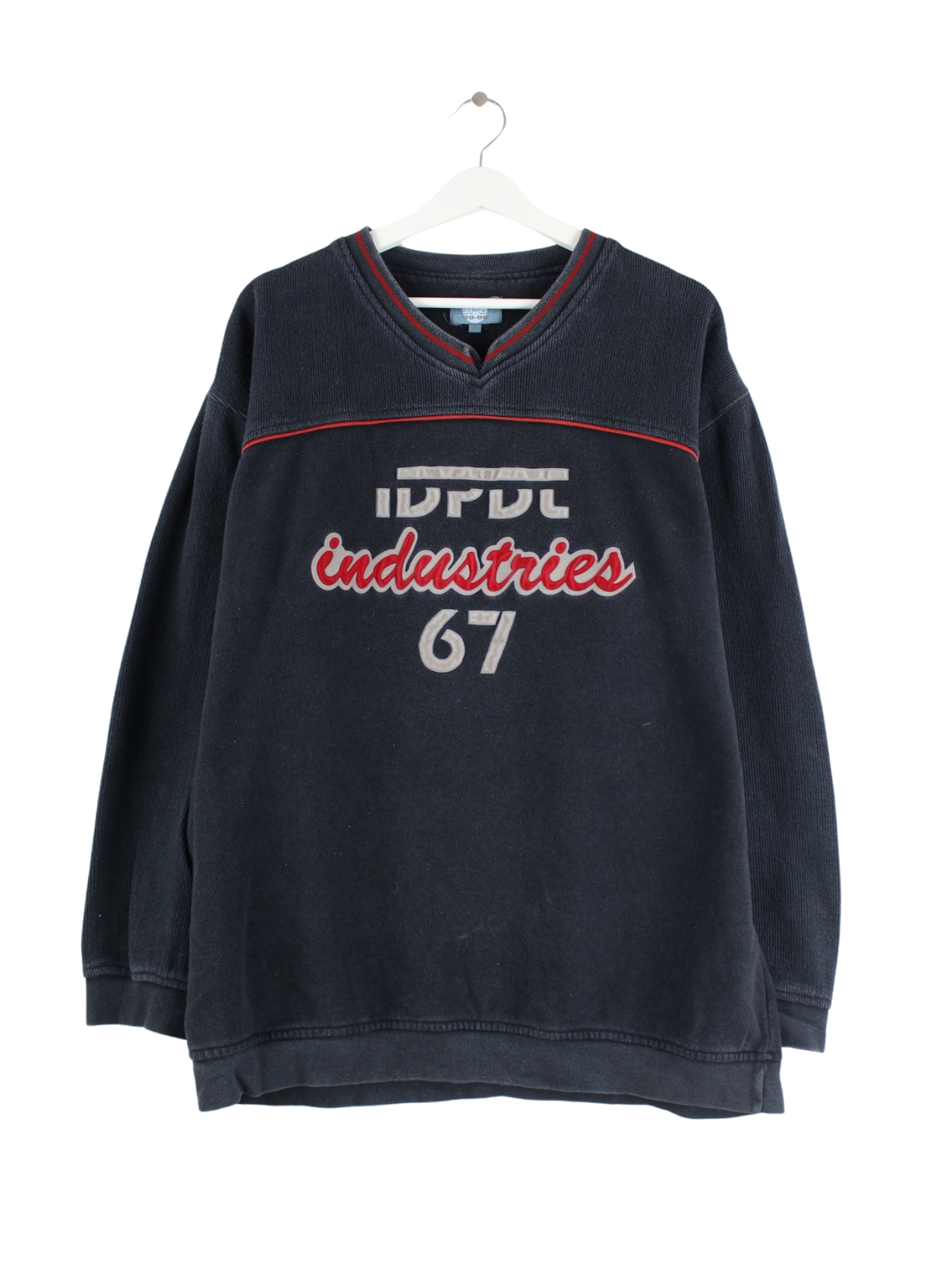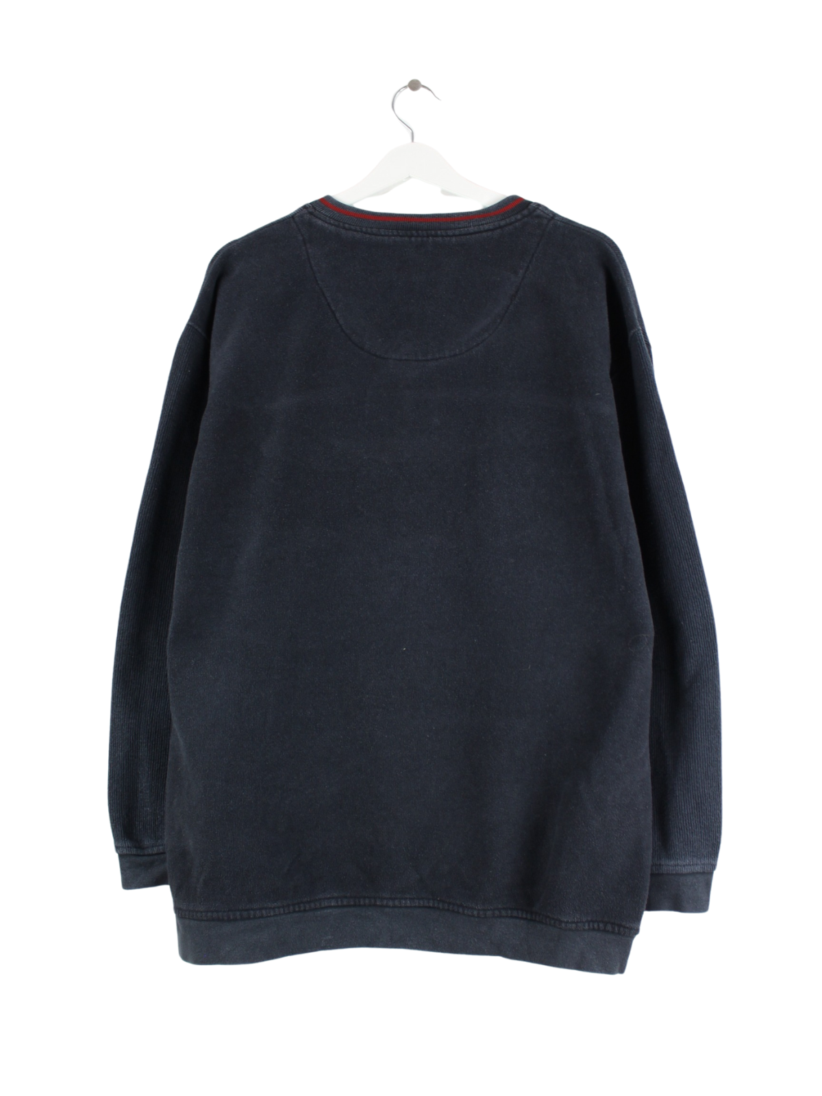 Blauer Vintage Sweater aus den 90'ern in Größe XL. Er ist aus einer Baumwollmischung angefertigt und in gutem Zustand vorrätig. Mit schönem Puff Print.
