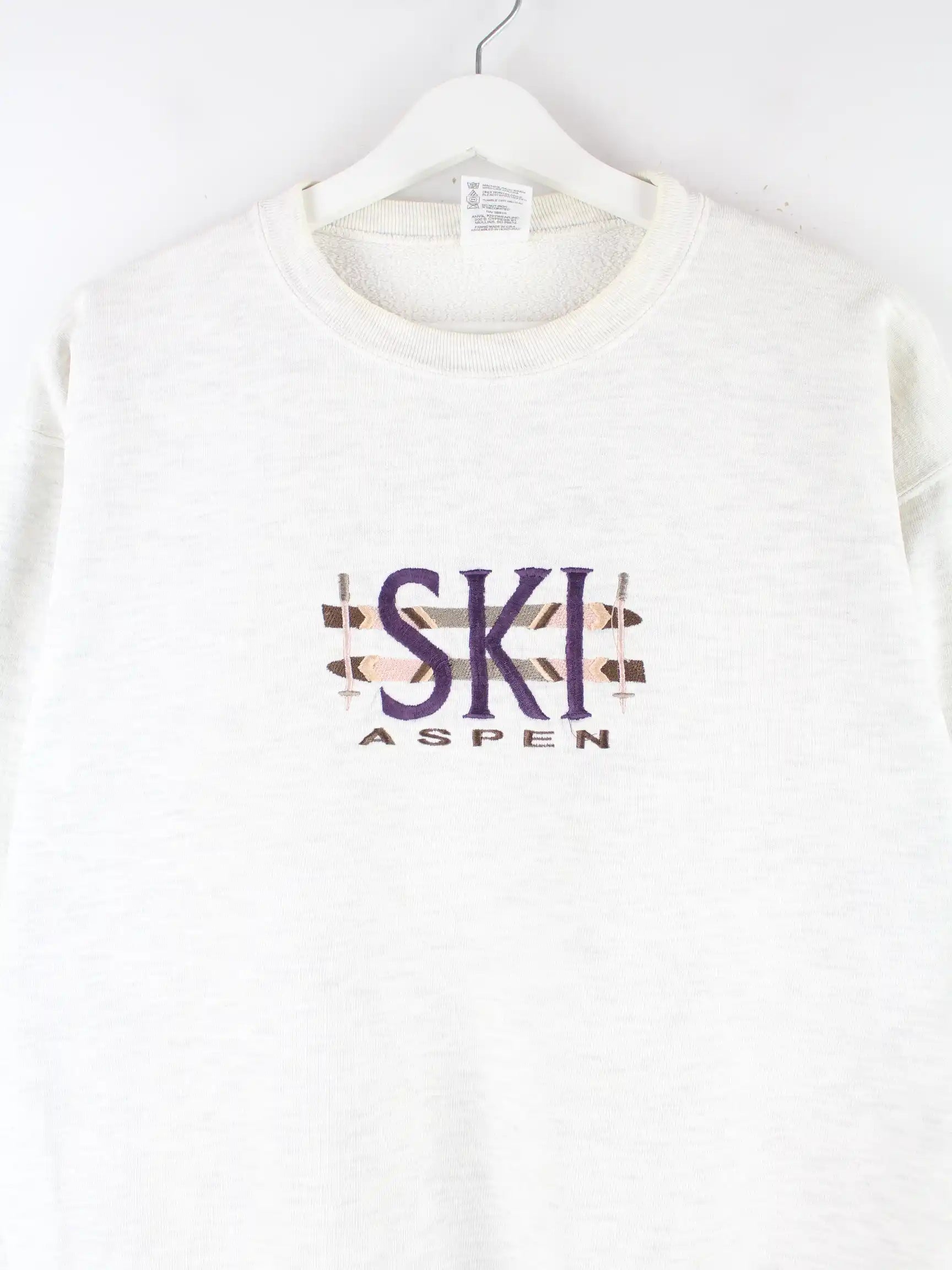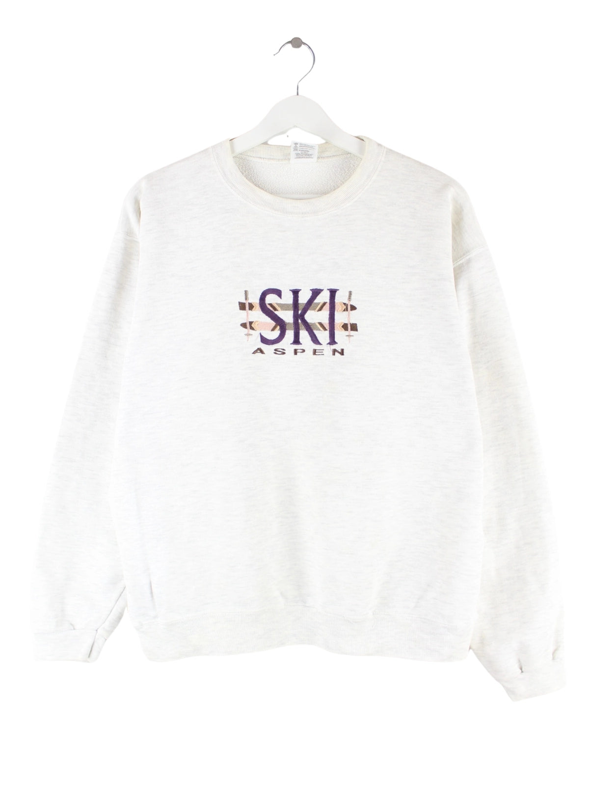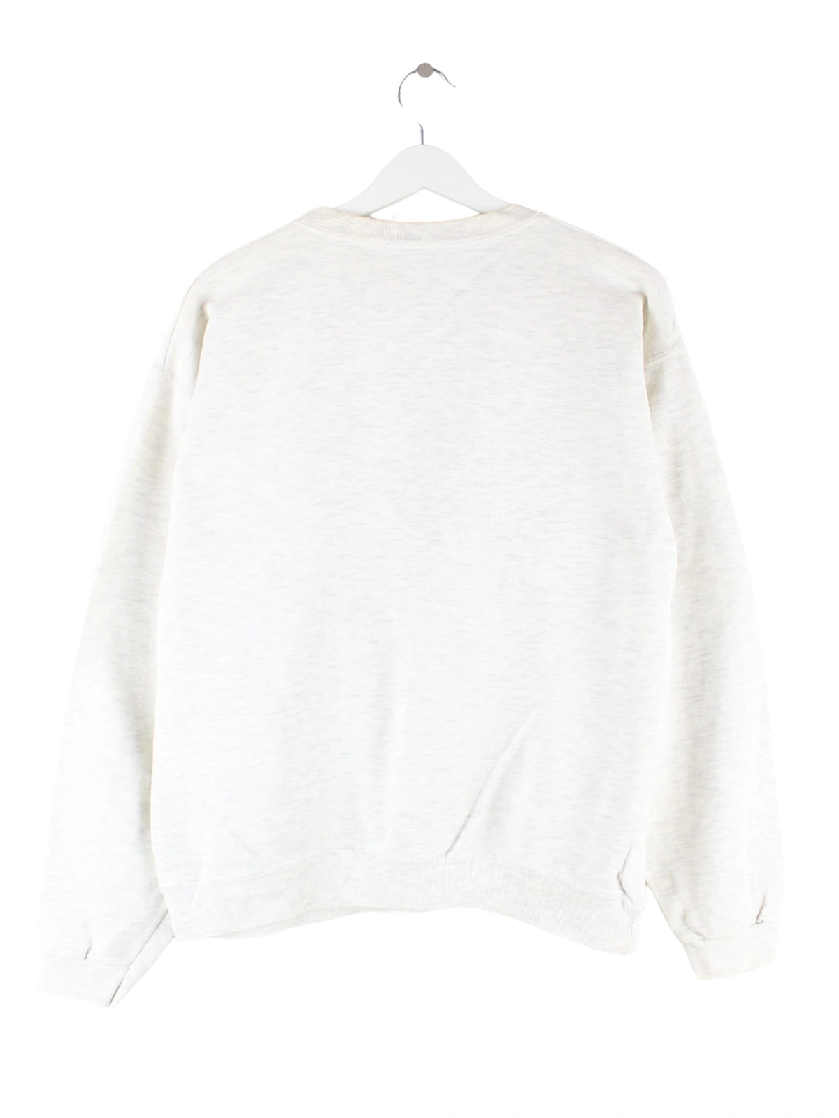 Grauer Vintage Sweater mit Stickereien aus den 90'ern in Größe M. Er ist aus einer Baumwollmischung gemacht und in gutem Zustand zu haben.