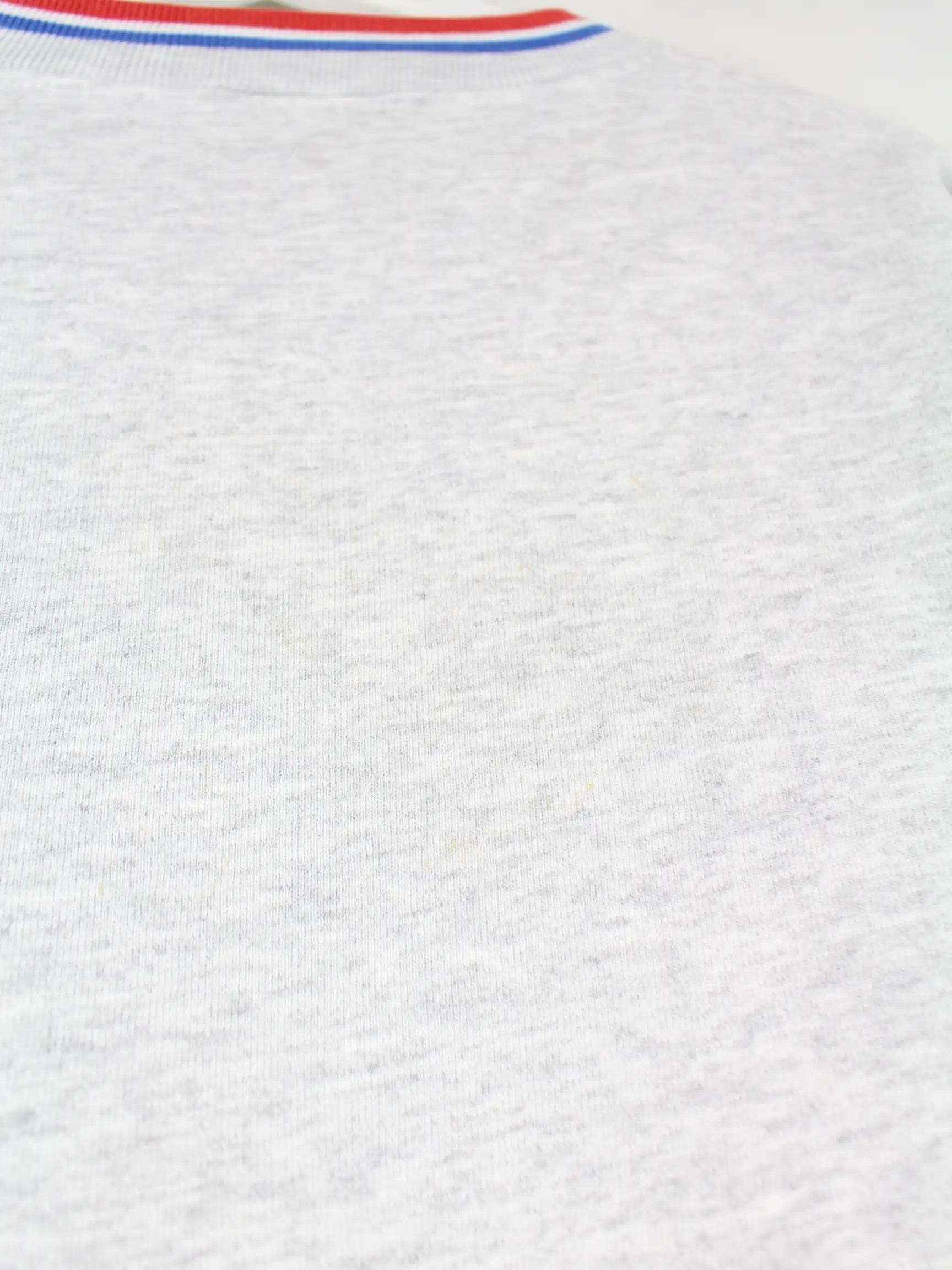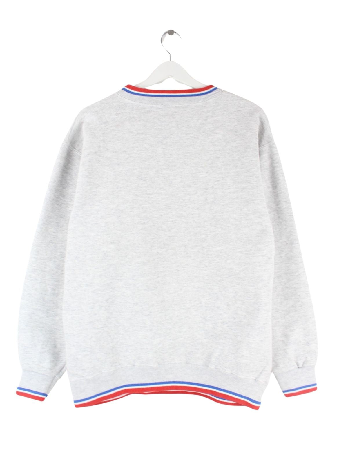 Vintage Sweater mit Stickereien in Größe L aus den 90'ern. Er ist aus einer Baumwollmischung gemacht und in Grau im Bestand.