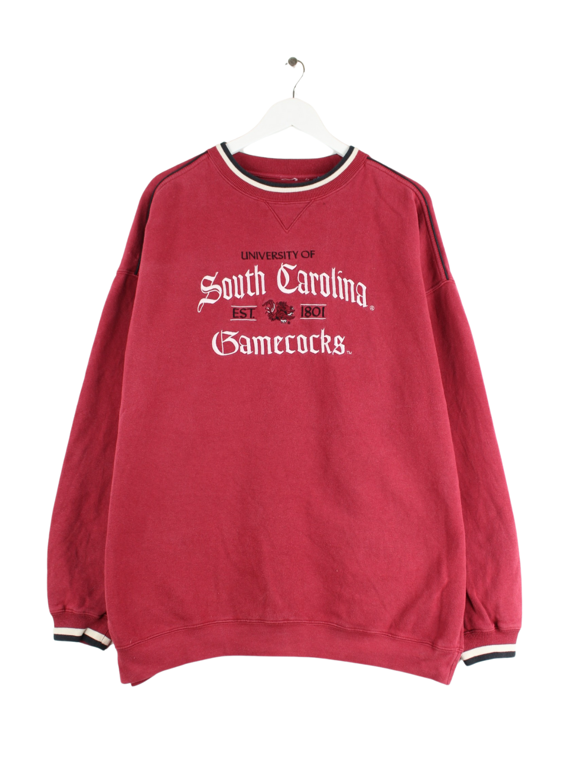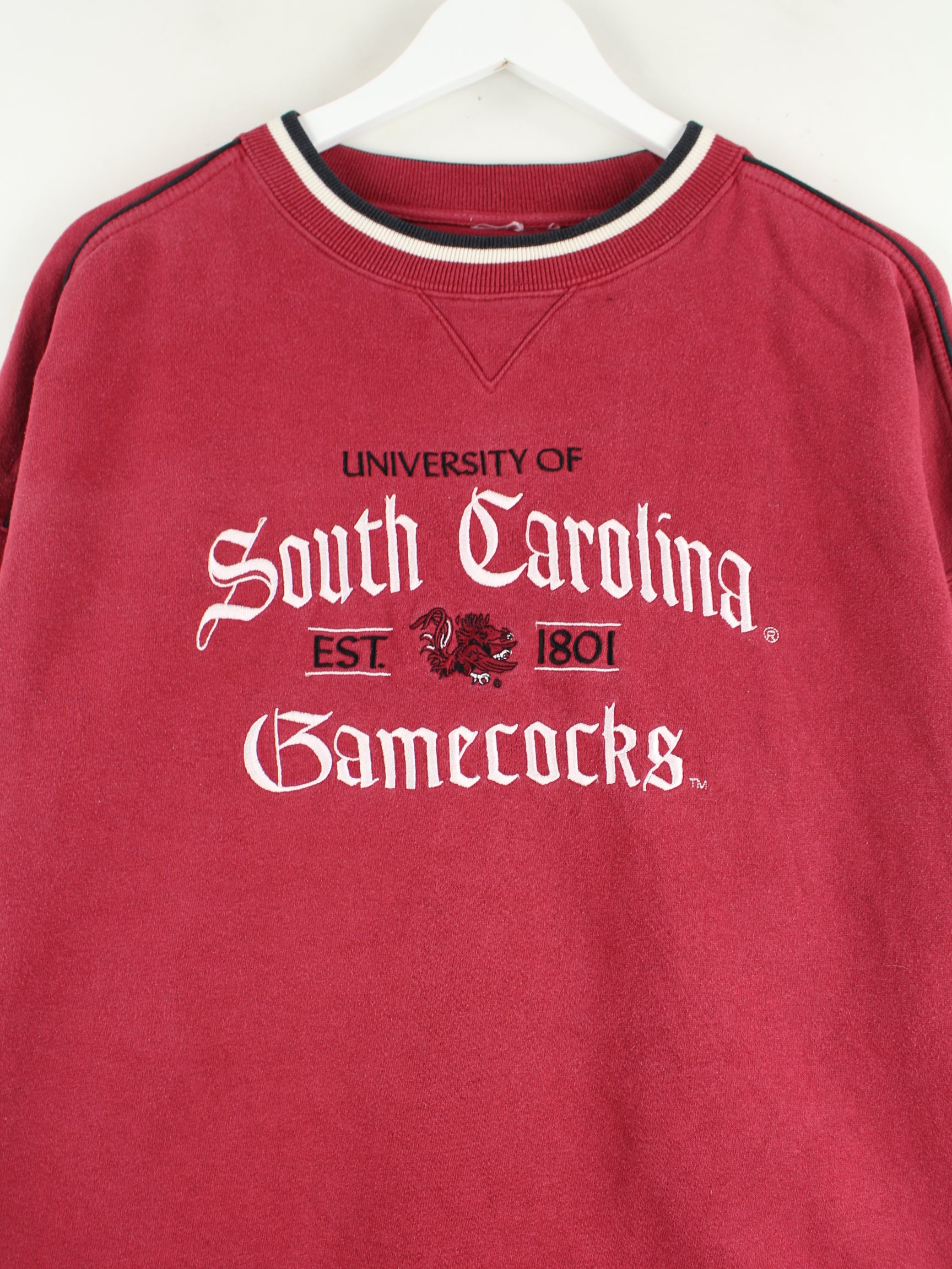 Vintage Sweater mit gestickten South Carolina Gamecocks Motiven in Größe XL aus den 90'ern. Er ist aus einer Baumwollmischung hergestellt und in Rot lieferbar.