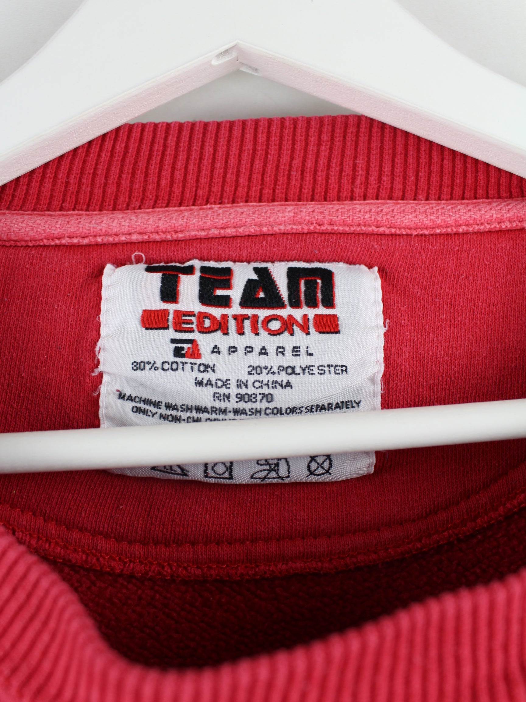 Vintage Sweater mit Stick in Größe L aus den 90'ern. Er ist aus einer Baumwollmischung hergestellt und in Rot auf Lager.