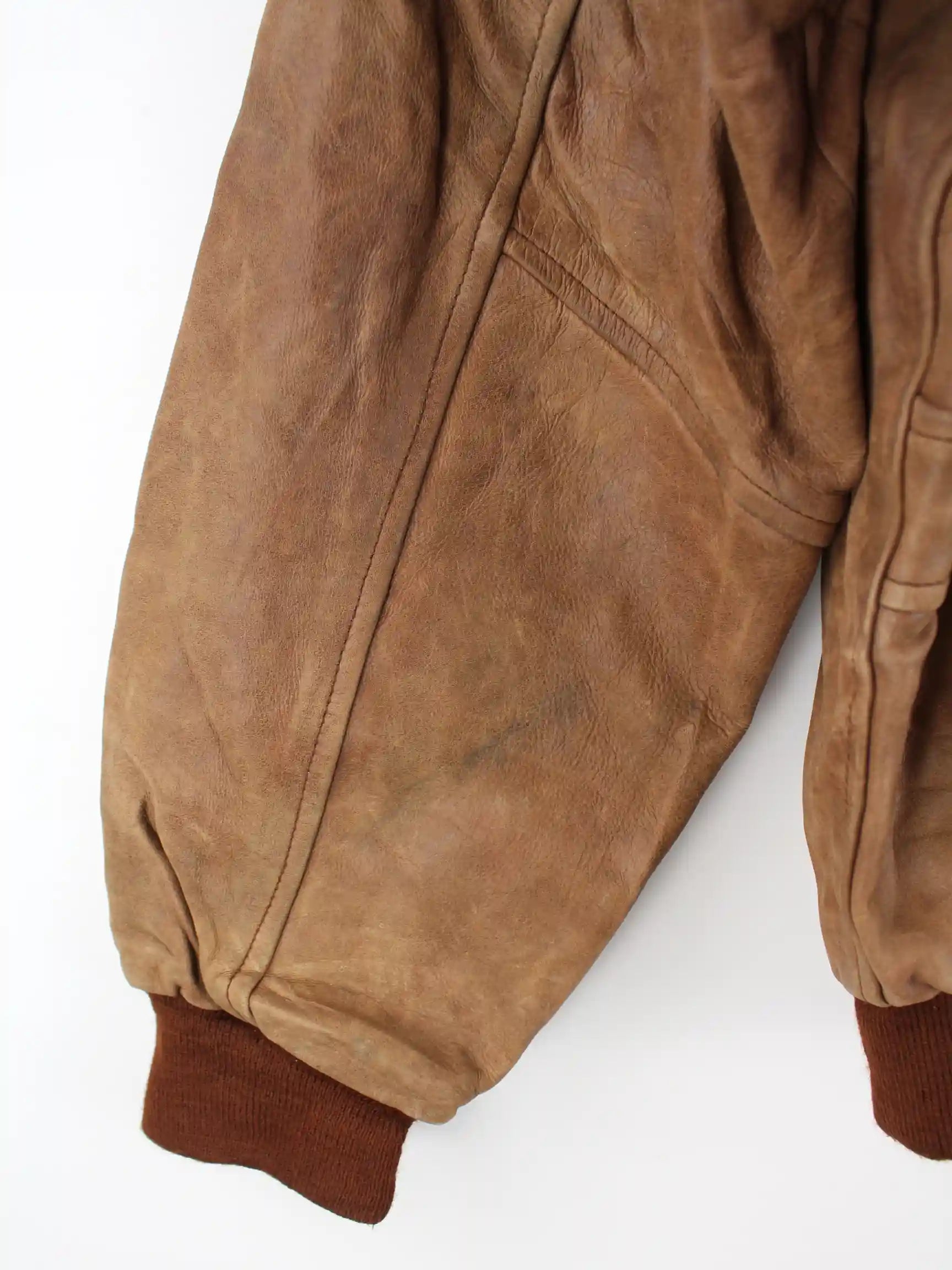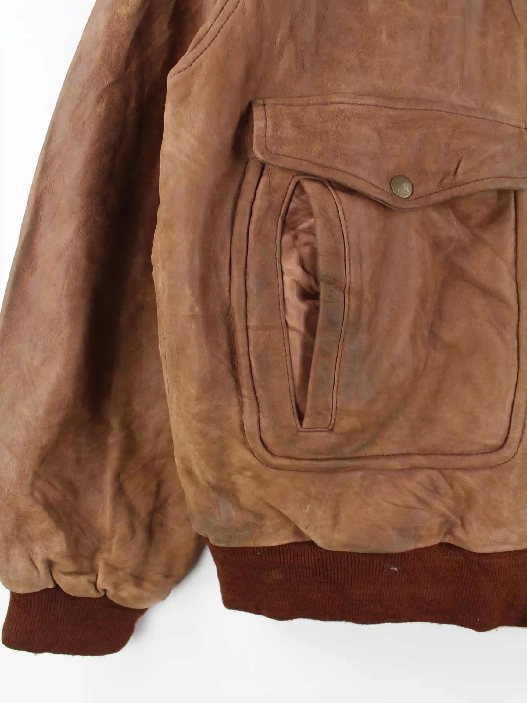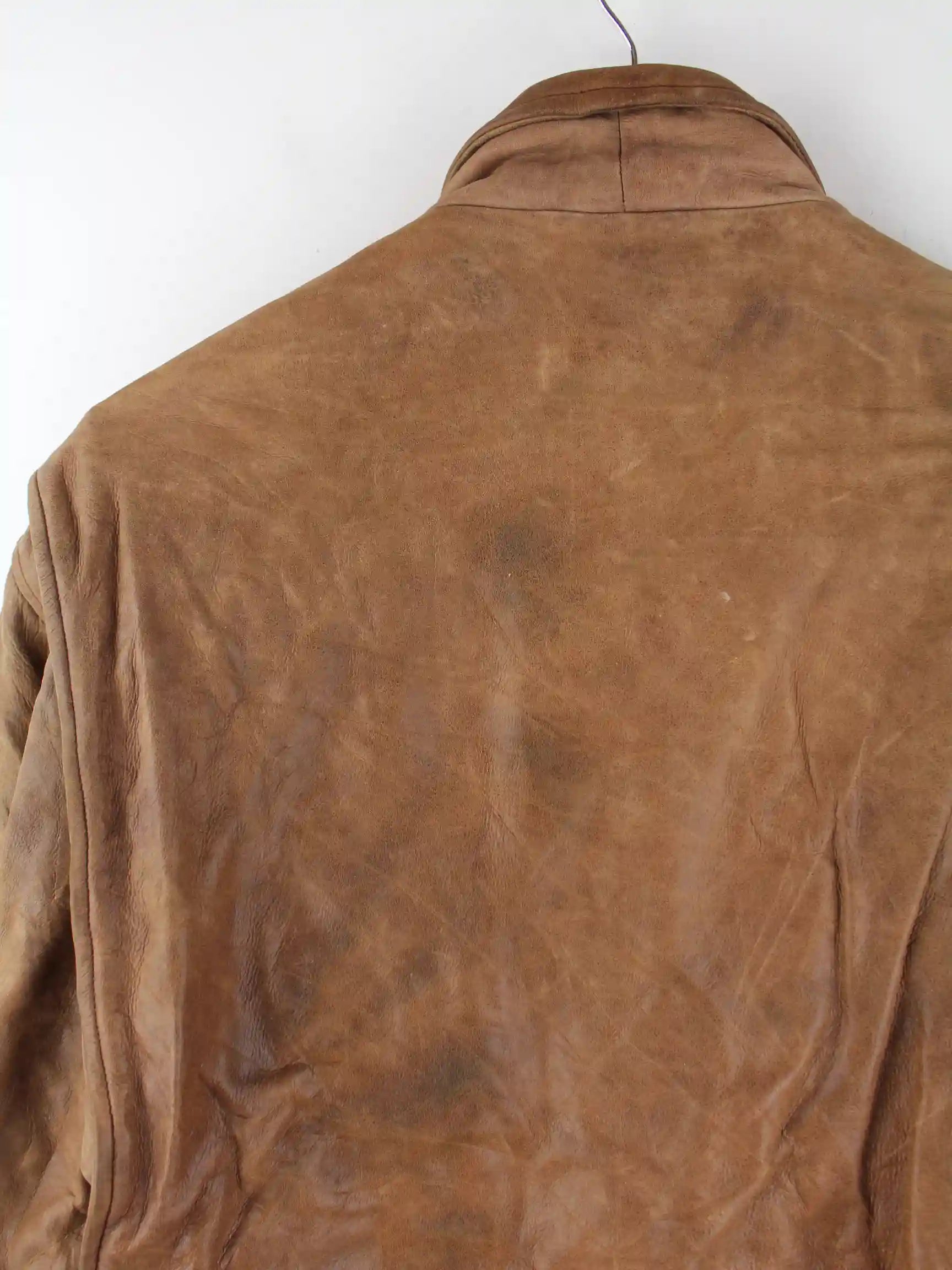 Vintage Jacke in Größe XL aus den 90'ern. Sie ist aus Leder und in Braun bei uns vorrätig.