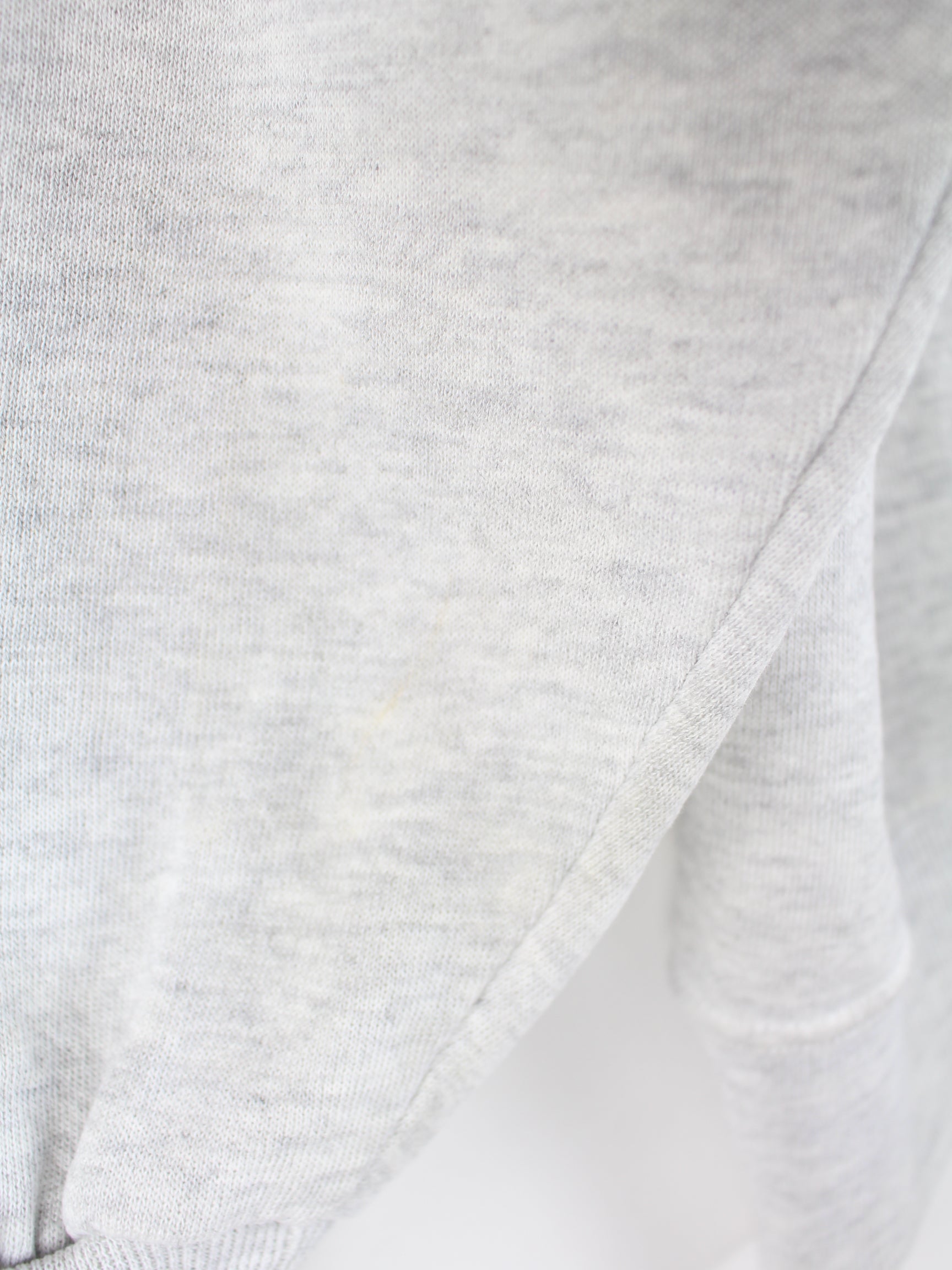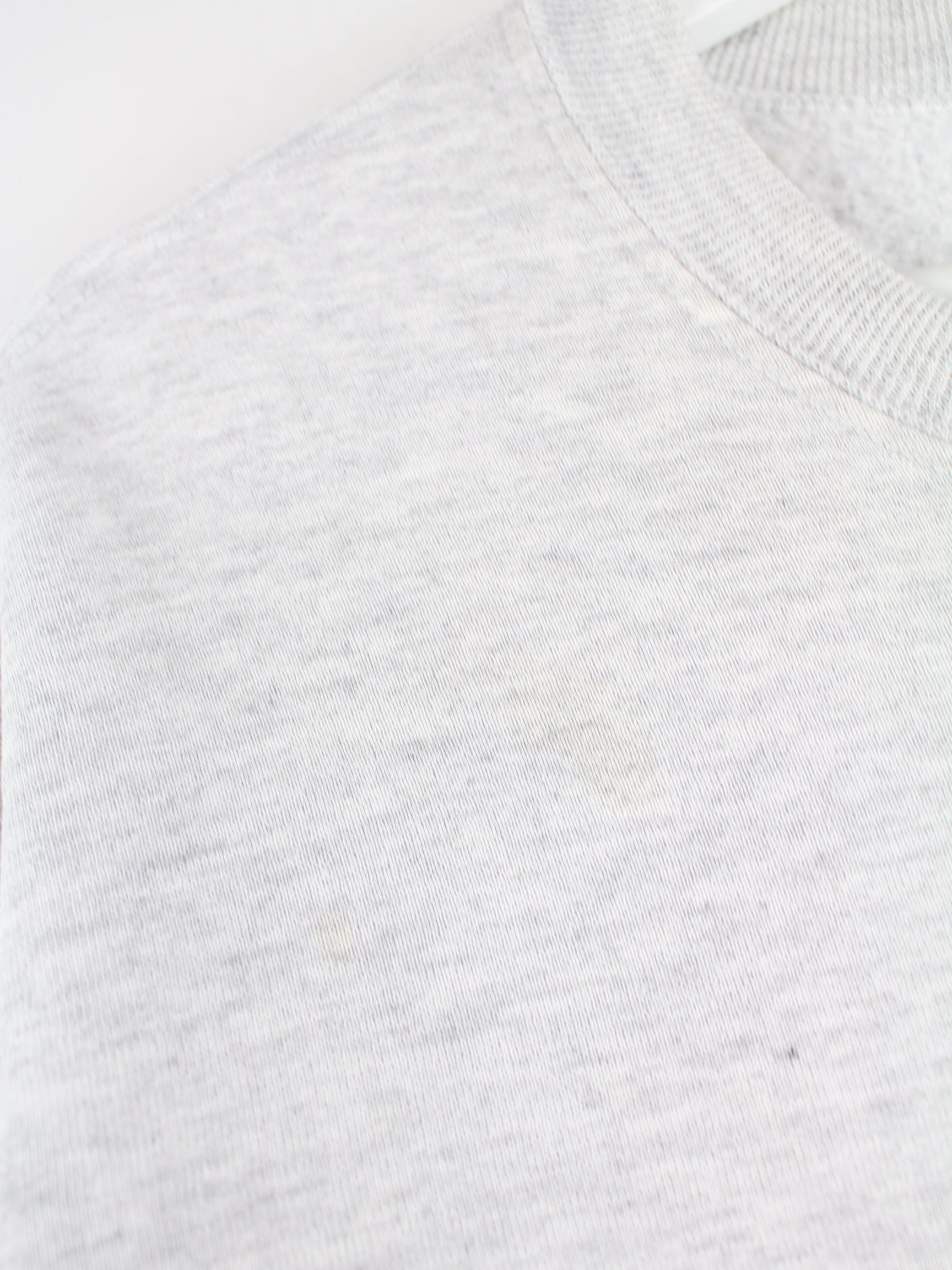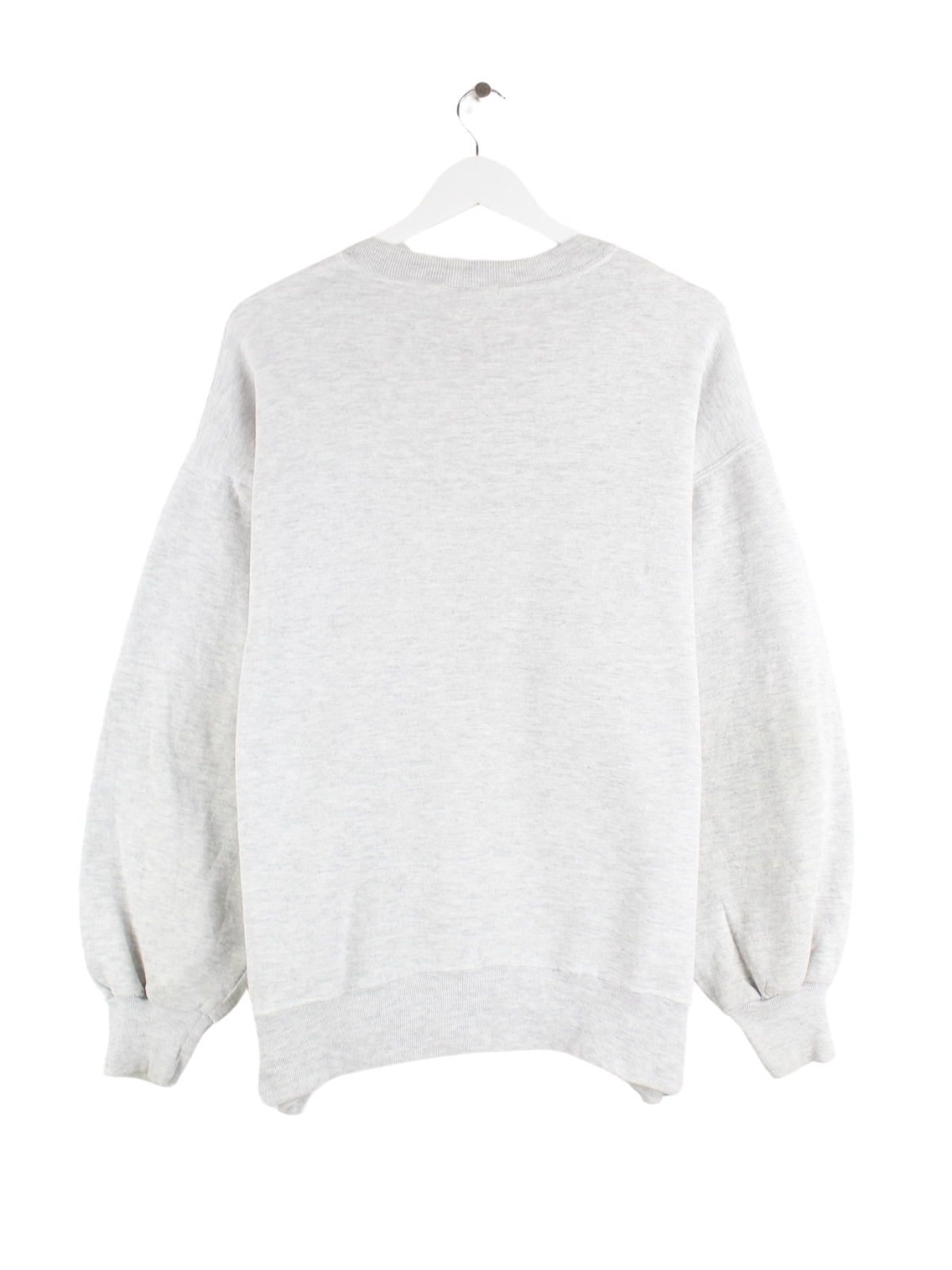 Vintage Sweater mit gestickten Motiven in Größe L aus den 90'ern. Er ist aus einer Baumwollmischung und in Grau in Stock.