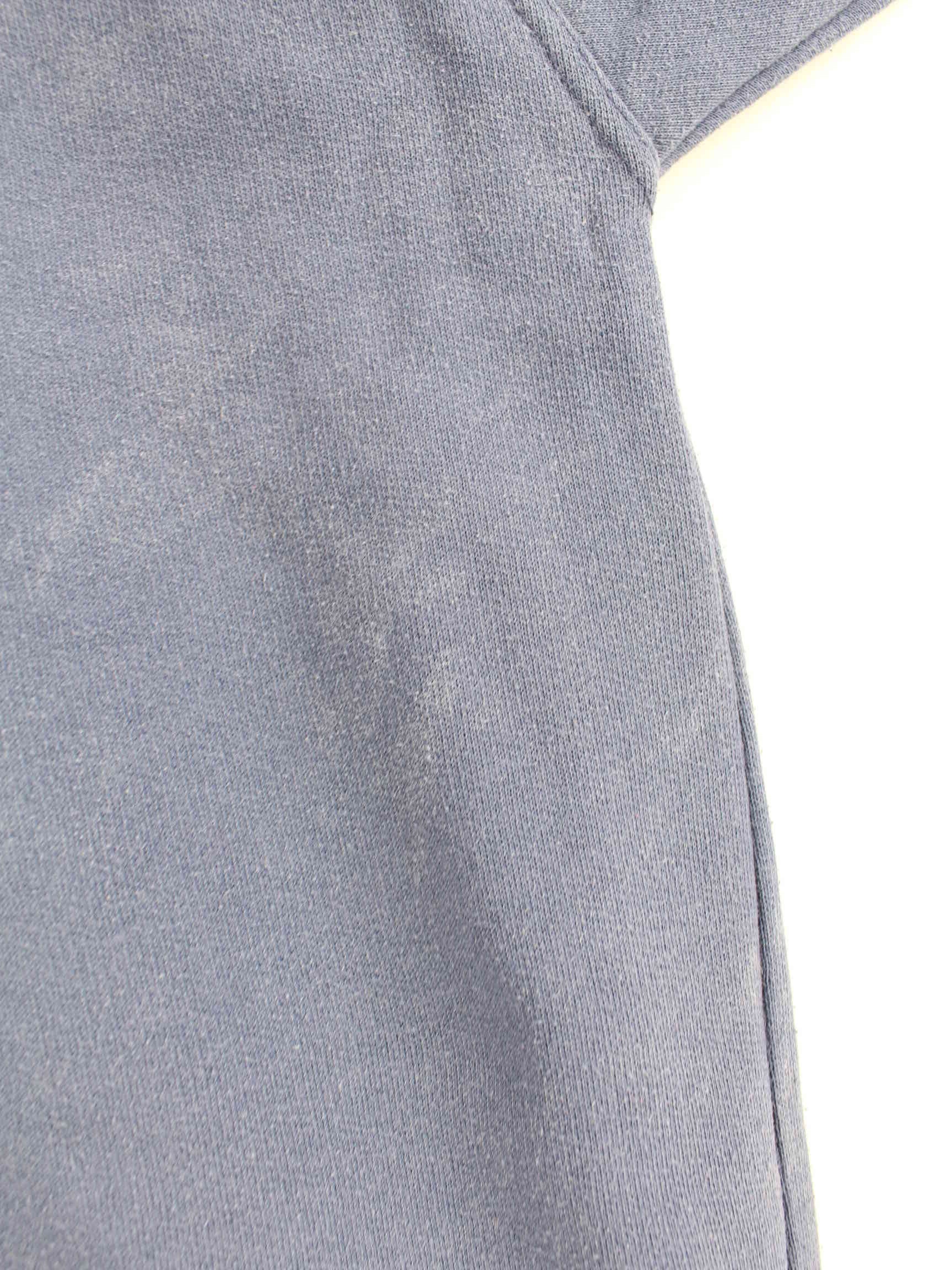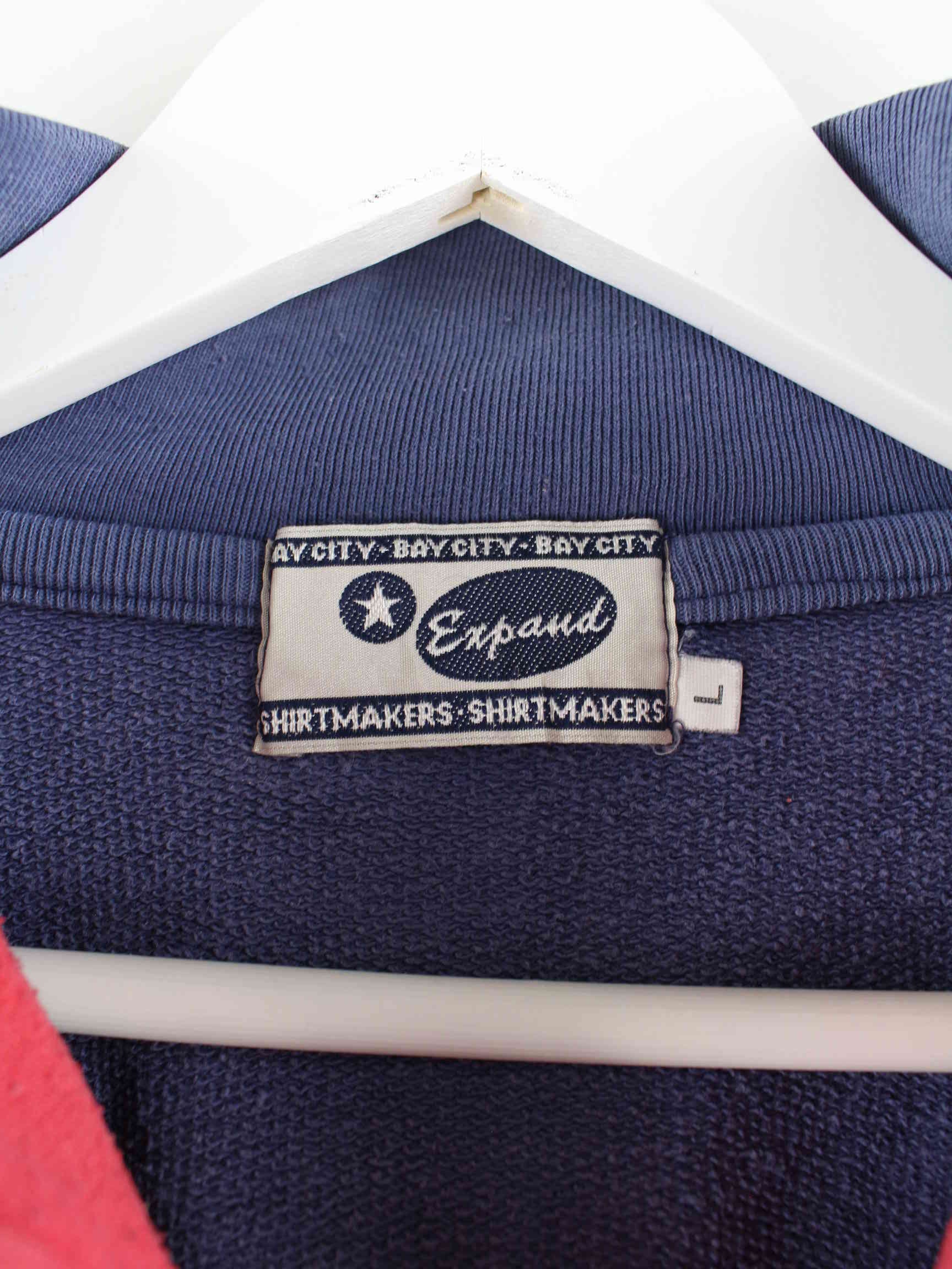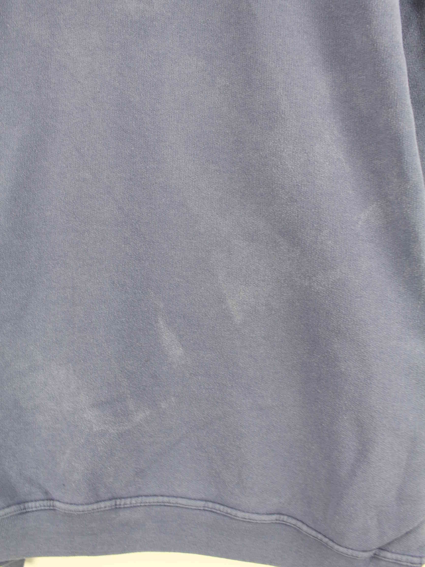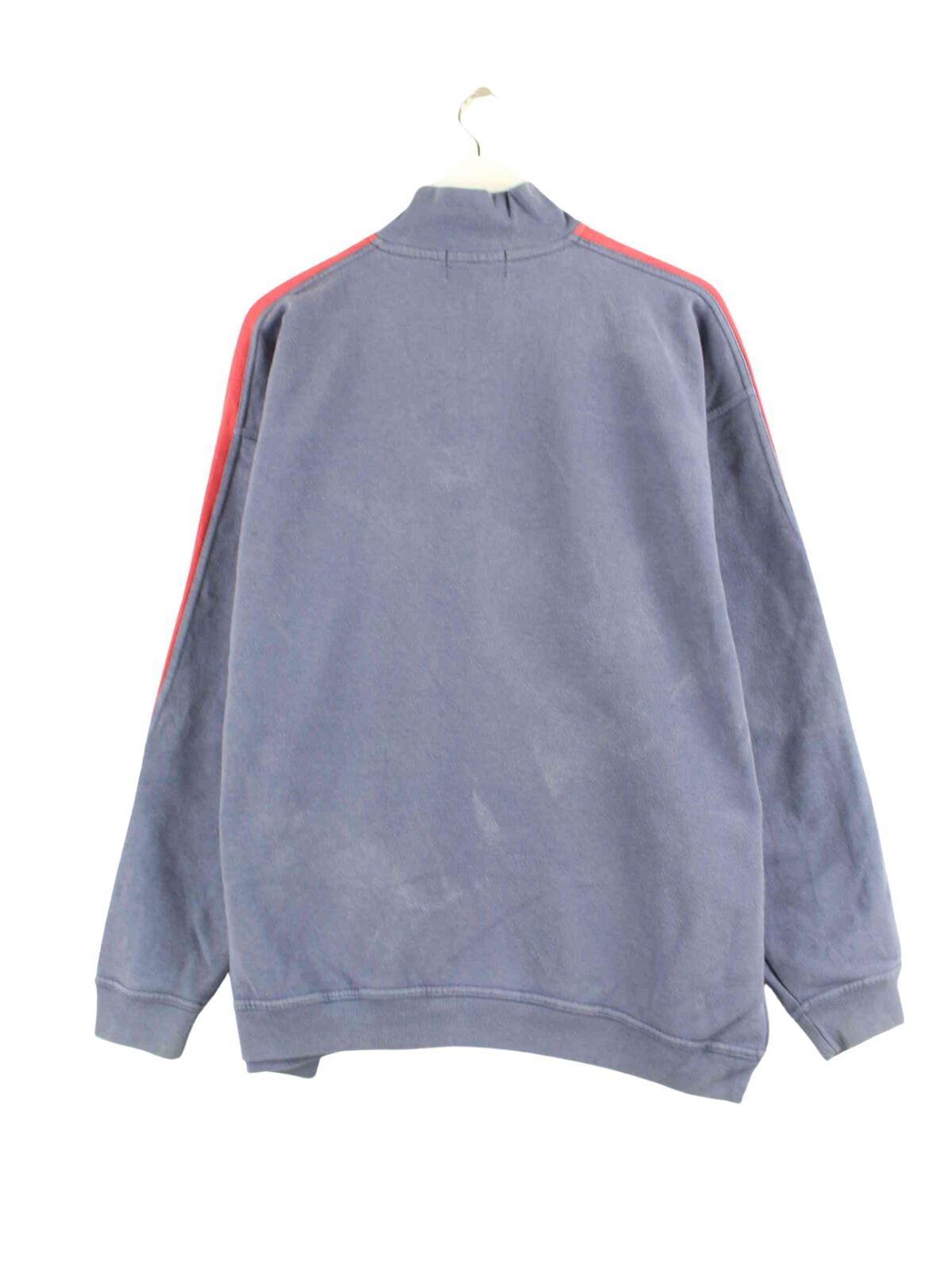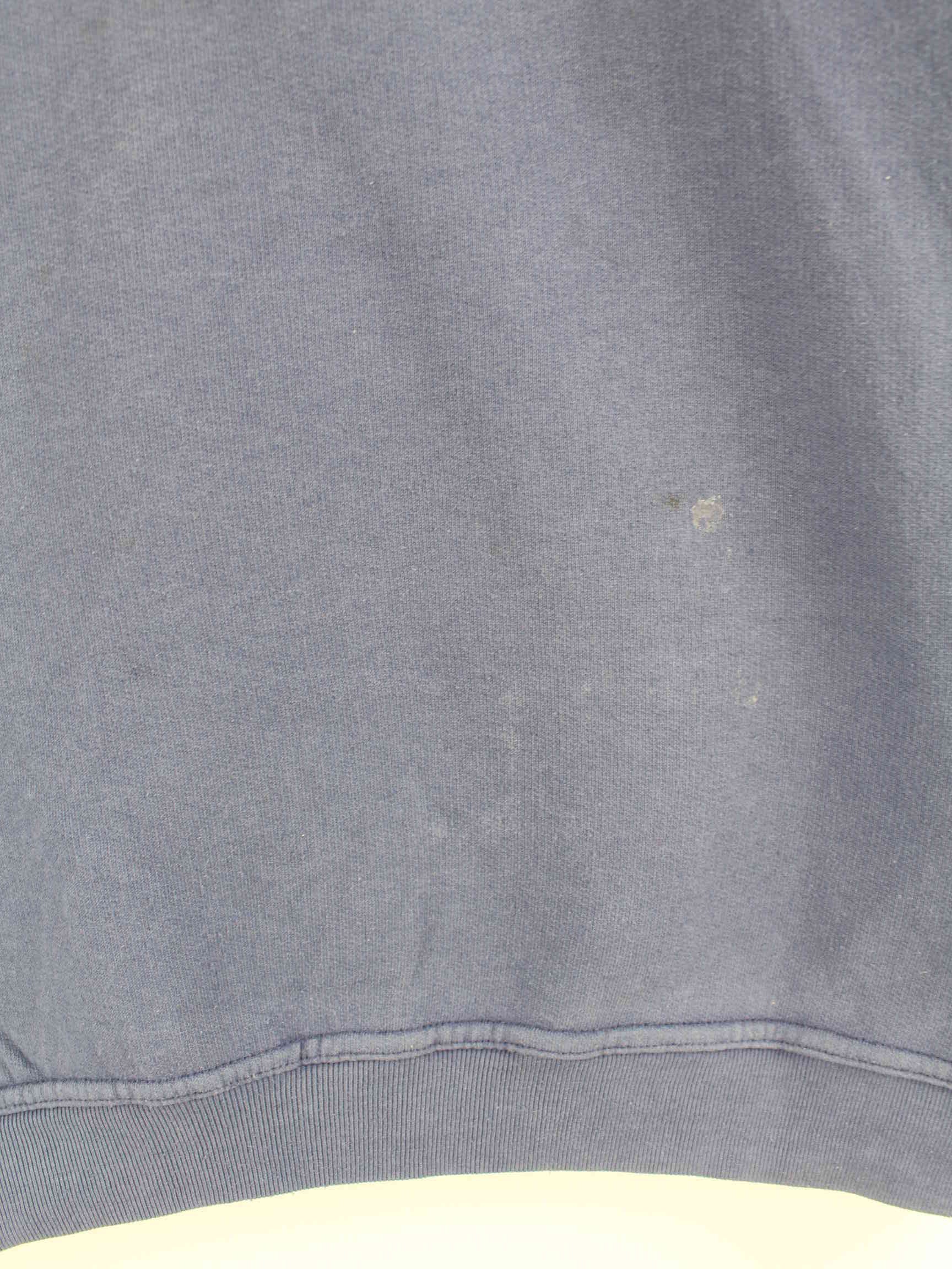 Vintage Sweater mit kurzem Reißverschluß in Größe L aus den 90'ern. Er ist aus einer Baumwollmischung gemacht und in Blau zu haben.