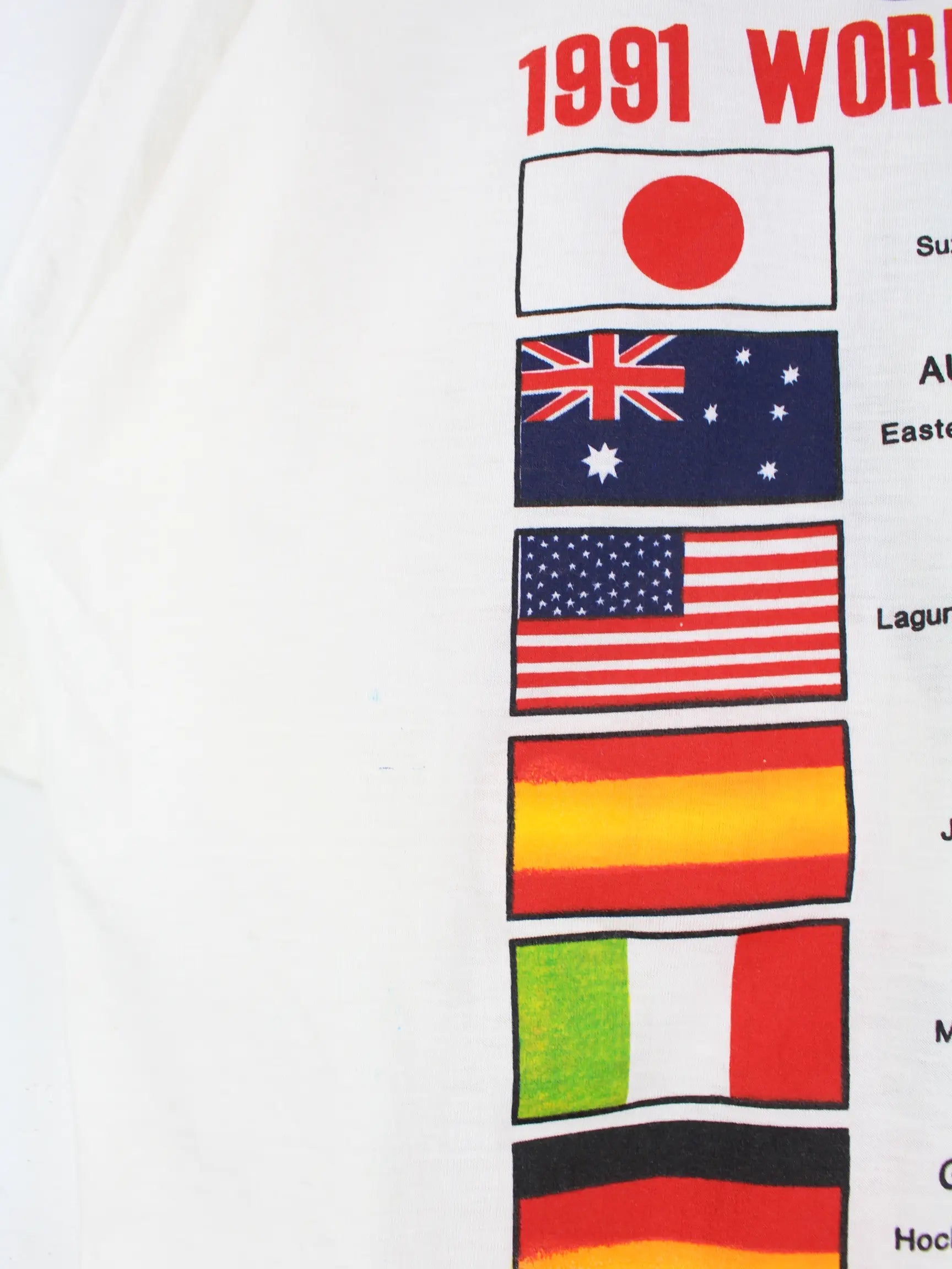 Weißes Vintage T-Shirt aus den 90'ern in Größe L. Es ist aus Baumwolle produziert. Den Zustand würden wir als 'In Ordnung' bezeichnen (vergl. Bilder).Mit schickem Racing Print.