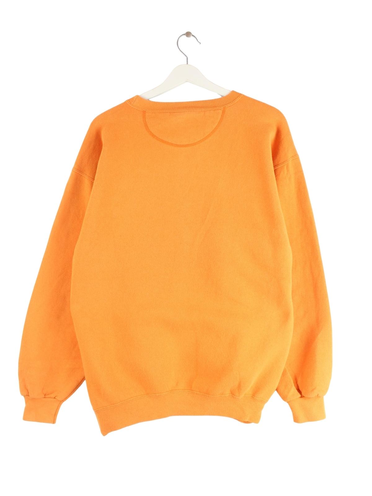 Orangefarbener Vintage Sweater aus den 90'ern in Größe M. Er ist aus einer Baumwollmischung gemacht und in gutem Zustand lieferbar.