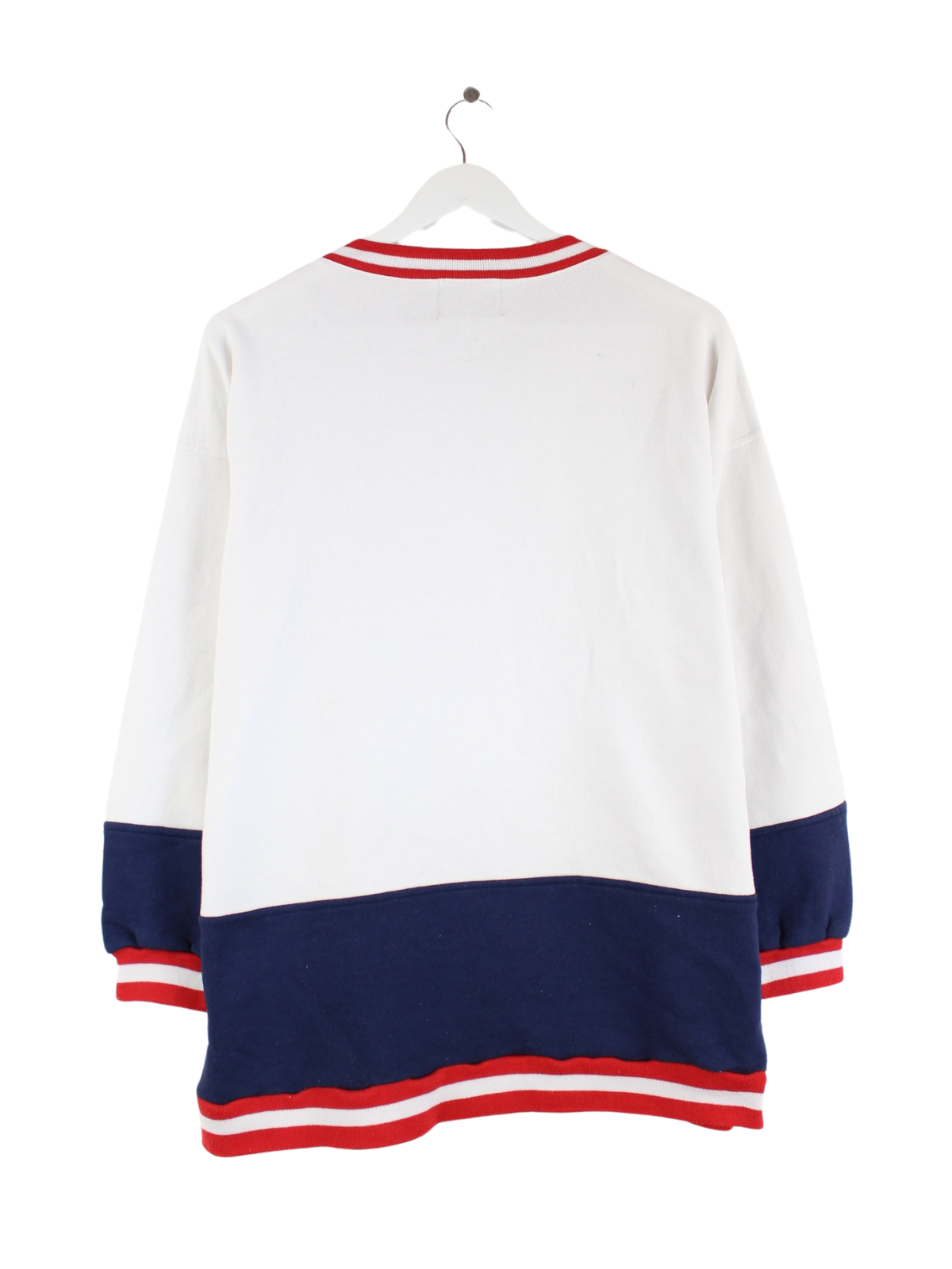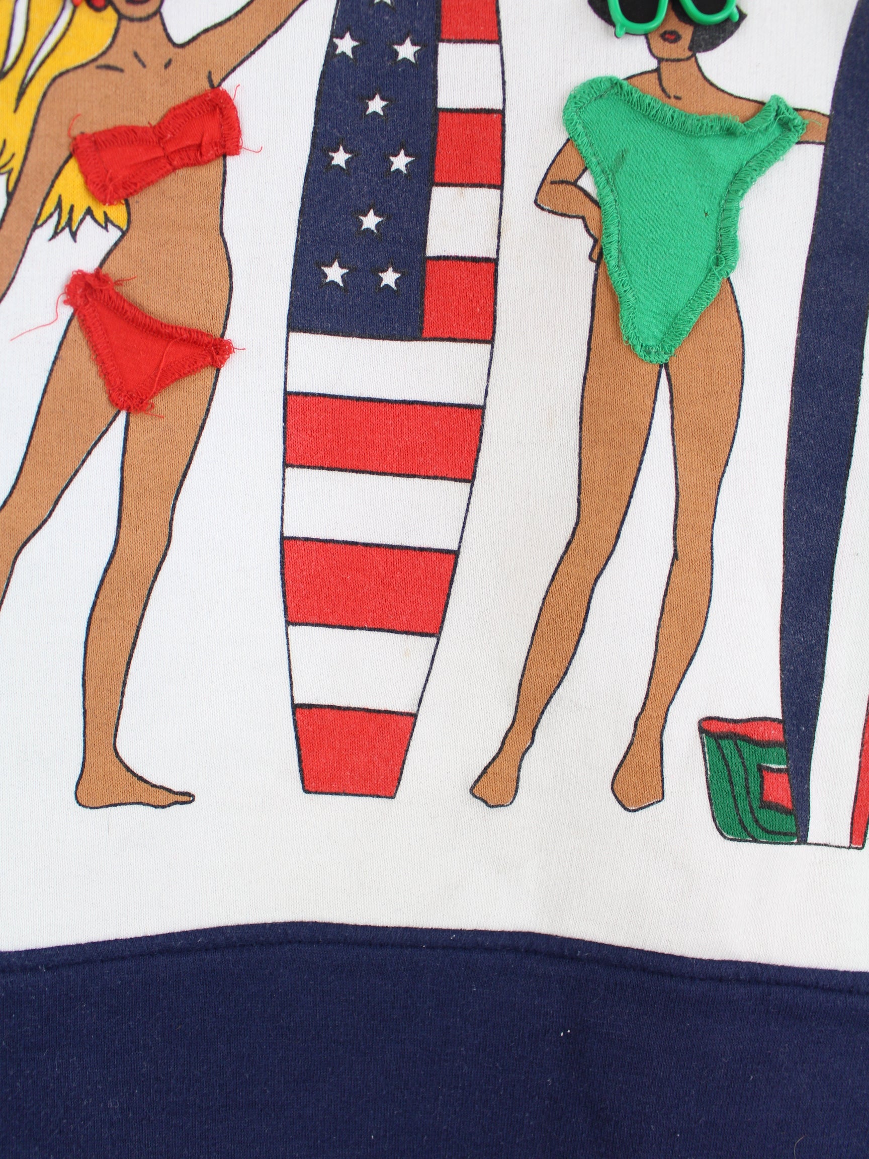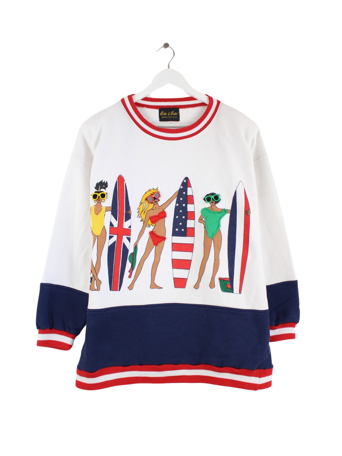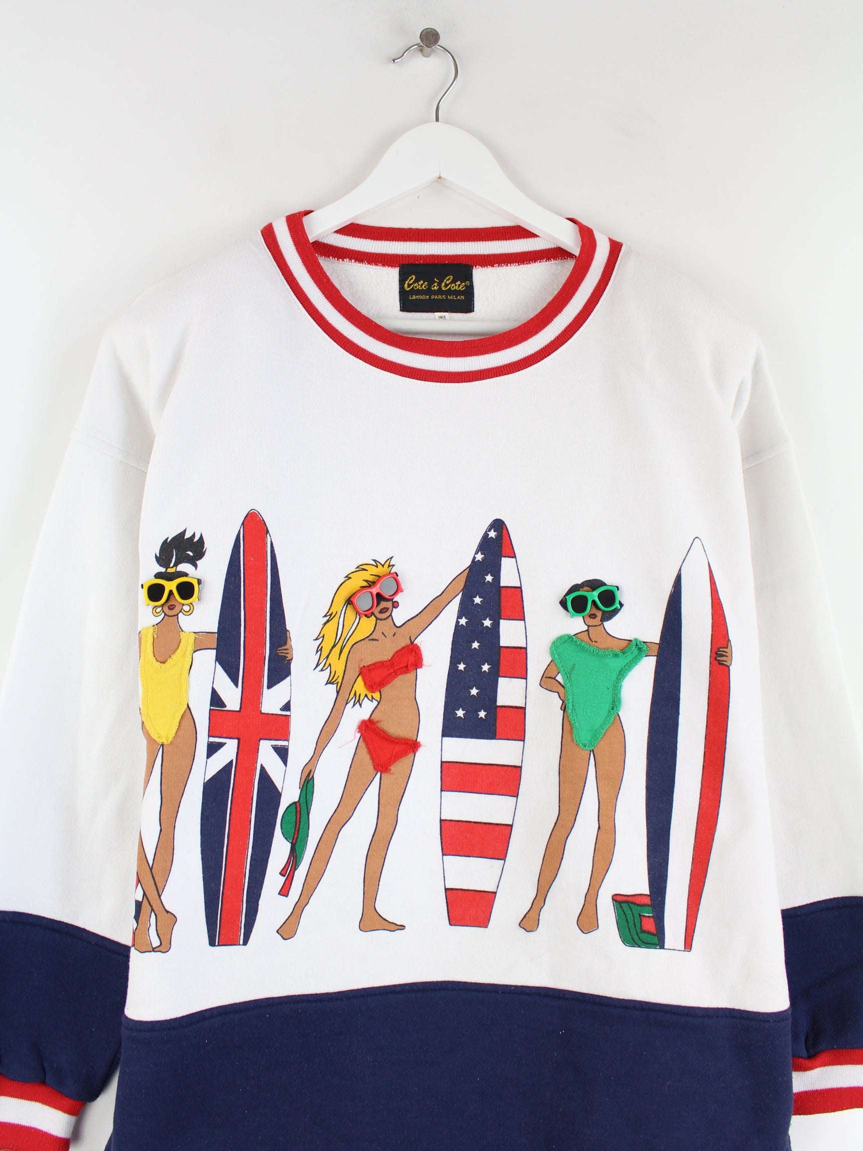 Vintage Sweater in Größe XL aus den 90'ern. Er ist aus einer Baumwollmischung und in Weiß vorrätig. Mit schickem Beach Print.