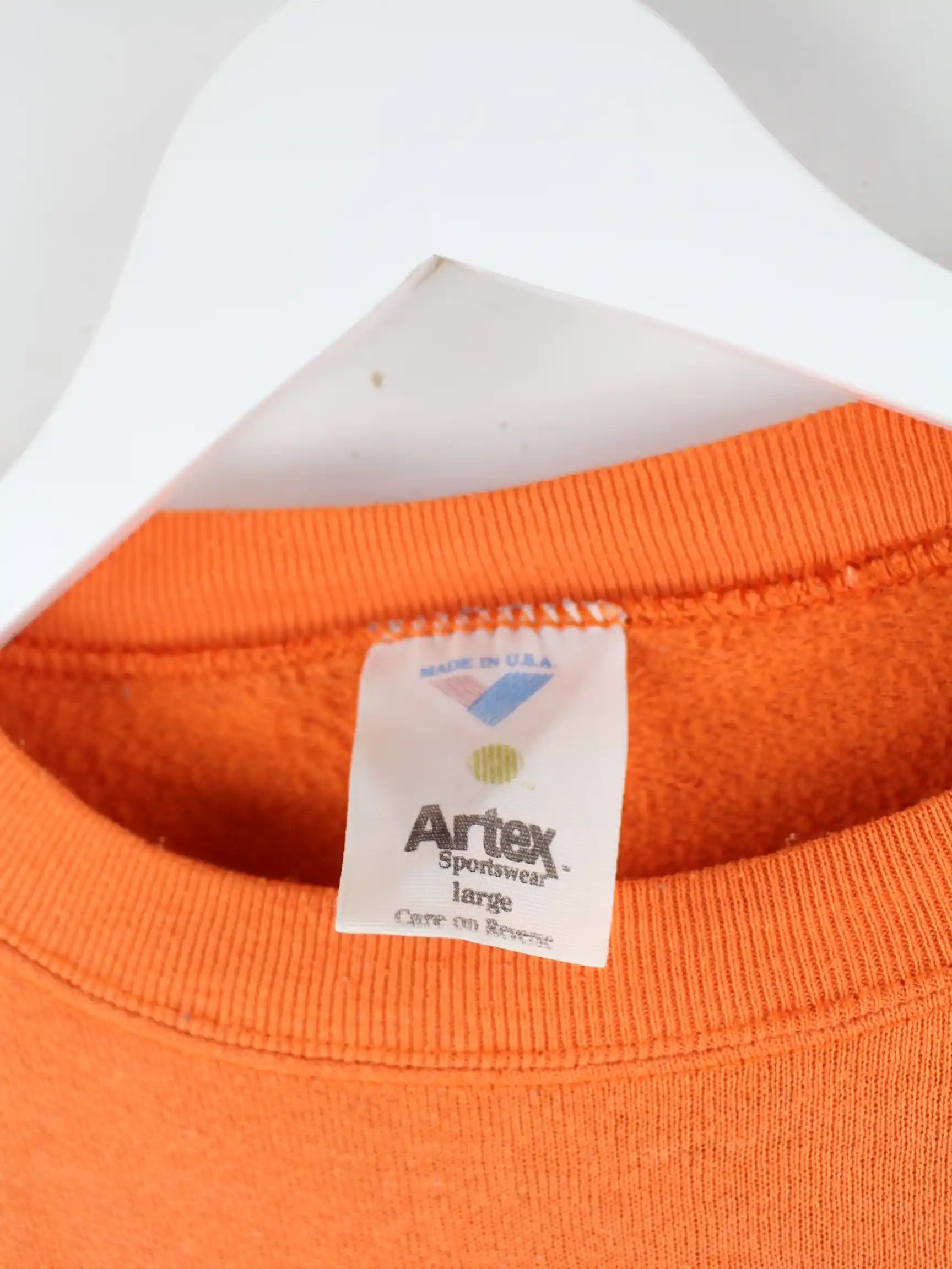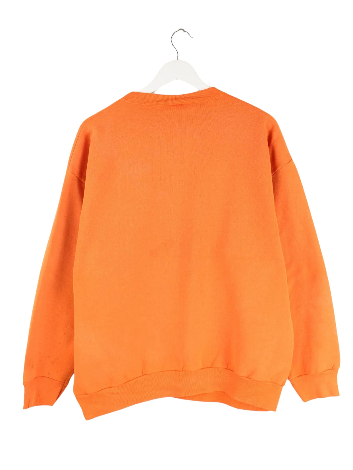 Vintage Sweater in Größe L aus den 90'ern. Er ist aus einer Baumwollmischung und in Orange zu bekommen. Mit tollem Browns Print.