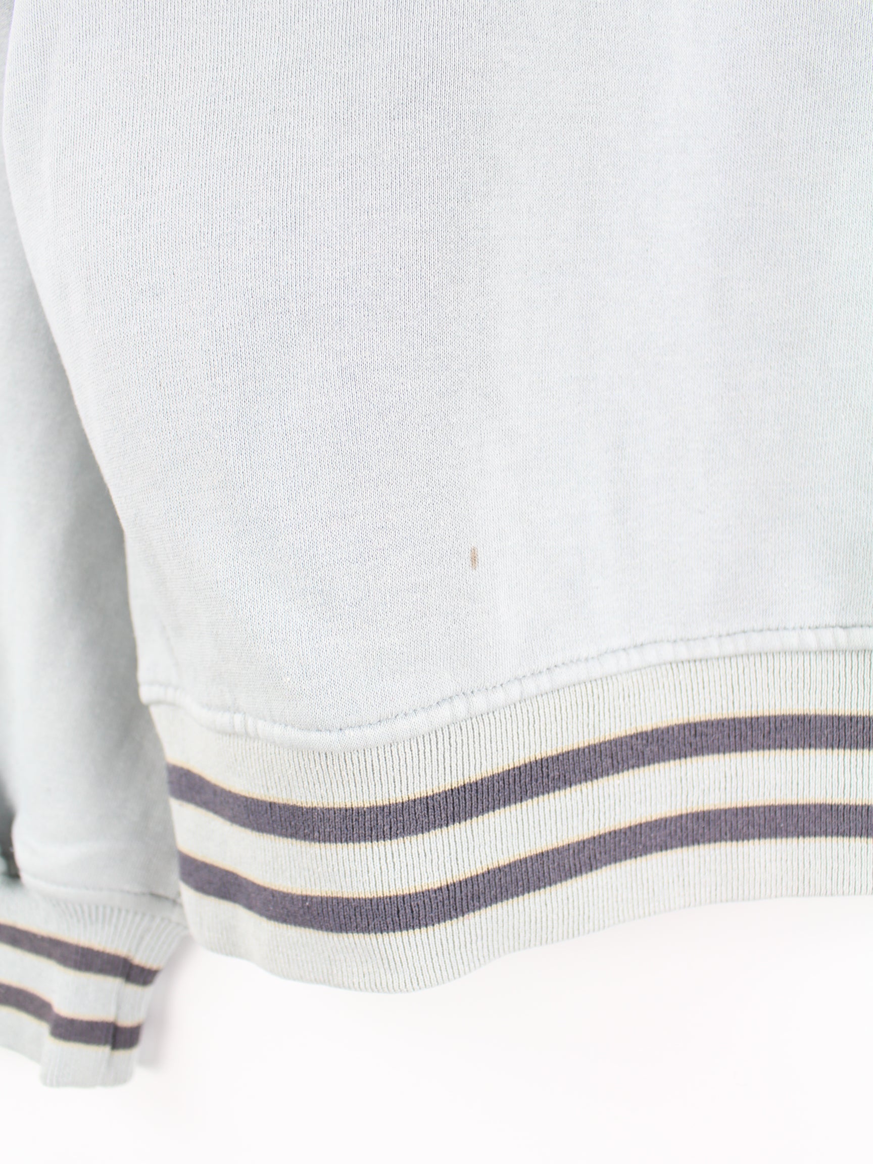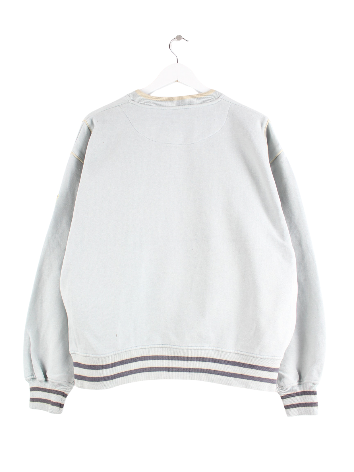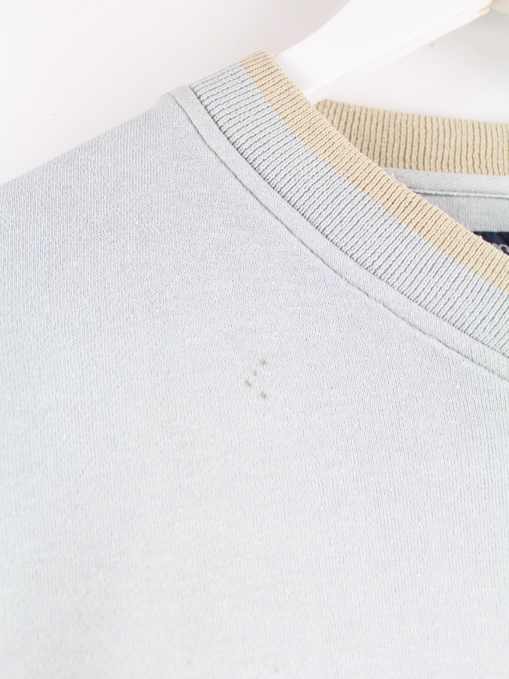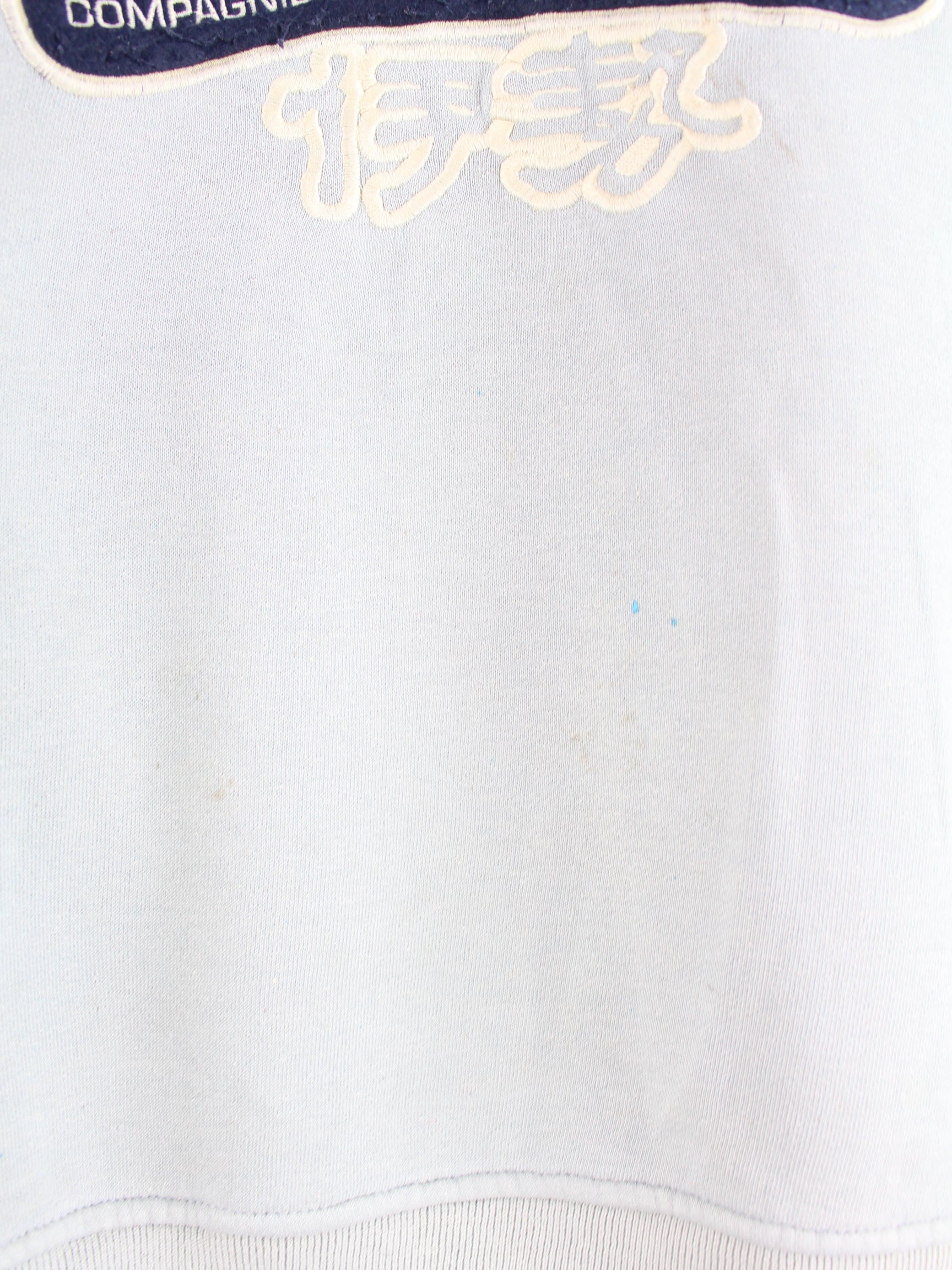 Blauer Vintage Sweater mit gesticktem Logo aus den 90'ern in Größe L. Er ist aus einer Baumwollmischung . Den Zustand würden wir als 'In Ordnung' bezeichnen (vergl. Bilder).