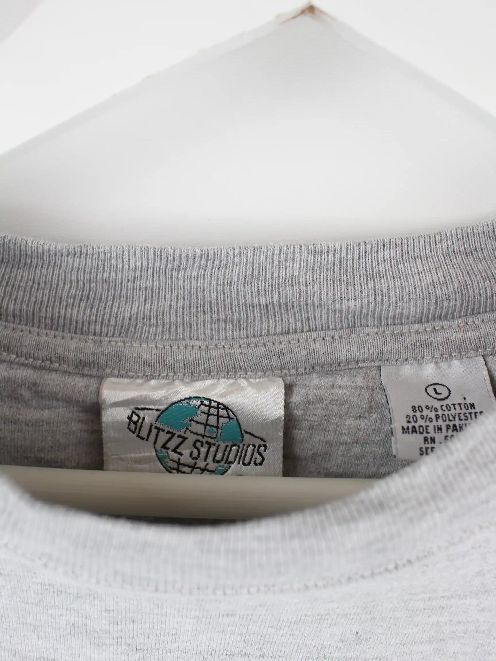 Grauer Vintage Sweater aus den 90'ern in Größe L. Er ist aus einer Baumwollmischung produziert. Den Zustand würden wir als 'In Ordnung' bezeichnen (vergl. Bilder).