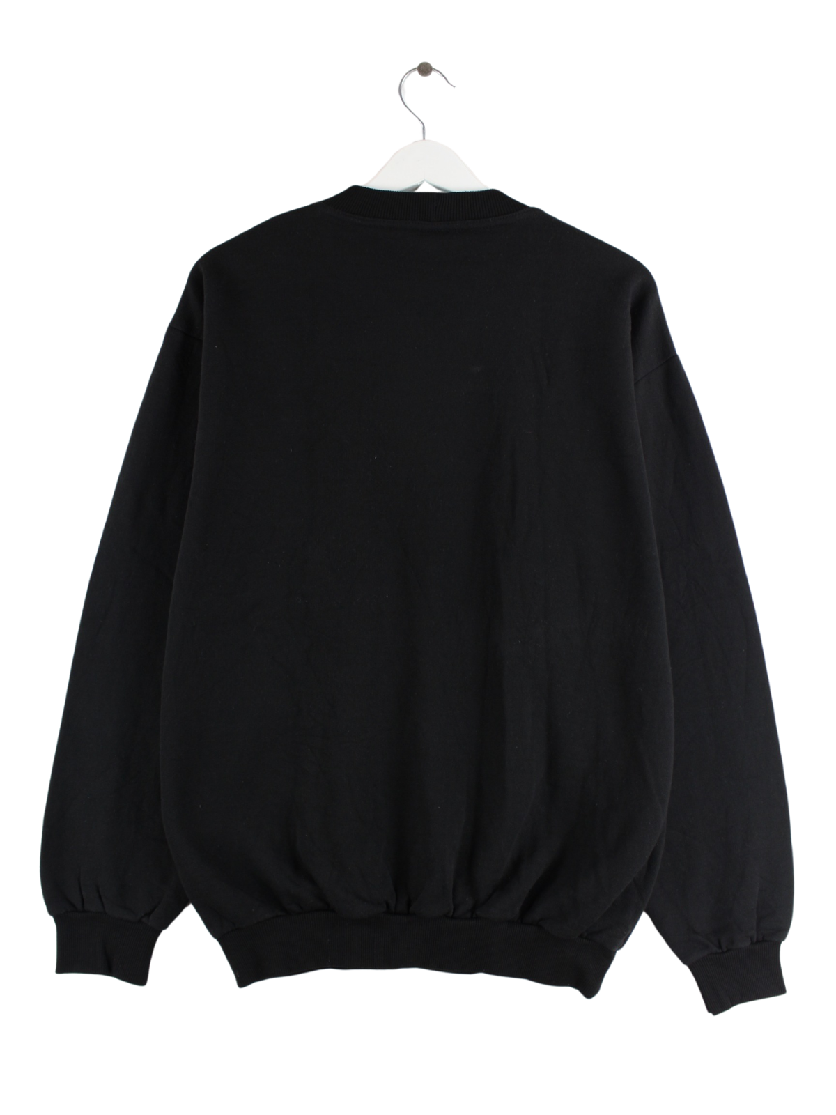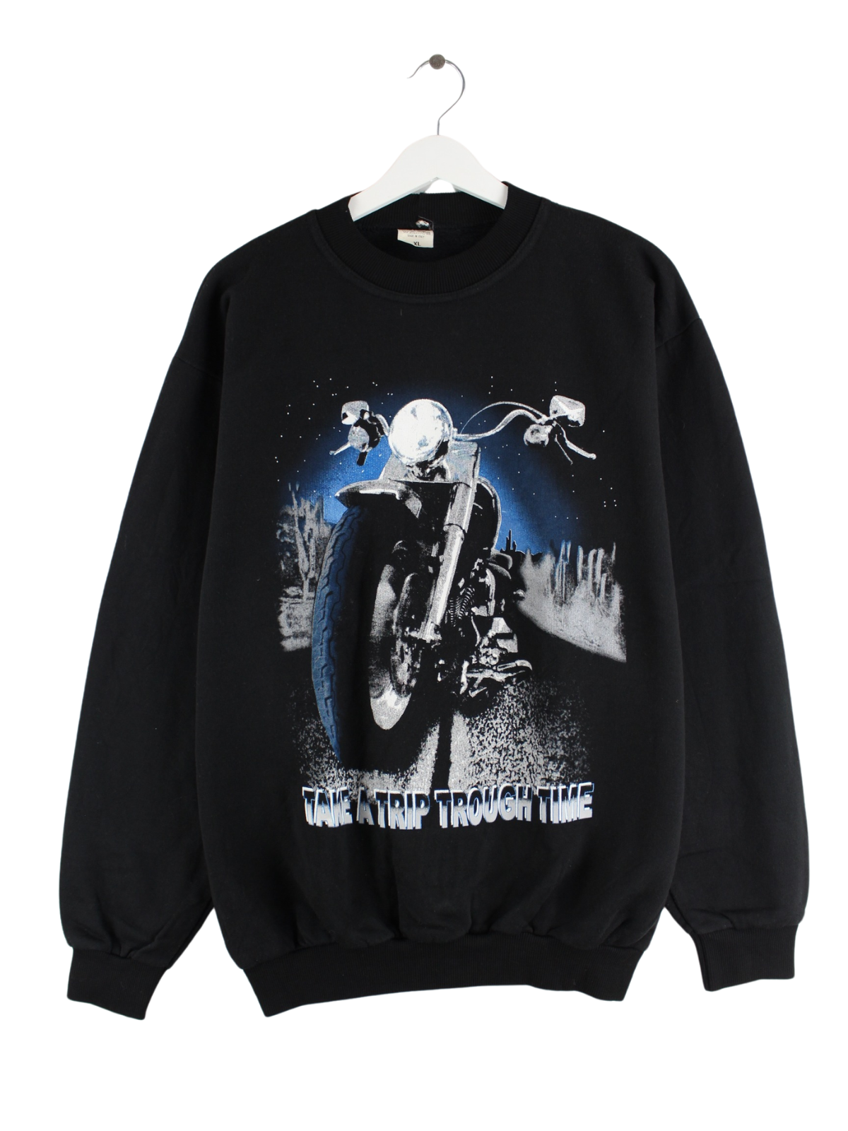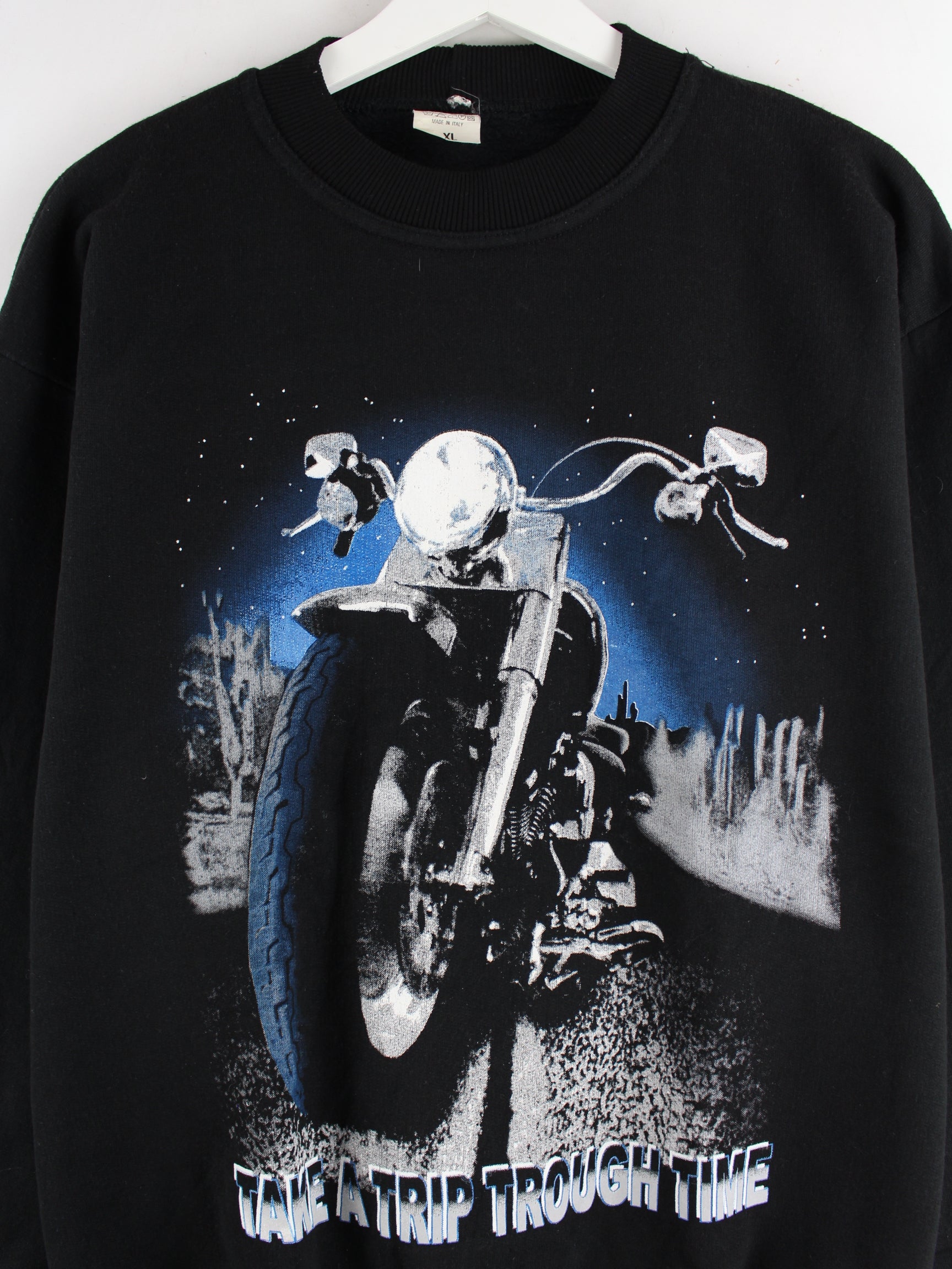 Vintage Sweater in Größe XL aus den 90'ern. Er ist aus einer Baumwollmischung und in Schwarz im Bestand. Mit schickem Motor-Bike Print.