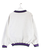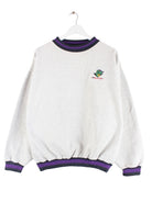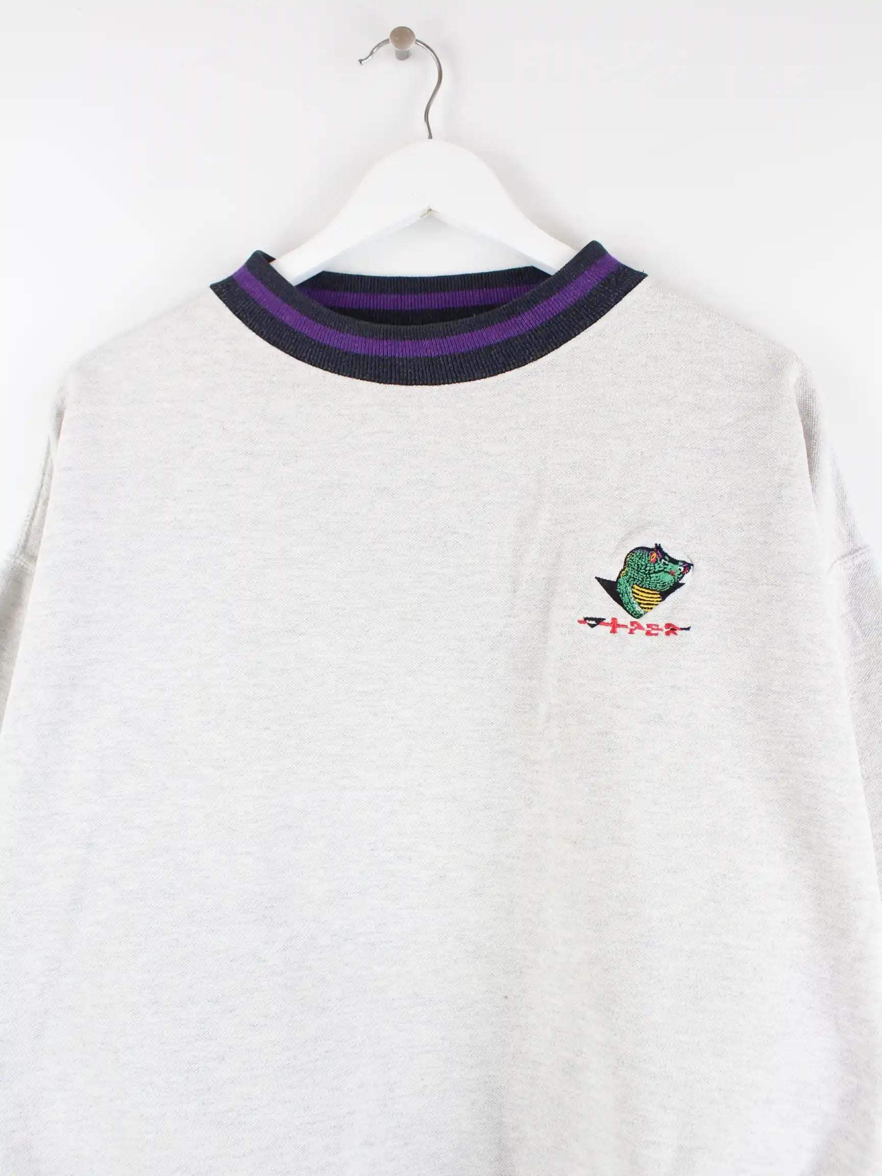Grauer Vintage Sweater aus den 90'ern in Größe L. Er ist aus einer Baumwollmischung produziert und in sehr gutem Zustand lieferbar.