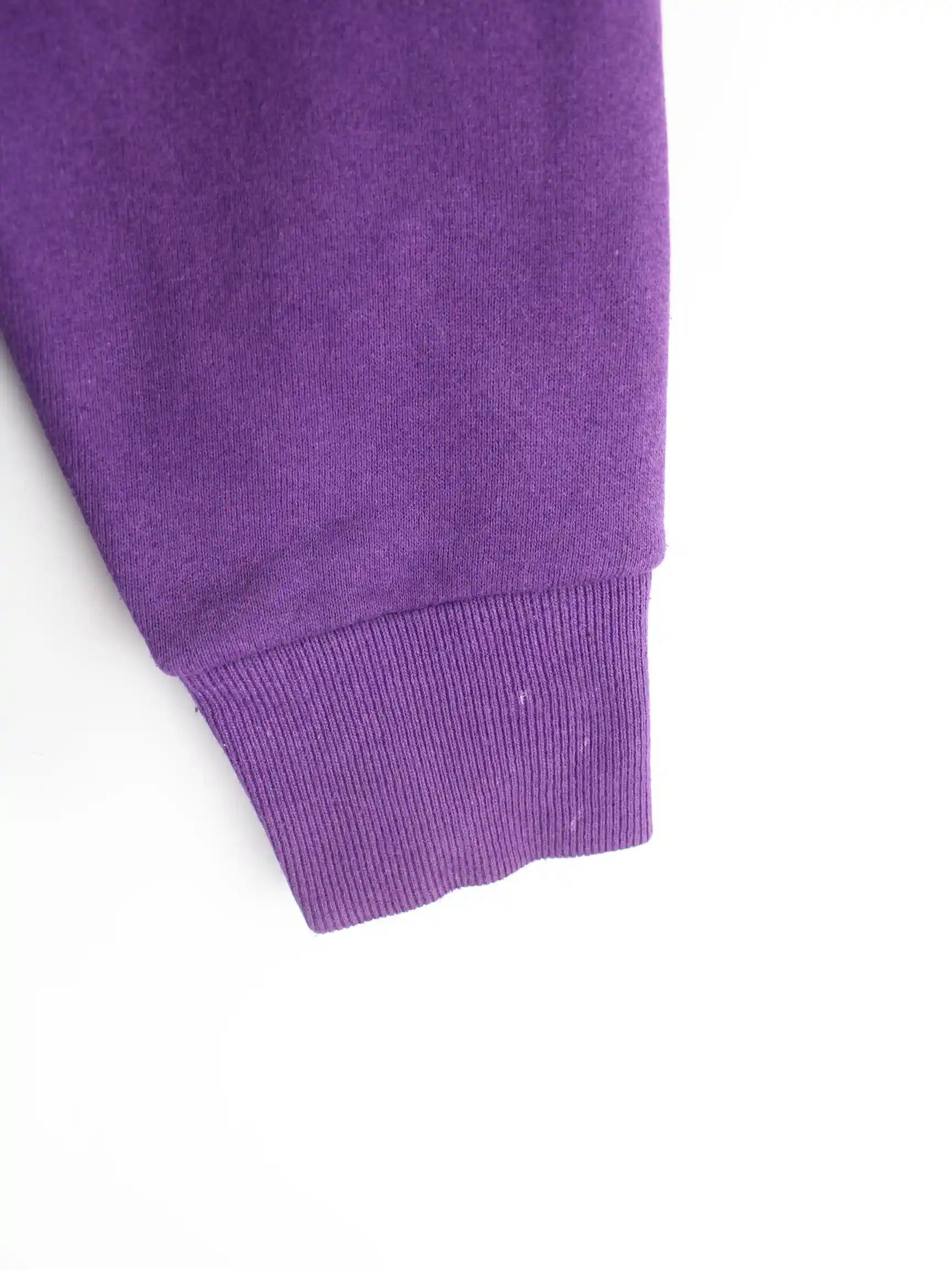 Vintage Sweater in Größe M aus den 90'ern. Er ist aus einer Baumwollmischung und in Lila lieferbar. Mit chiquem Washington Print.