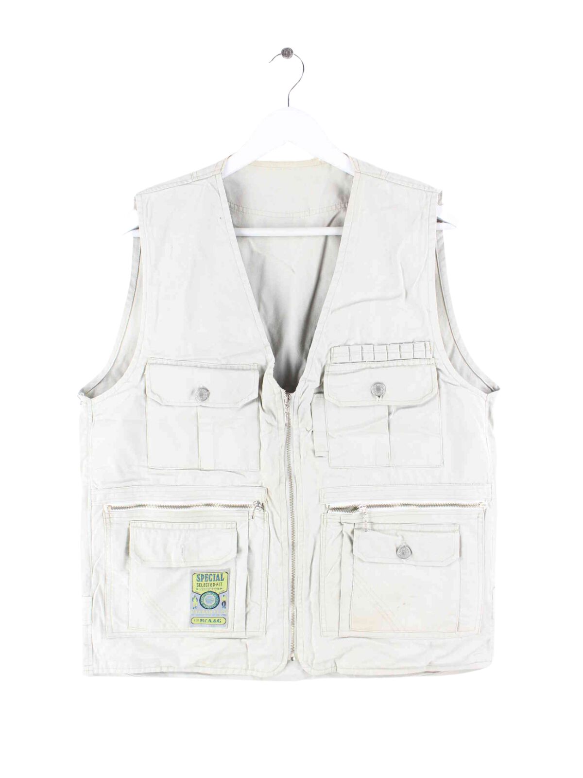 Beigefarbene Vintage Weste aus den 90'ern in Größe S. Sie ist aus einer Baumwollmischung produziert. Den Zustand würden wir als 'In Ordnung' bezeichnen (vergl. Bilder).