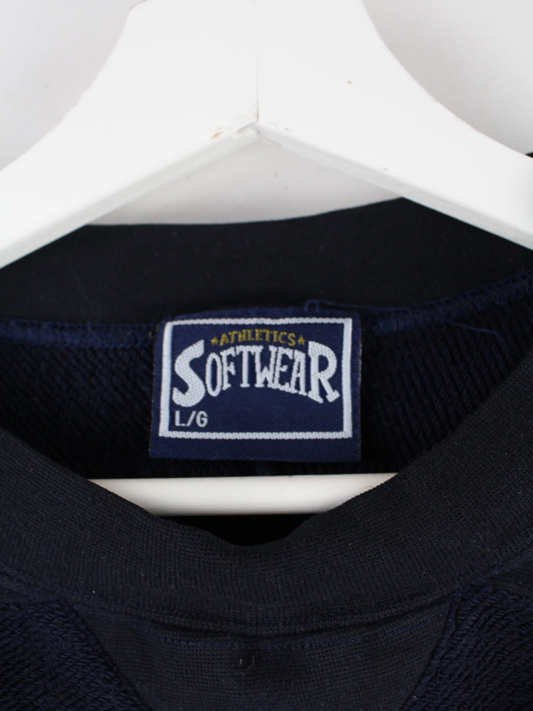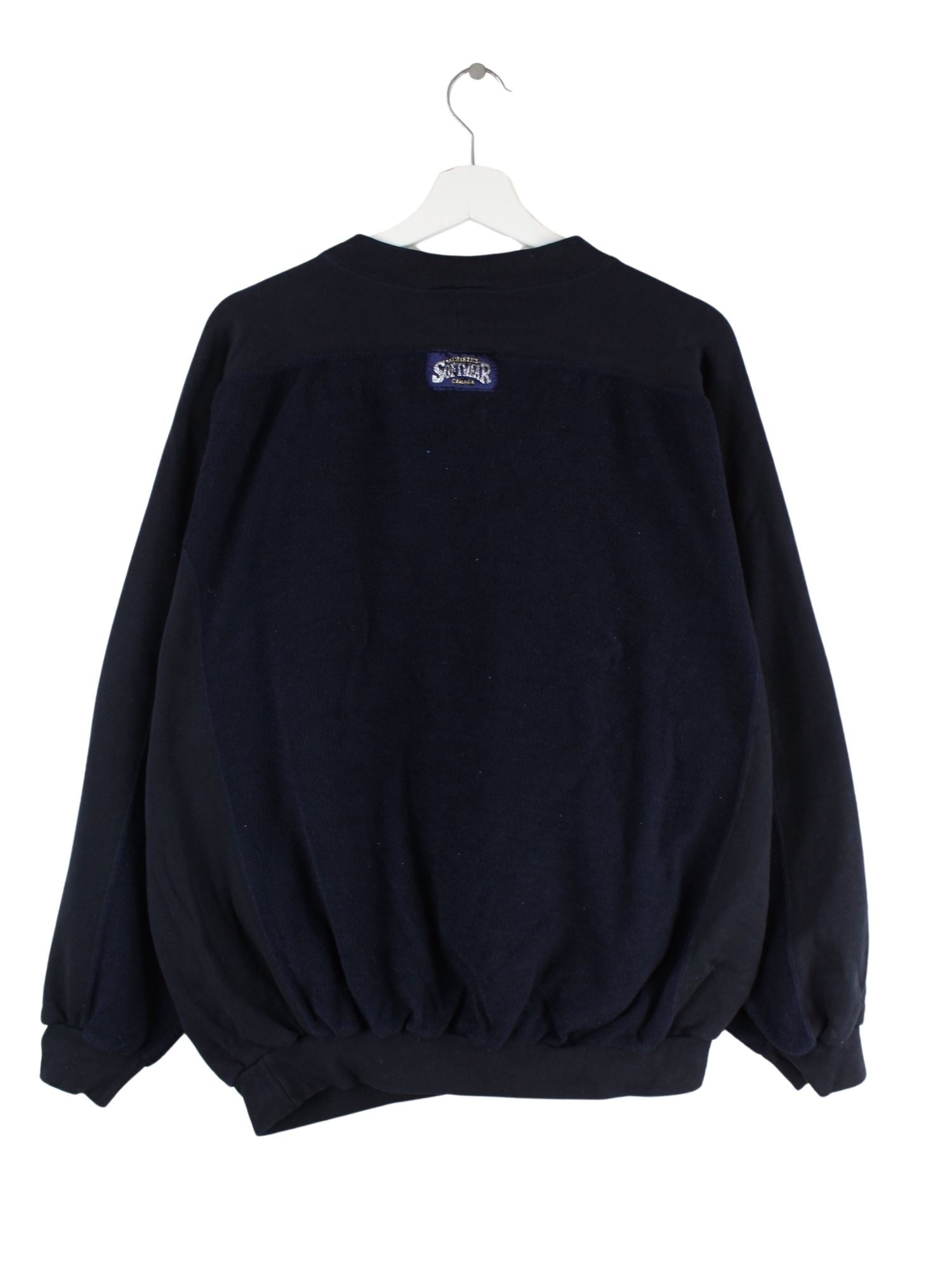 Blauer Vintage Sweater mit Stickereien aus den 90'ern in Größe L. Er ist aus einer Baumwollmischung gefertigt und in sehr gutem Zustand lieferbar.