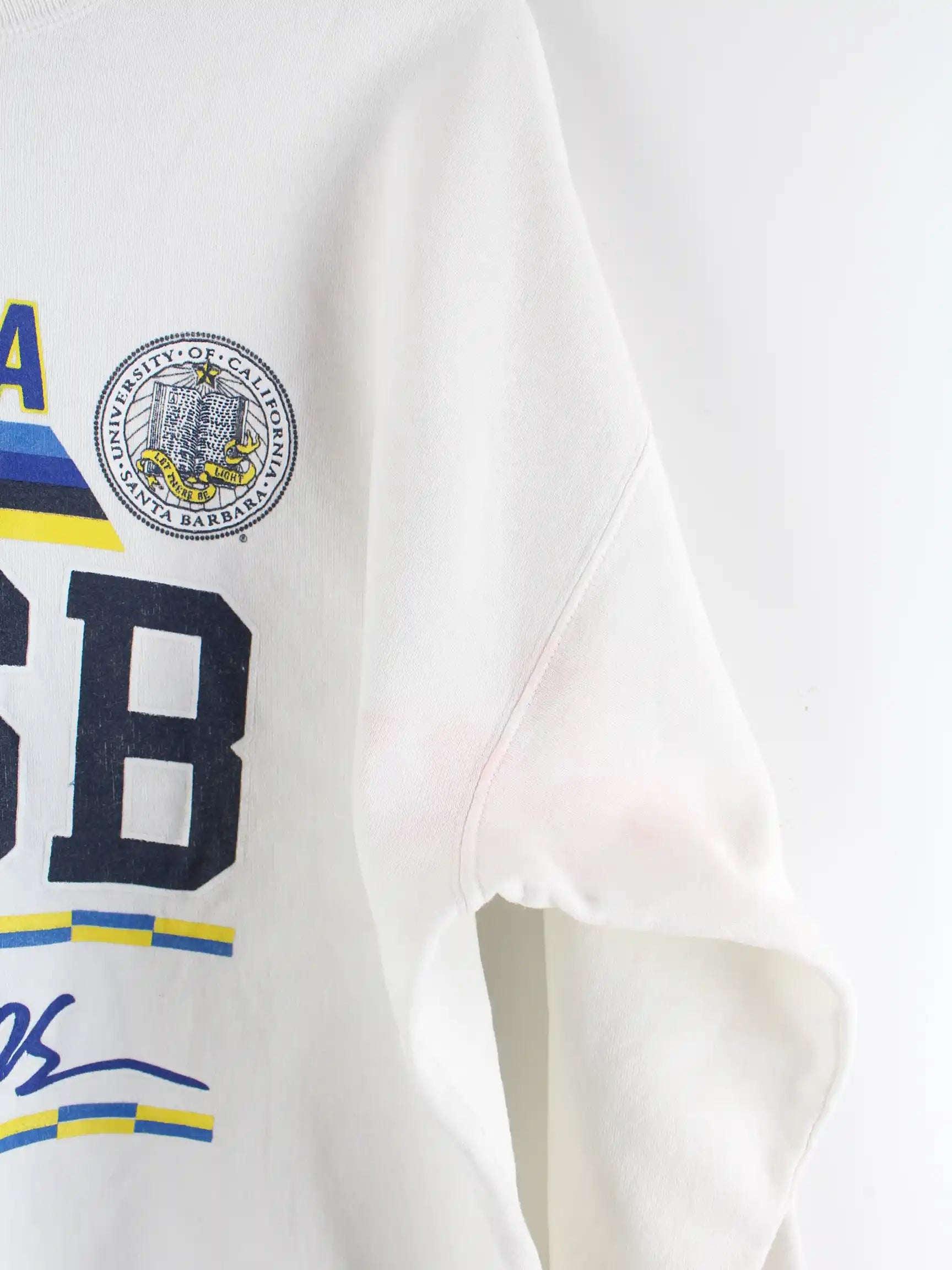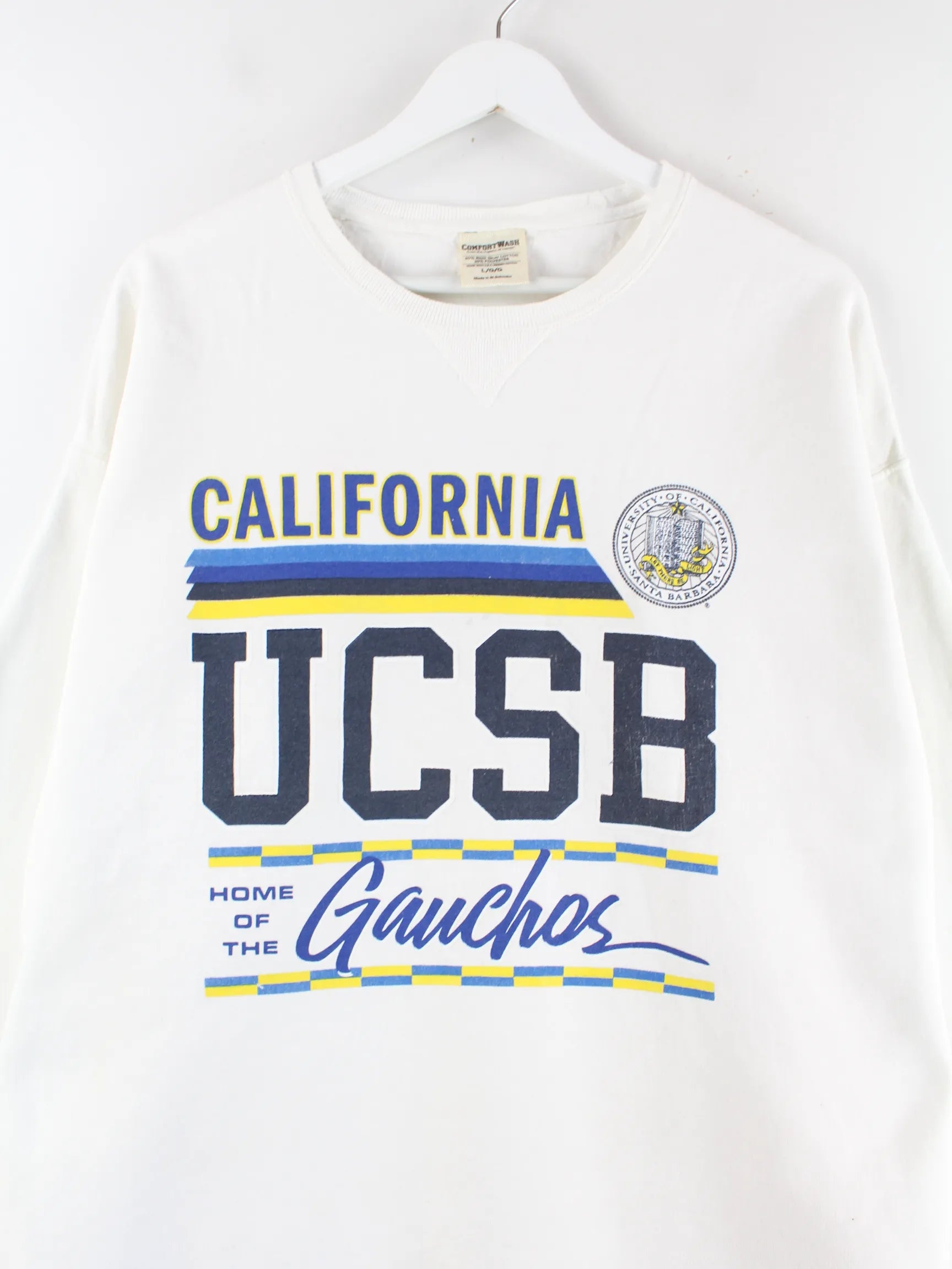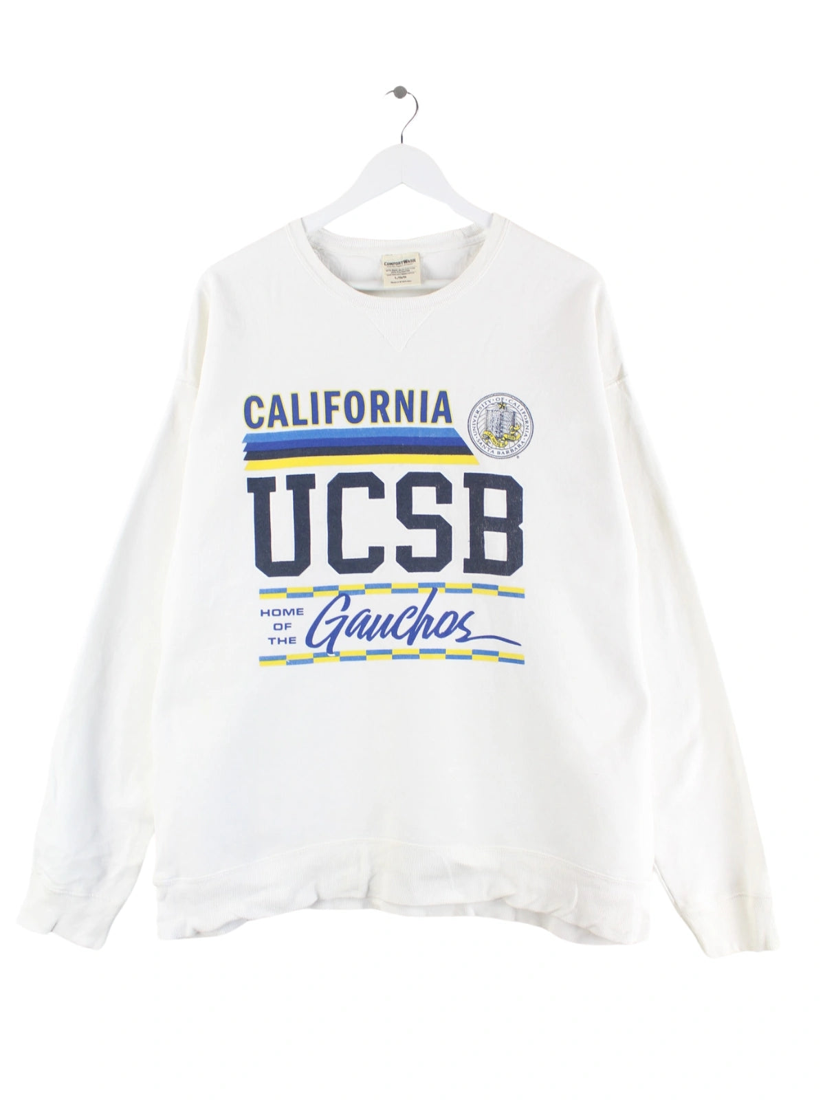 Vintage Sweater in Größe L. Er ist aus einer Baumwollmischung gefertigt und in Weiß zu bekommen. Mit seltenem California Print.