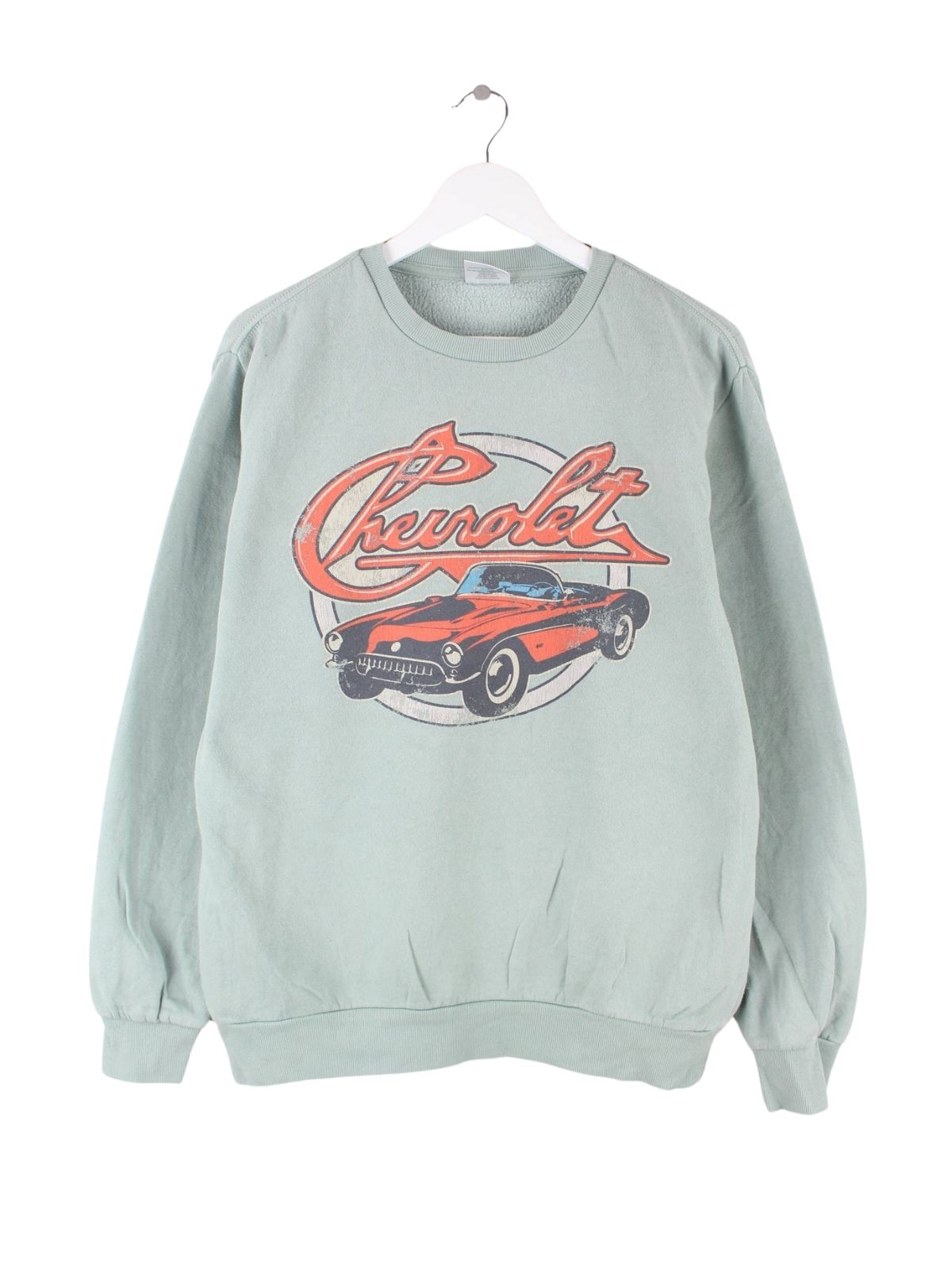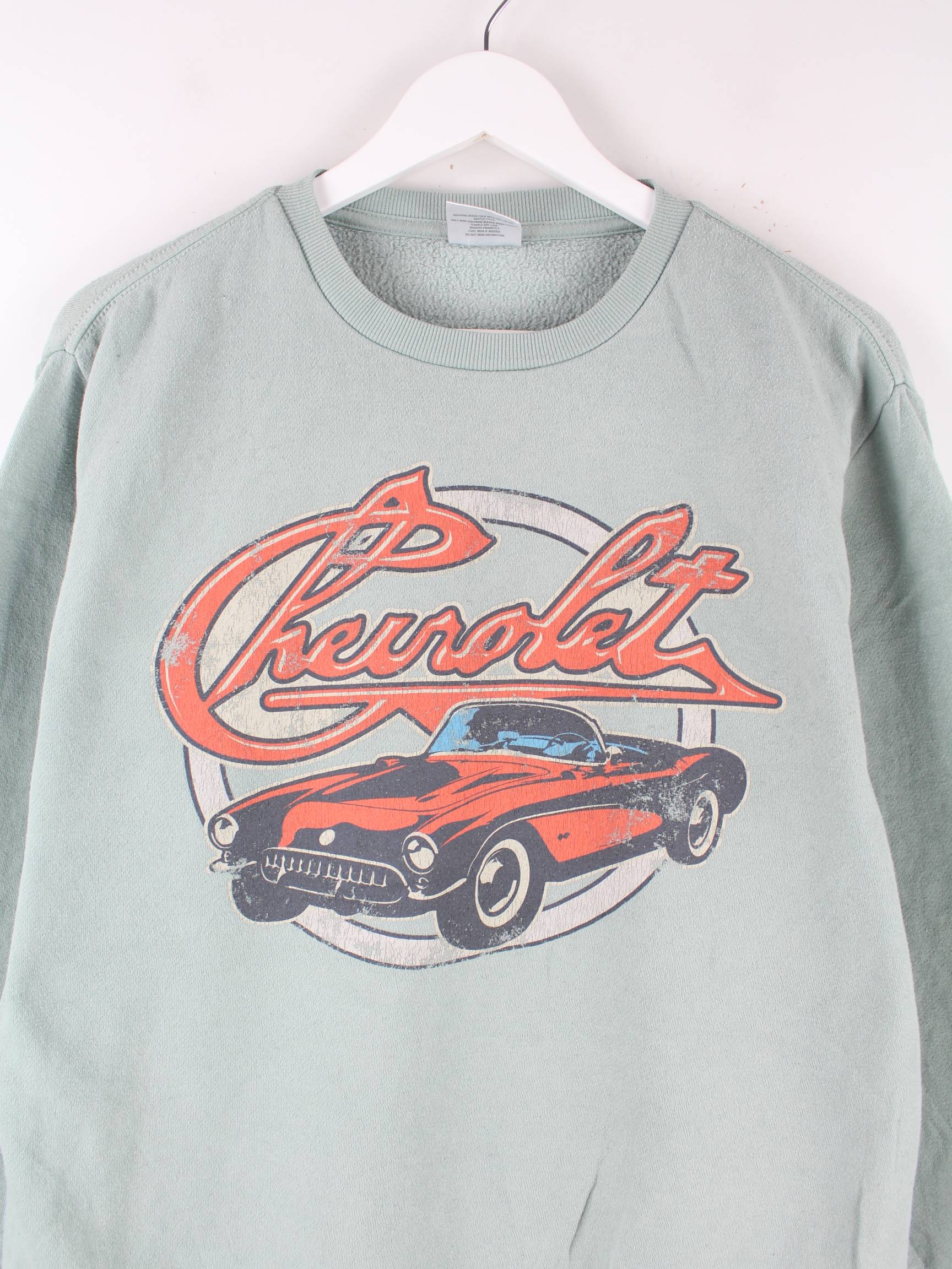 Vintage Sweater in Größe M. Er ist aus einer Baumwollmischung produziert und in Blau in Stock. Mit schönem Chevrolet Print.