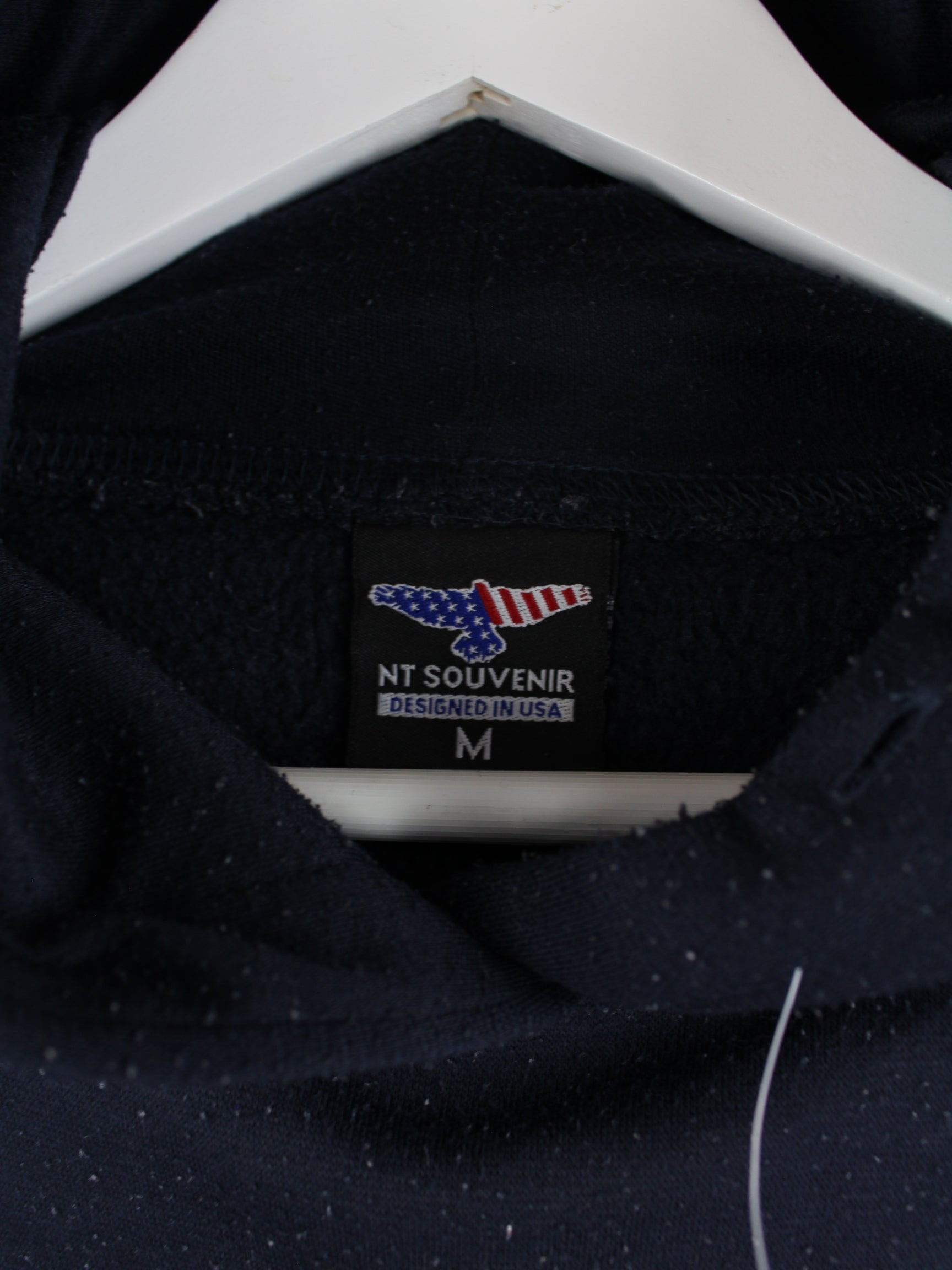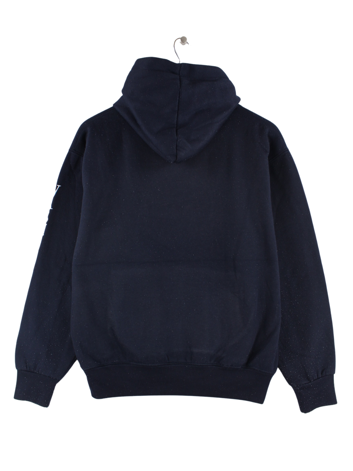 Vintage Hoodie mit gestickten Motiven in Größe M. Er ist aus einer Baumwollmischung angefertigt und in Blau zu haben.