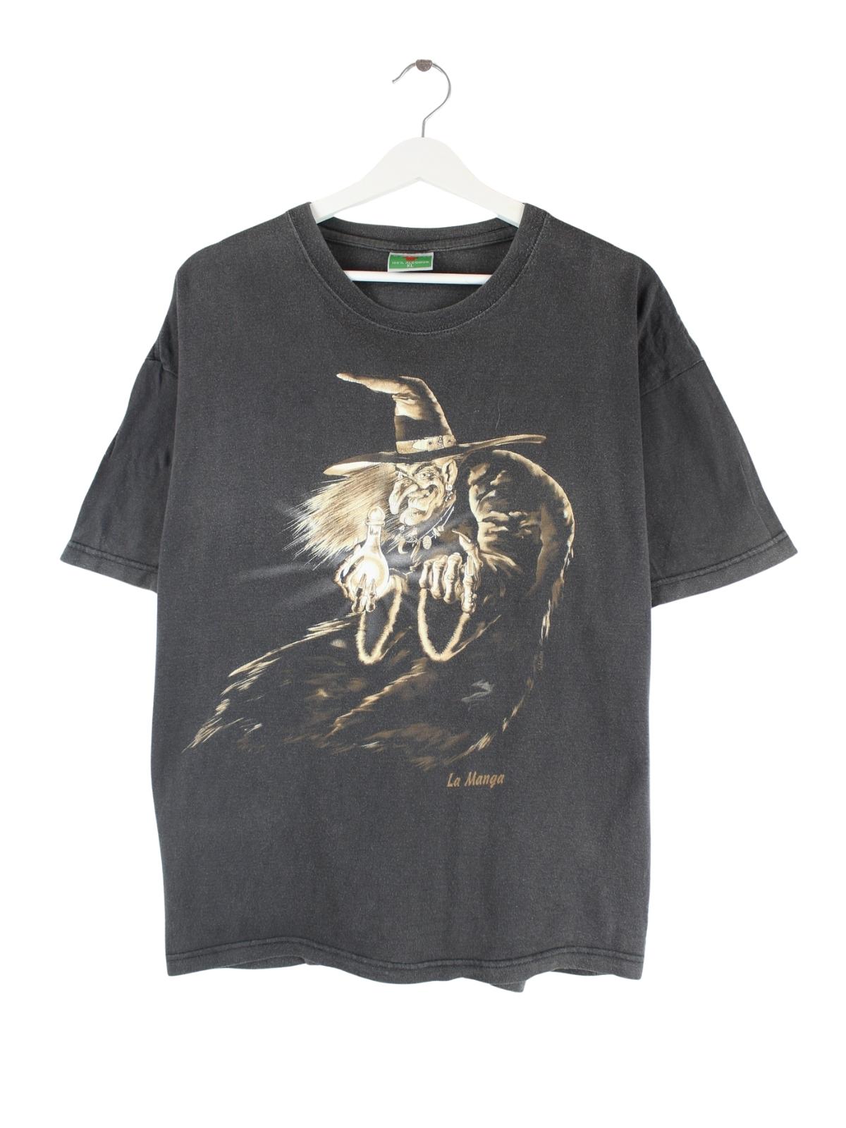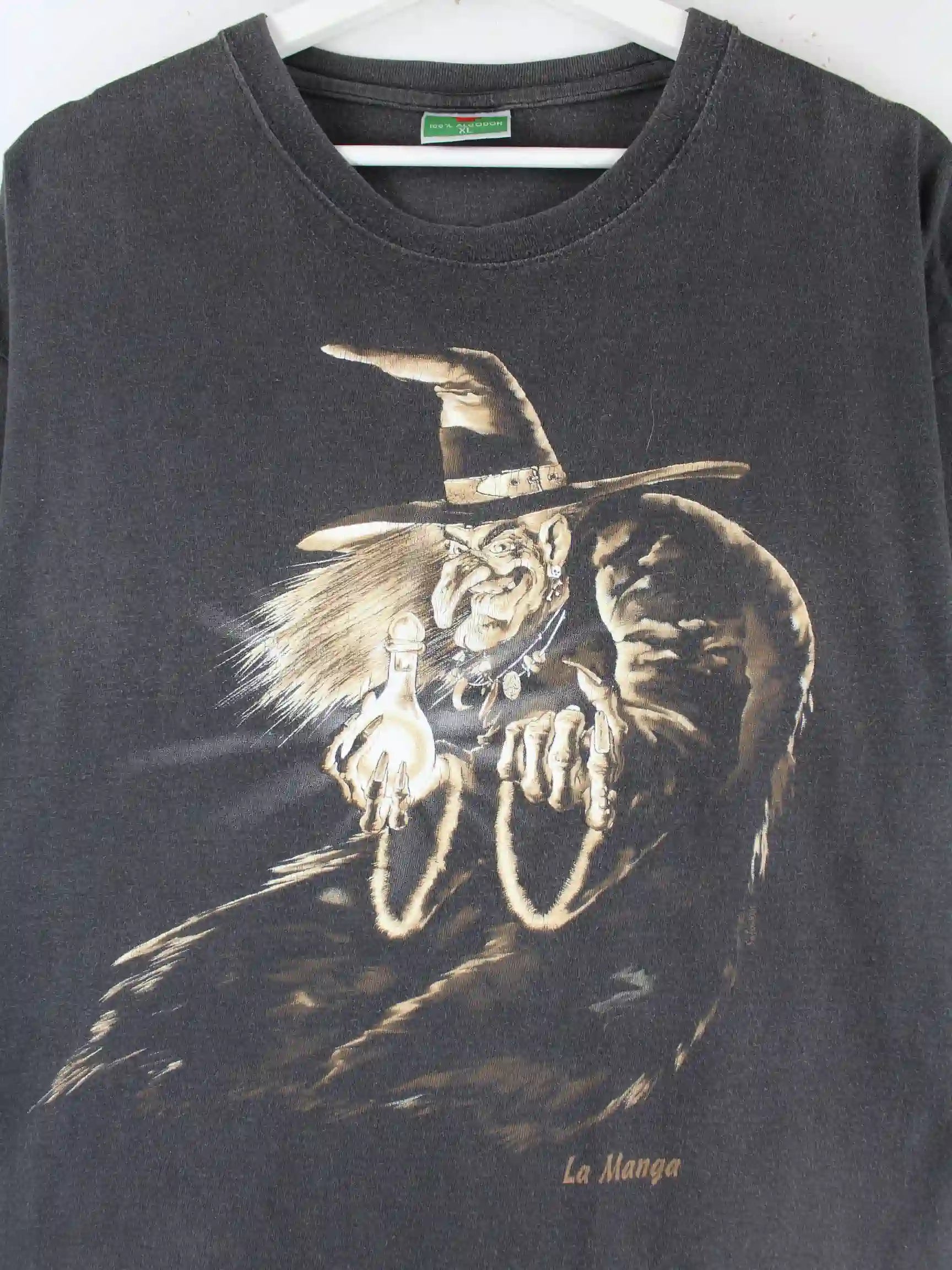 Vintage T-Shirt in Größe XL. Es ist aus Baumwolle gefertigt und in Schwarz in Stock. Mit schickem Witch Print.