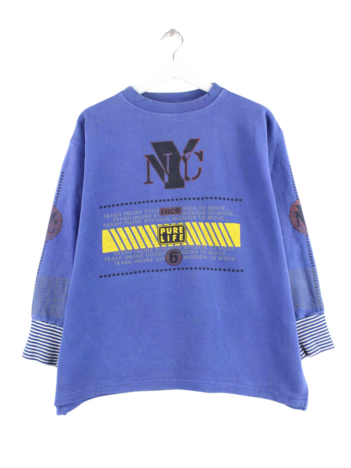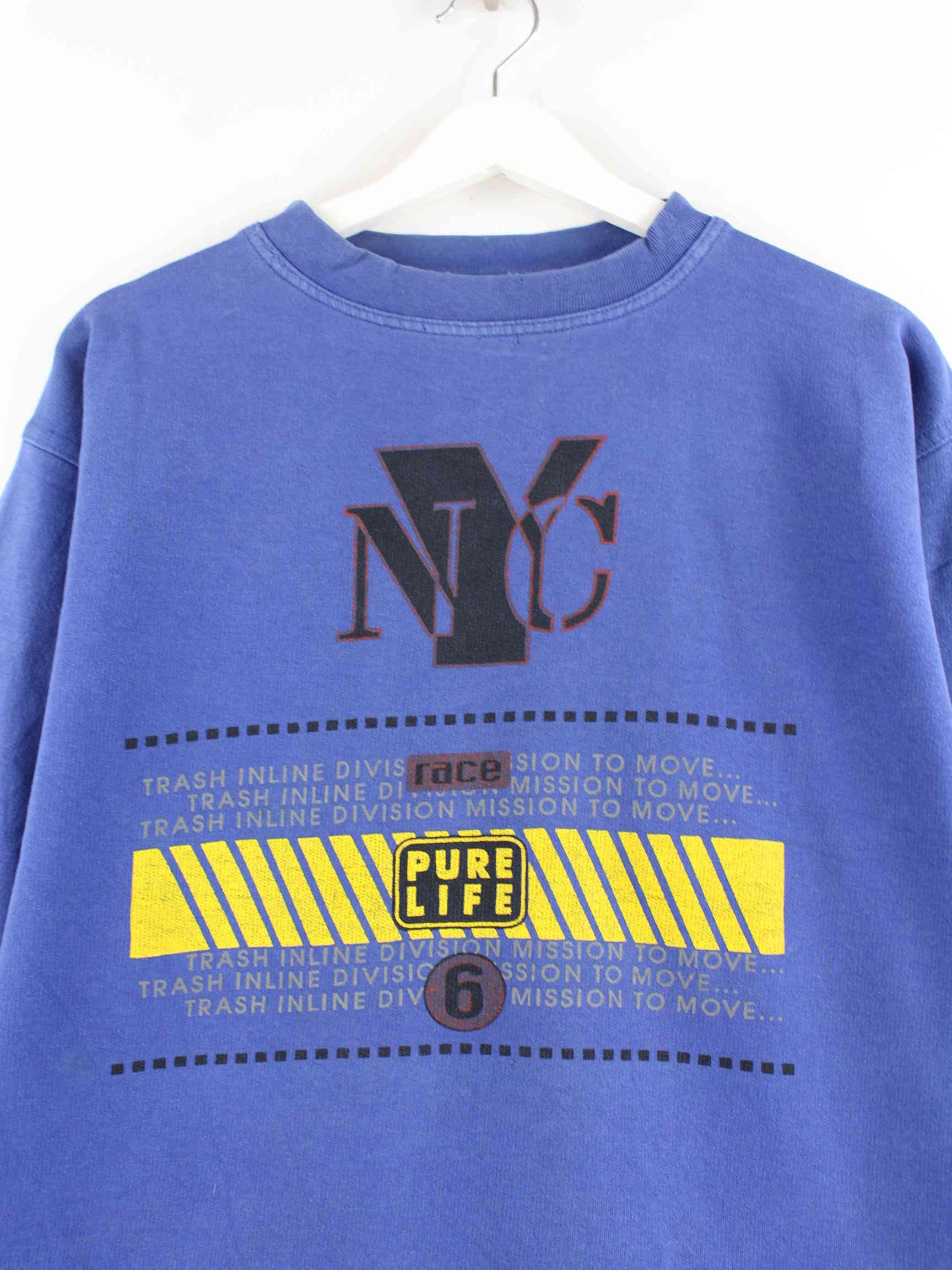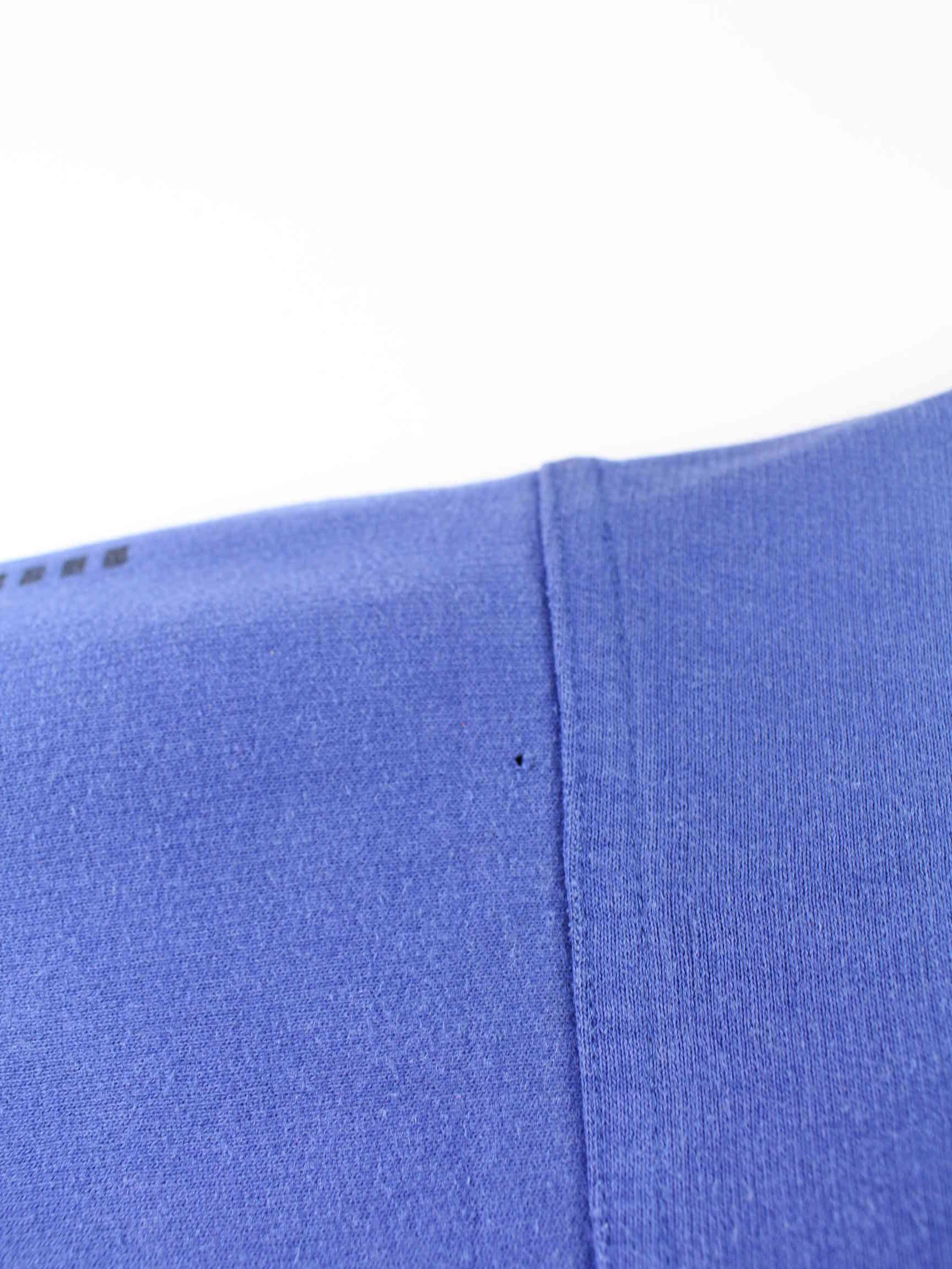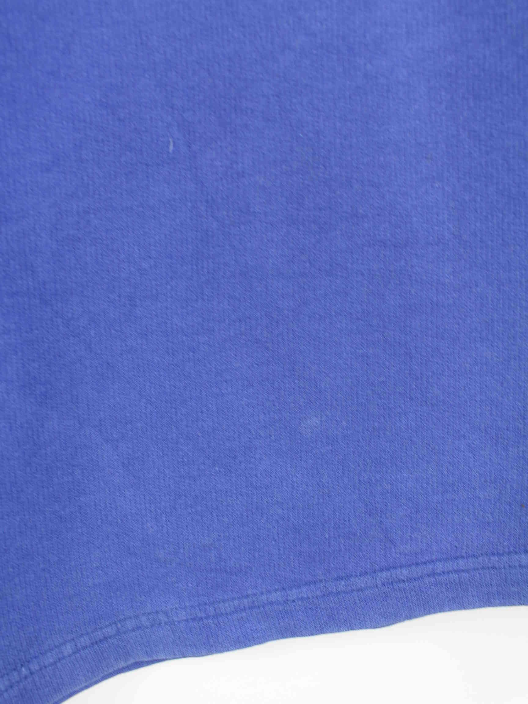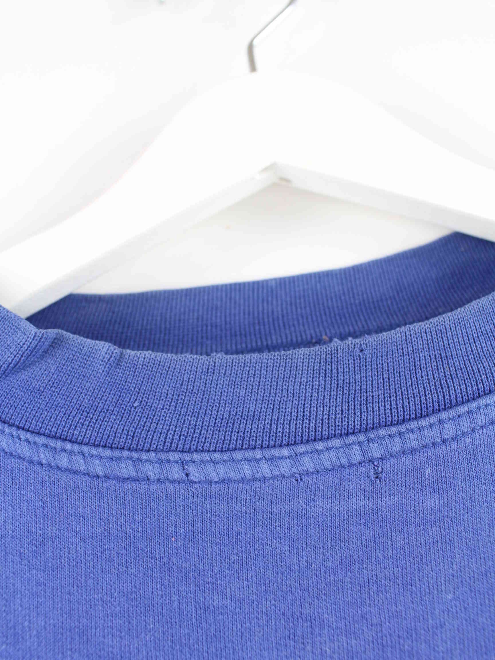 Blauer Vintage Sweater aus den 90'ern in Größe XS. Er ist aus einer Baumwollmischung angefertigt und in gutem Zustand im Bestand. Mit schönem Vintage Print.