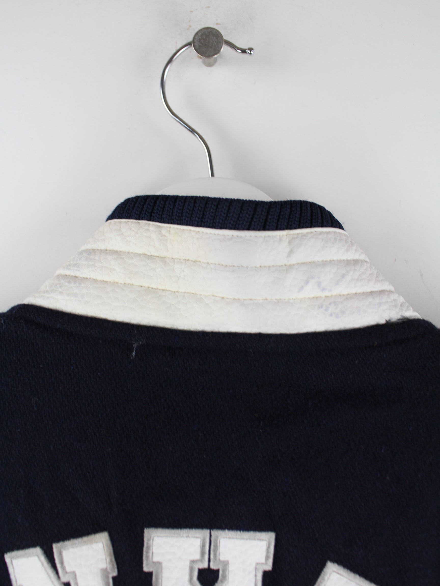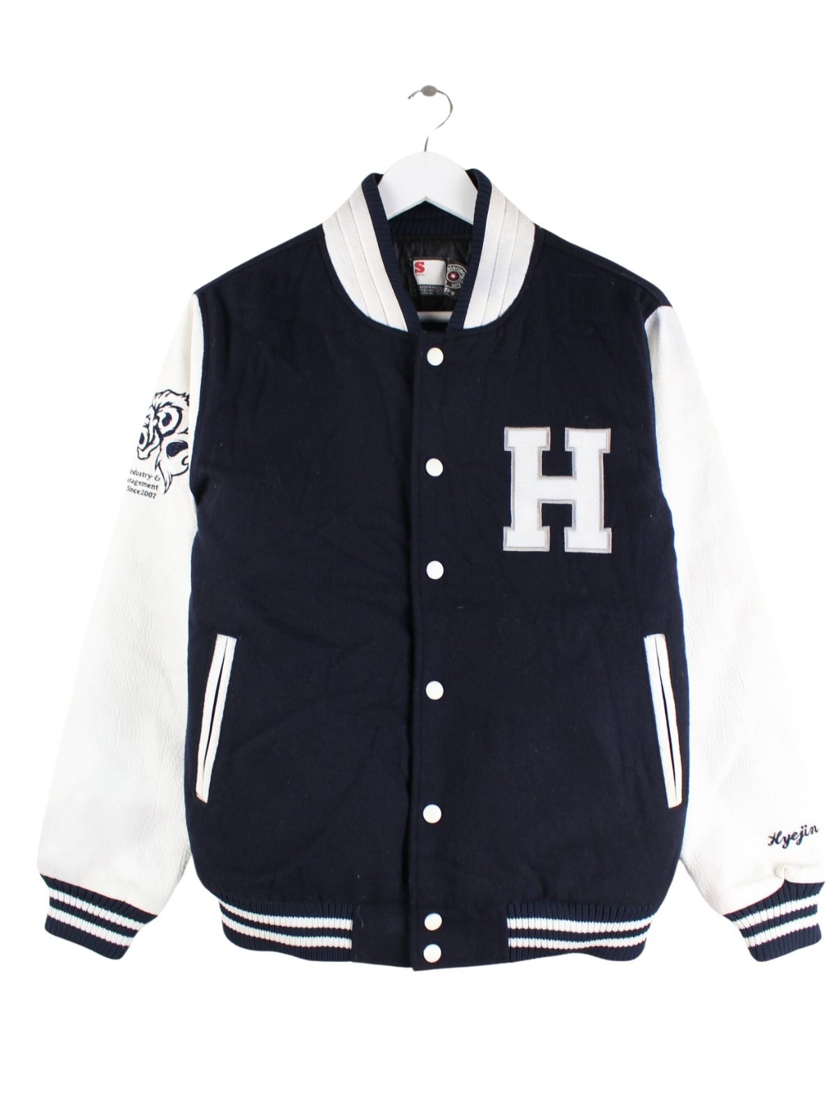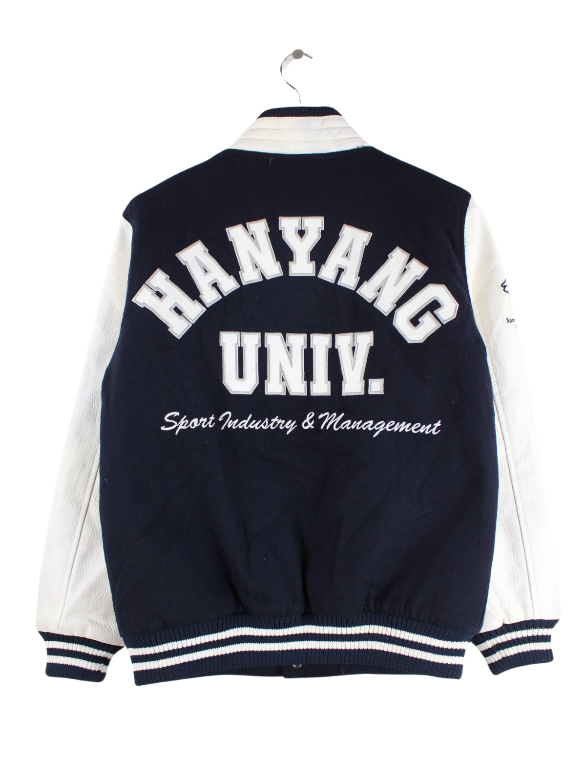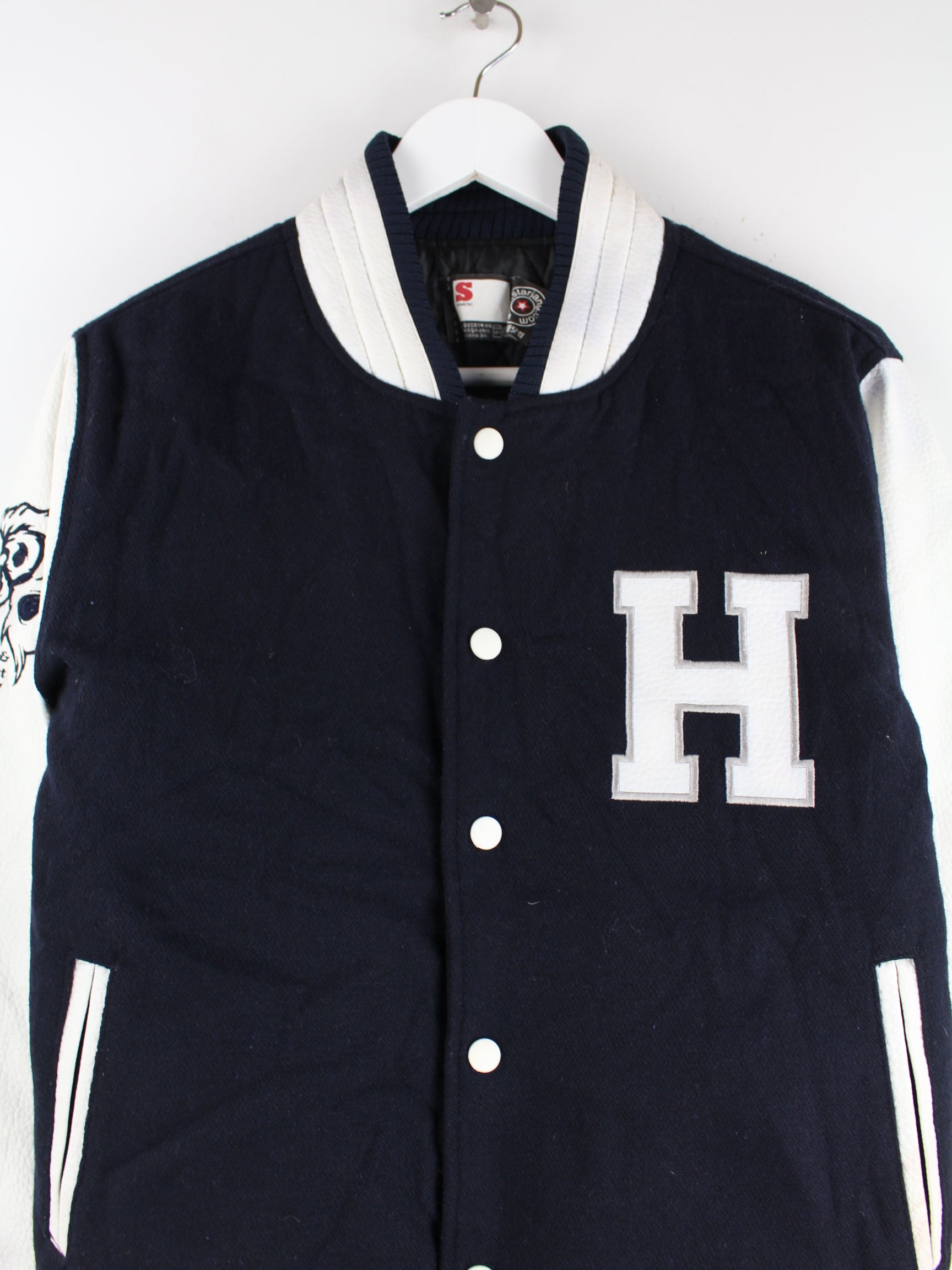 Vintage Jacke mit gesticktem Logo in Größe S. Sie ist aus Mischgewebe hergestellt und in Blau zu haben.