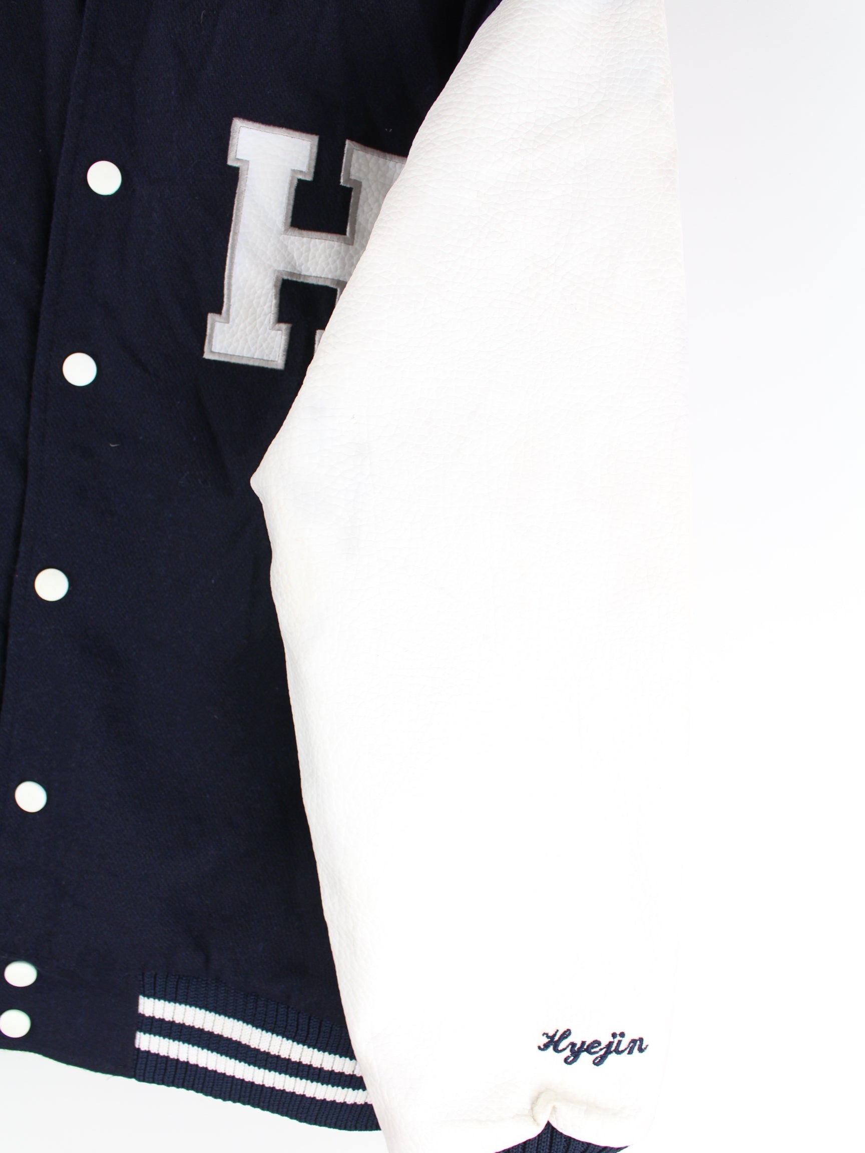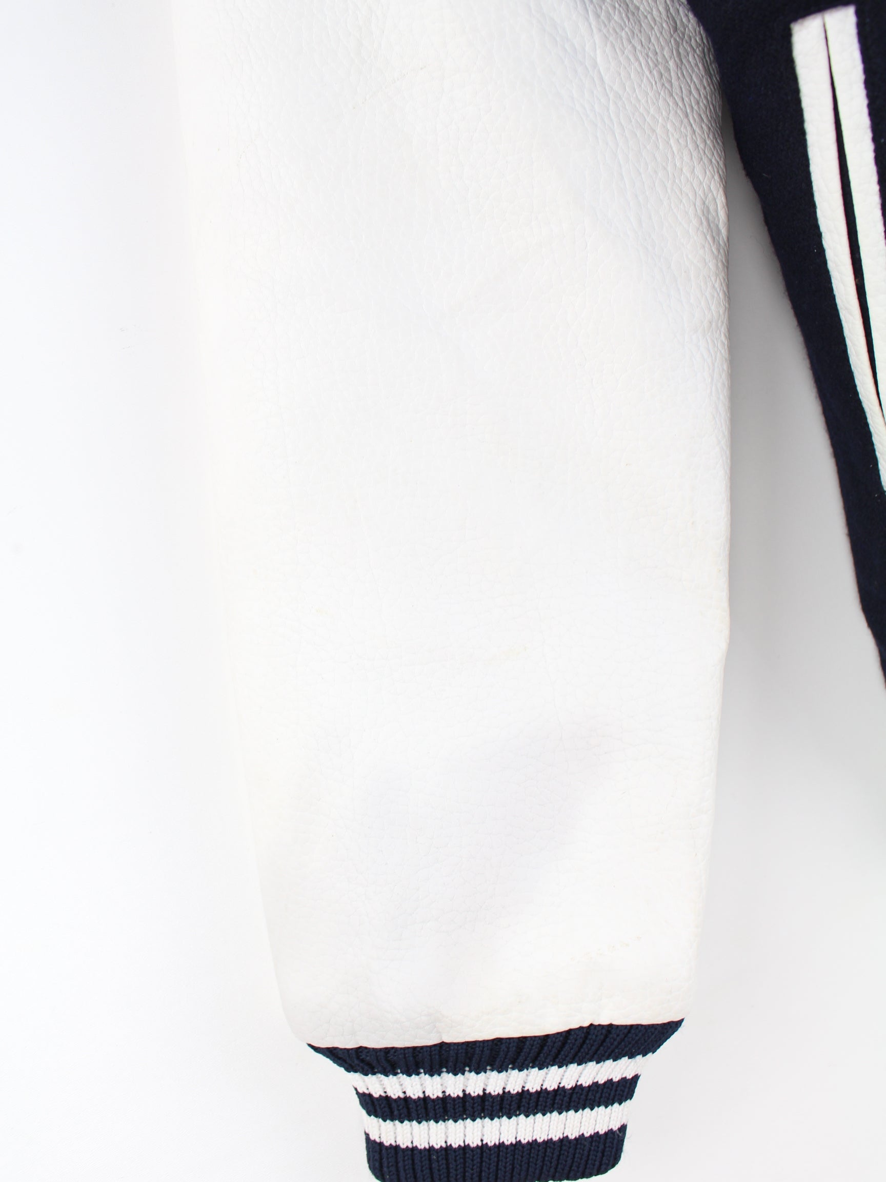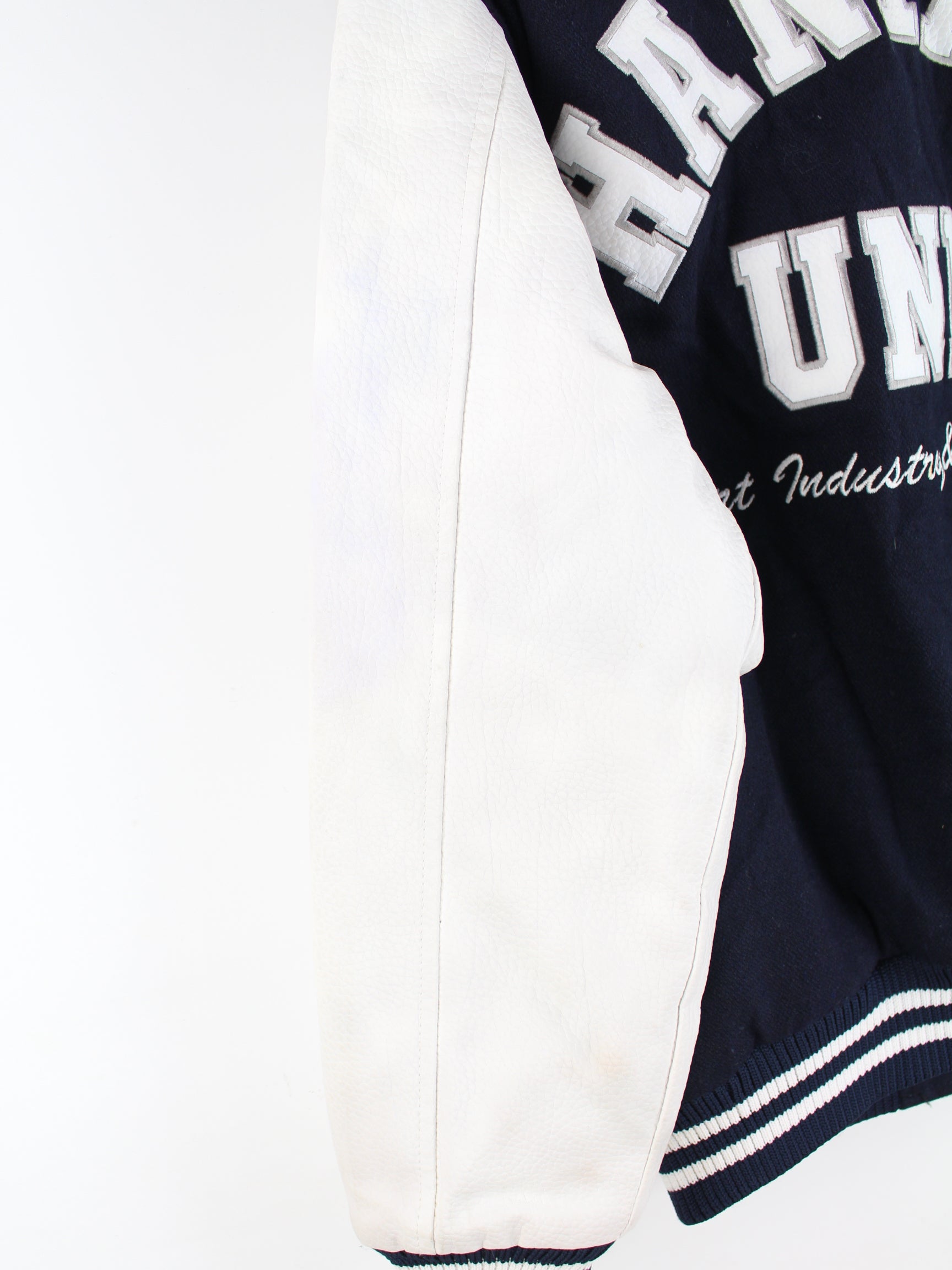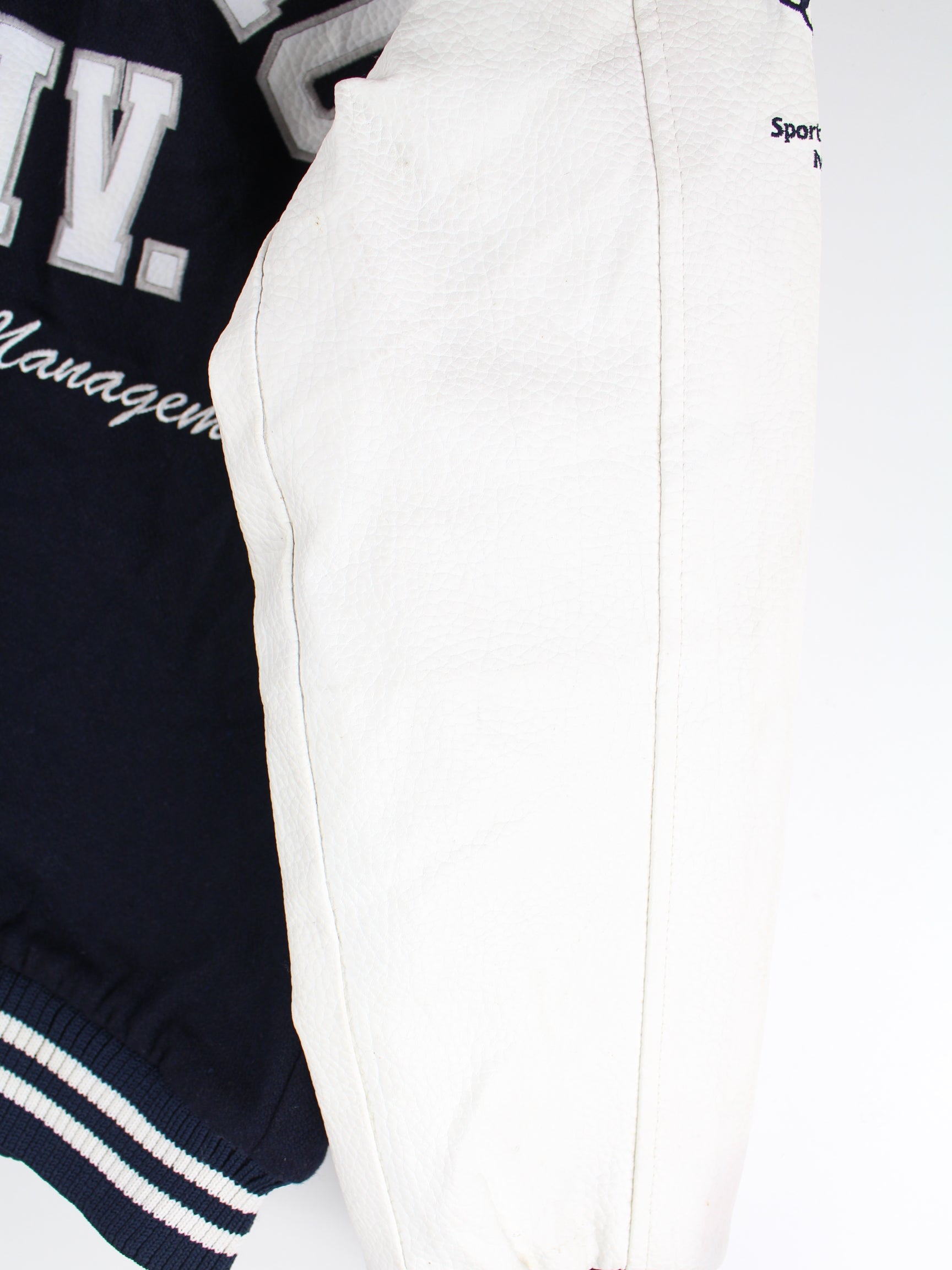 Vintage Jacke mit gesticktem Logo in Größe S. Sie ist aus Mischgewebe hergestellt und in Blau zu haben.
