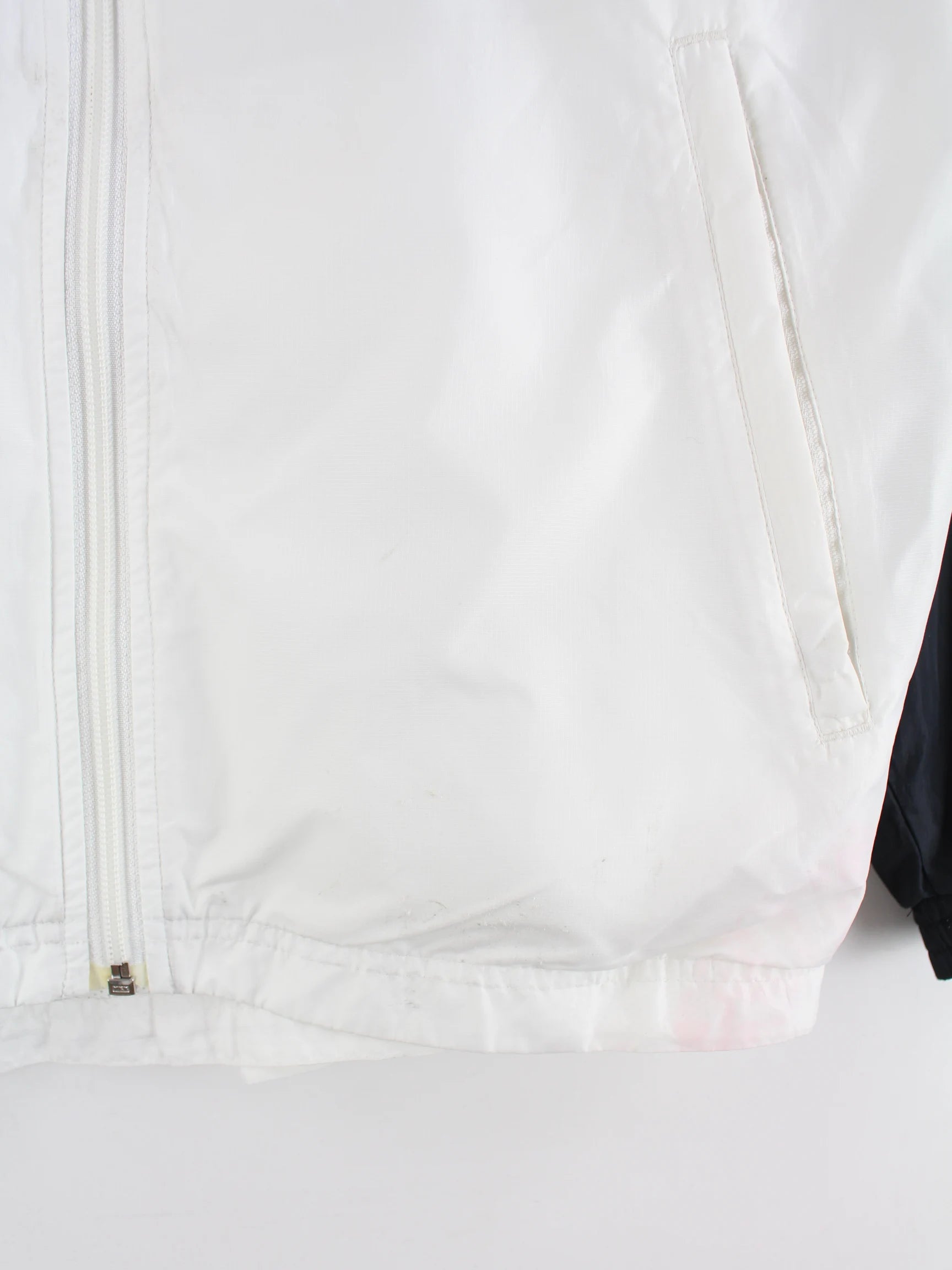 Weiße Trainingsjacke vom Brand Adidas in Größe L. Sie ist aus Synthetik produziert. Den Zustand würden wir als 'In Ordnung' bezeichnen (vergl. Bilder).