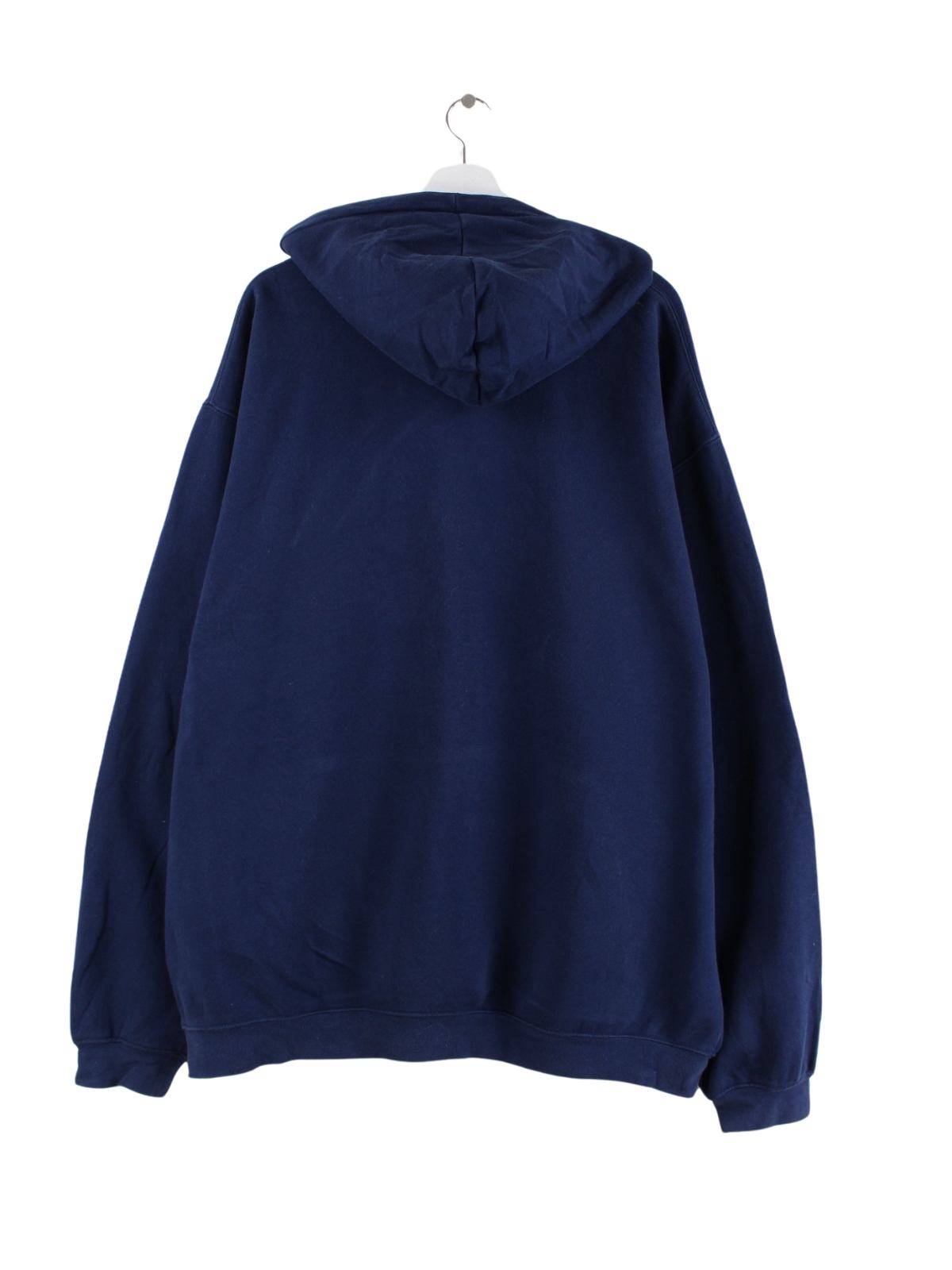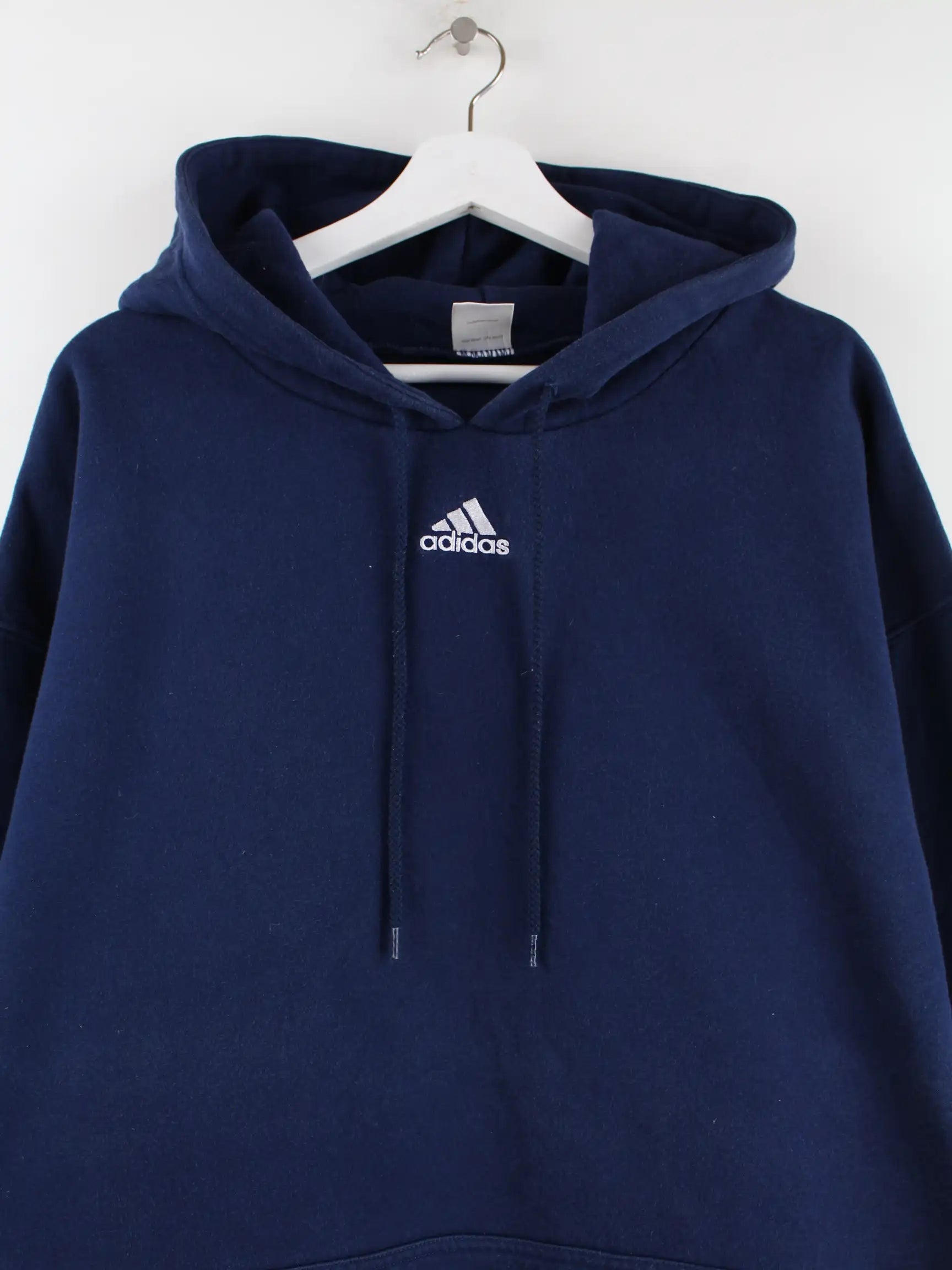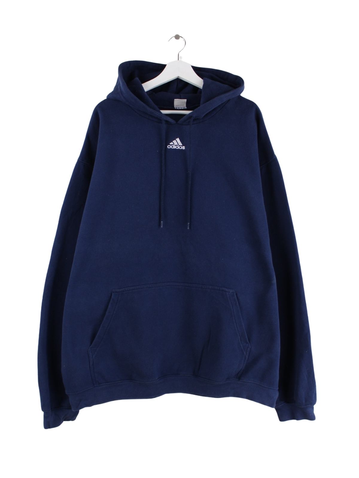 Hoodie vom Brand Adidas mit Stickereien in Größe 3XL. Er ist aus einer Baumwollmischung gefertigt und in Blau lieferbar.