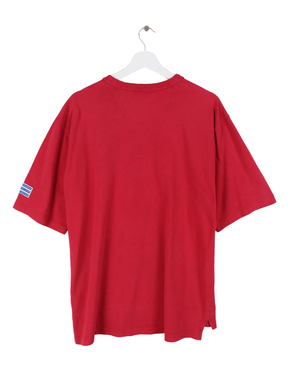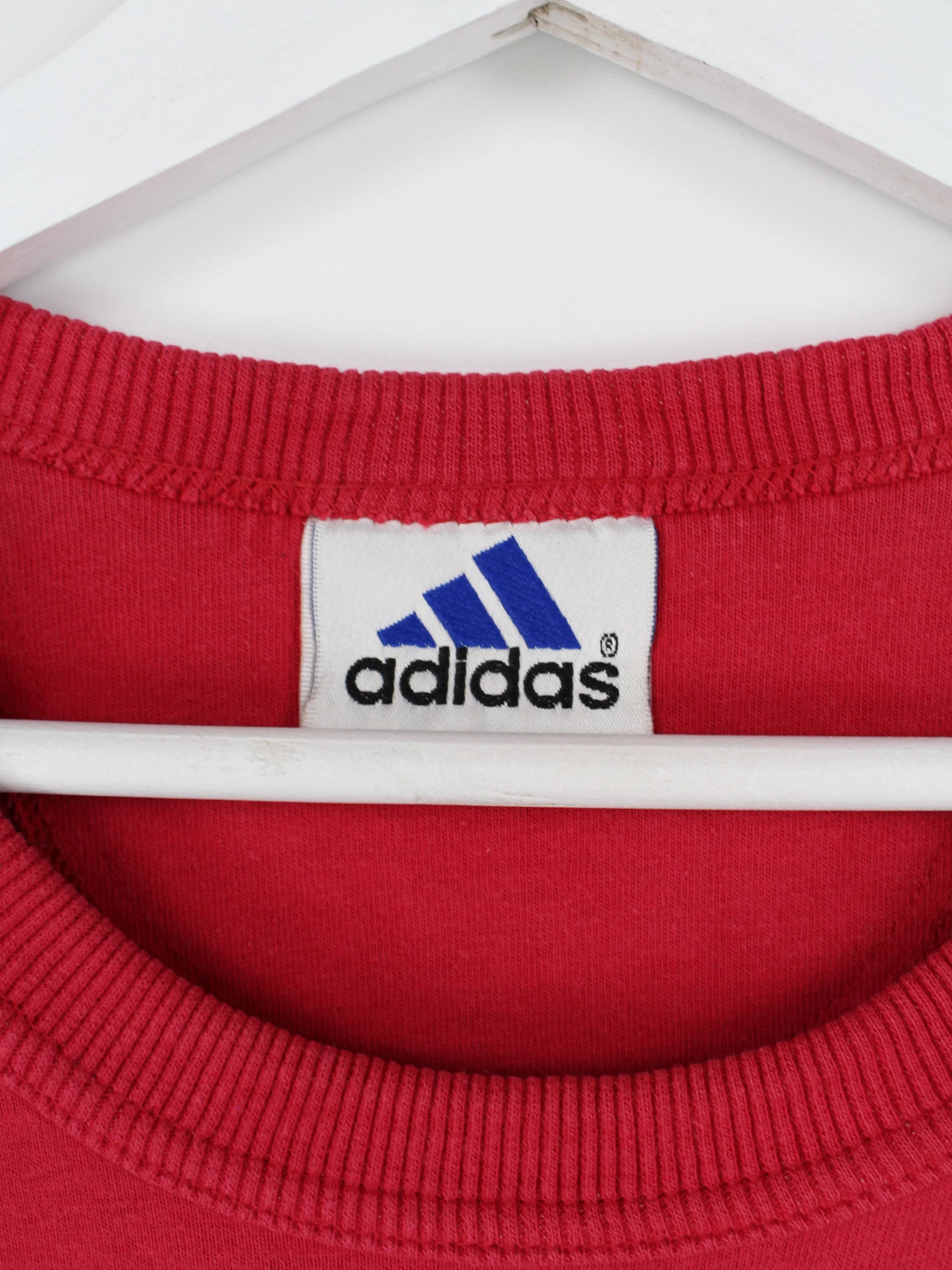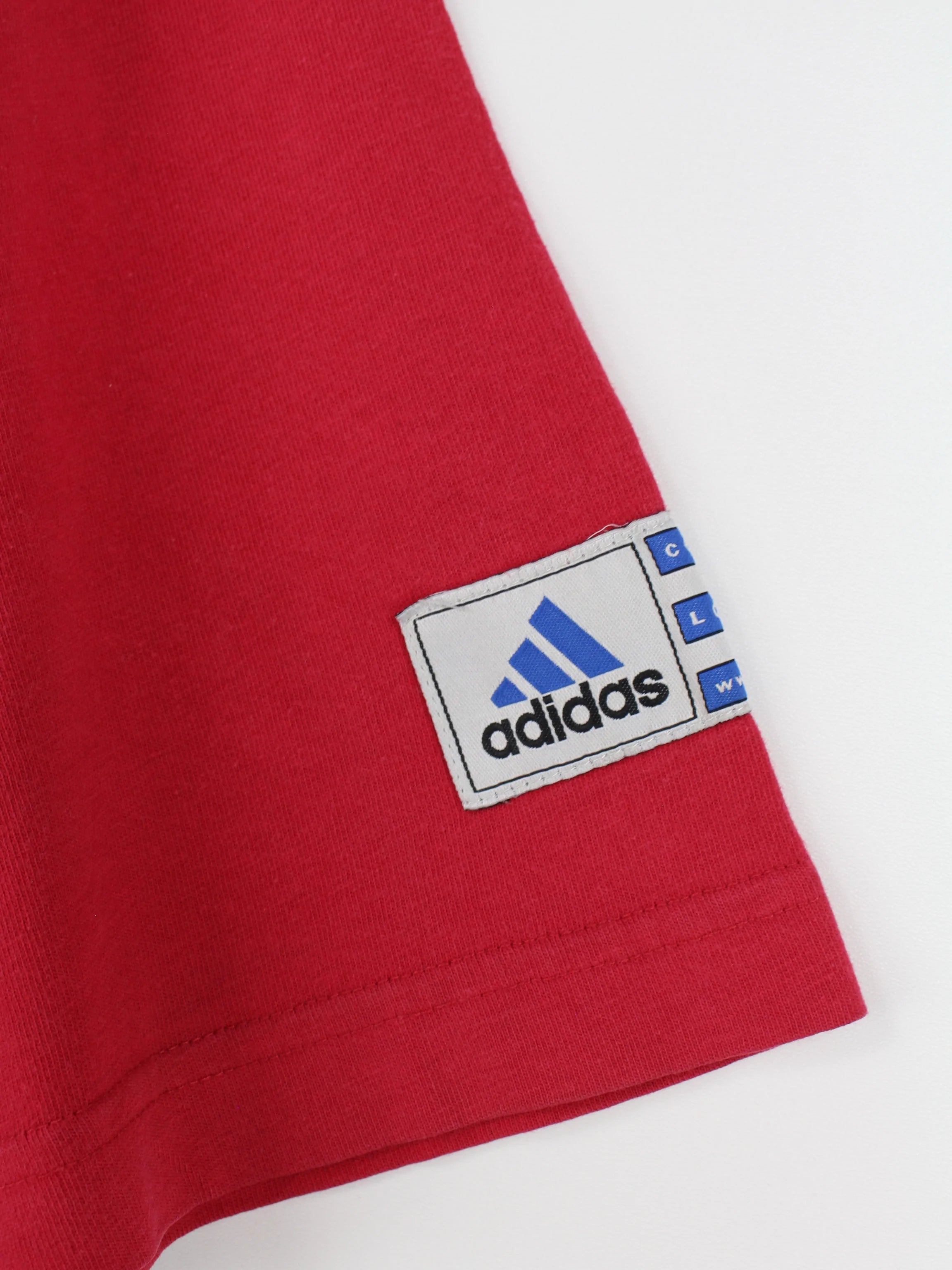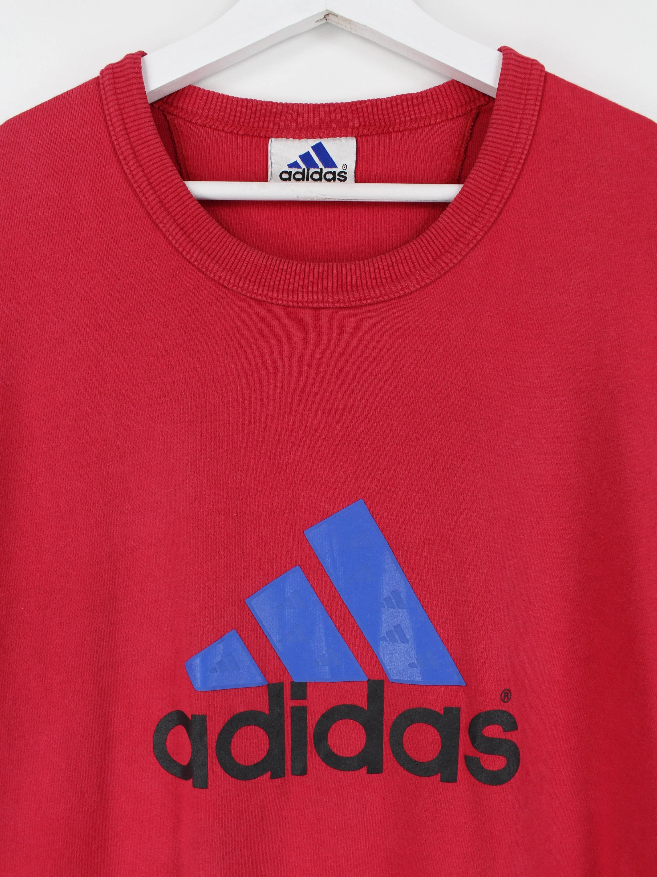Rotes Adidas Shirt mit großem Logo auf der Front.