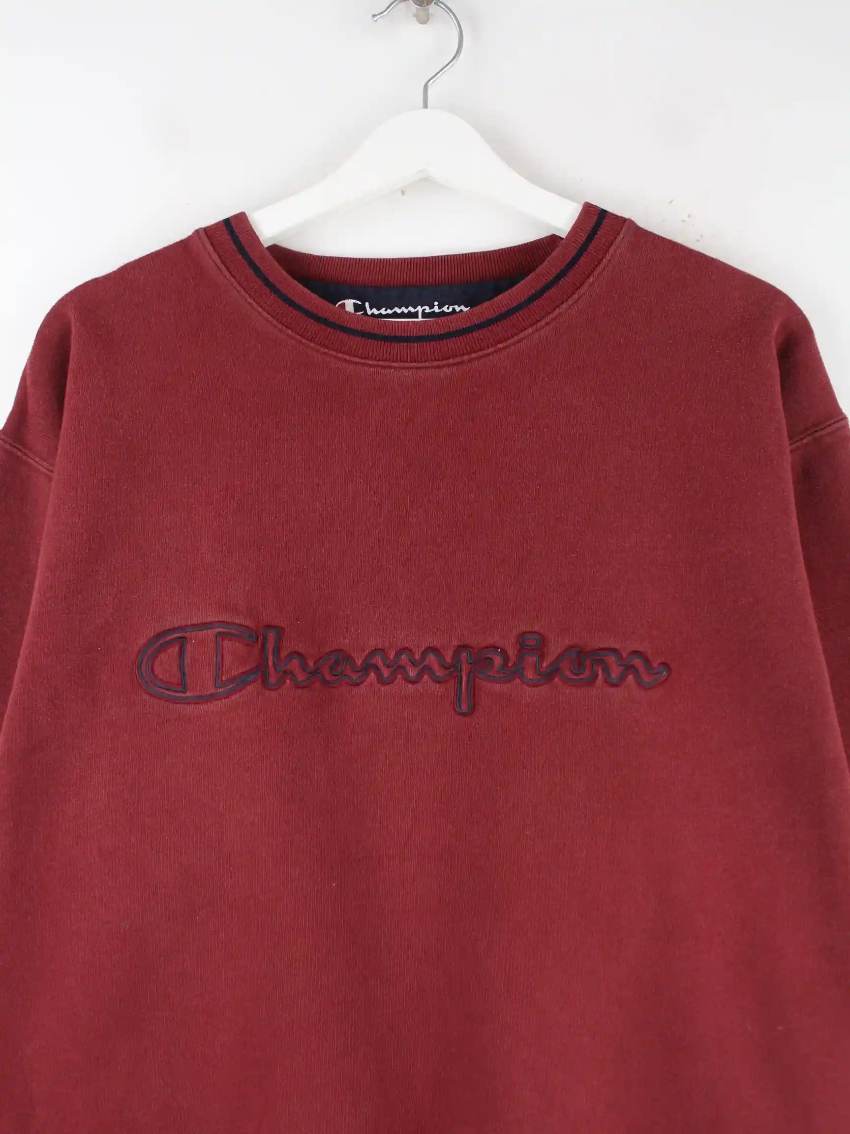 Roter Sweater des Labels Champion in Größe L. Er ist aus einer Baumwollmischung angefertigt und in sehr gutem Zustand vorrätig.