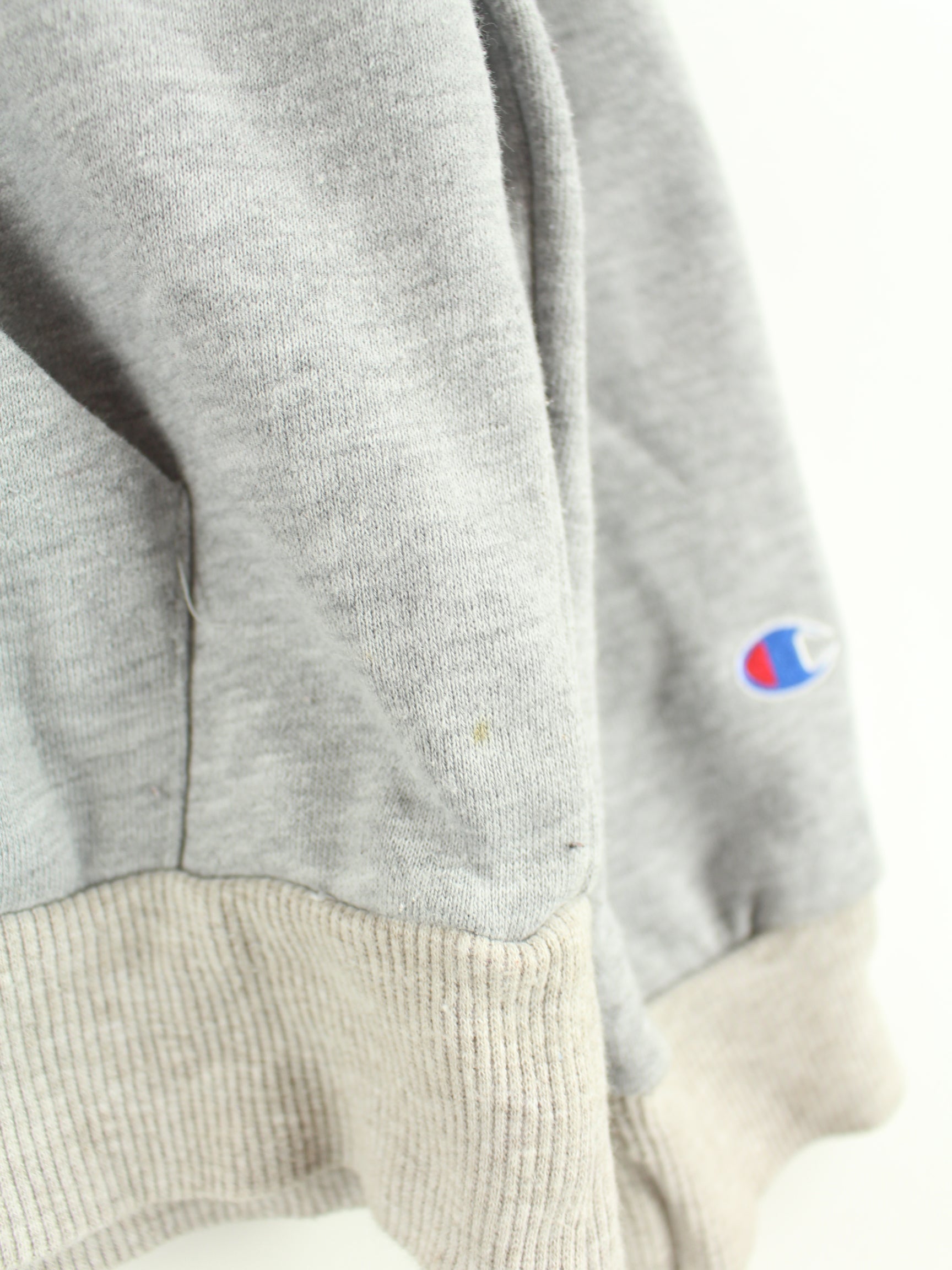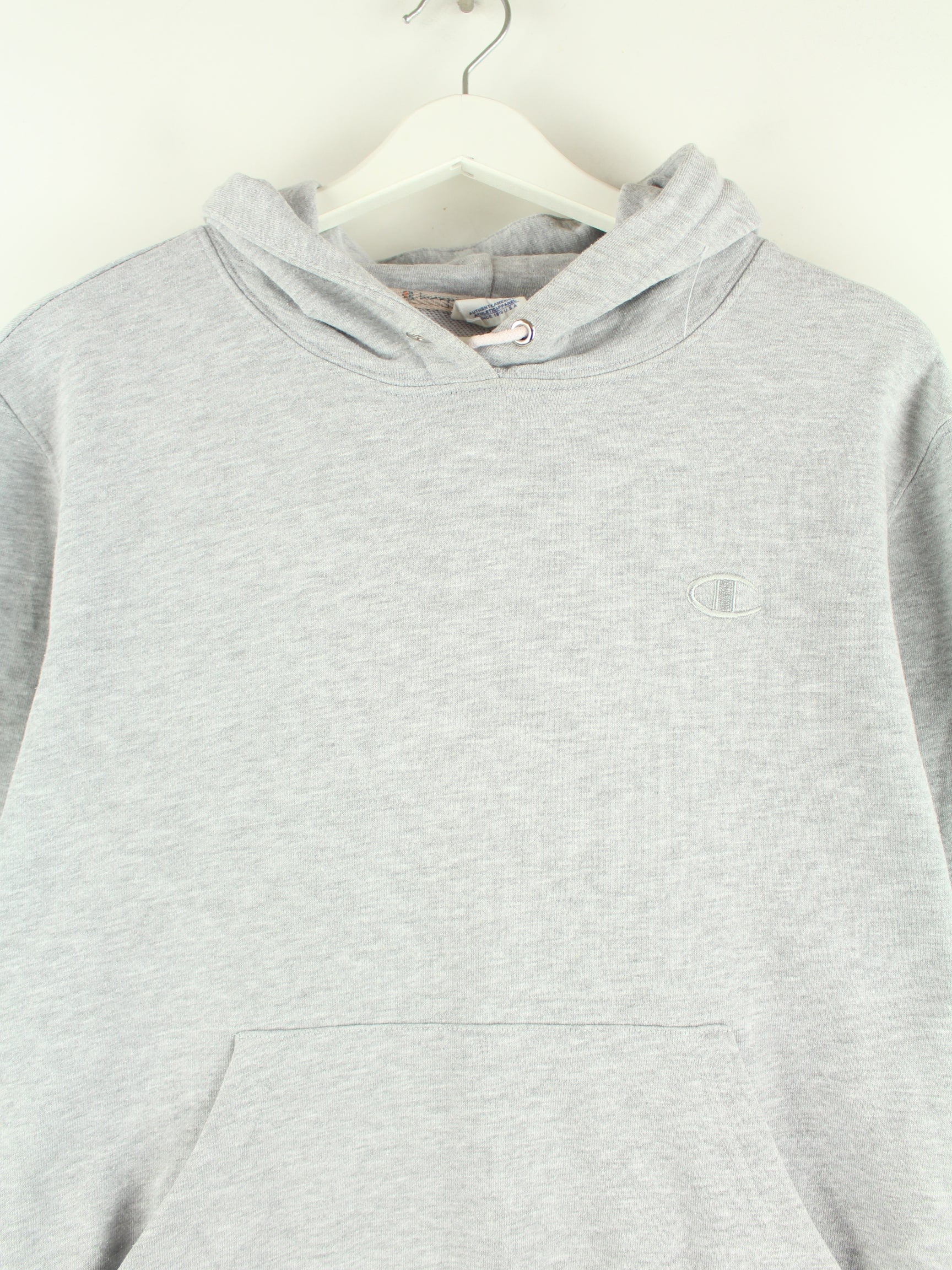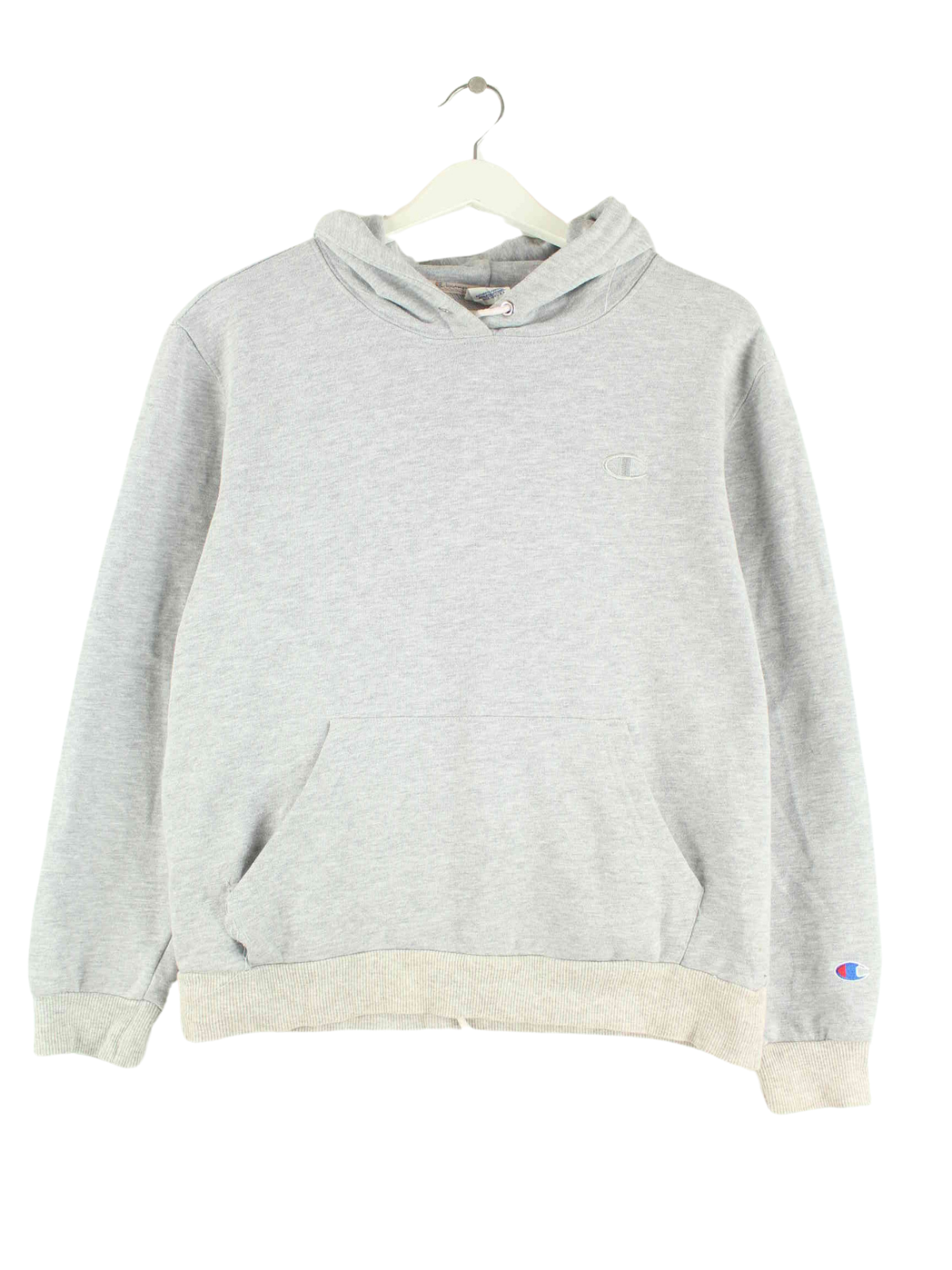 Grauer Hoodie von Champion in Größe M. Er ist aus einer Baumwollmischung angefertigt und in gutem Zustand auf Lager.