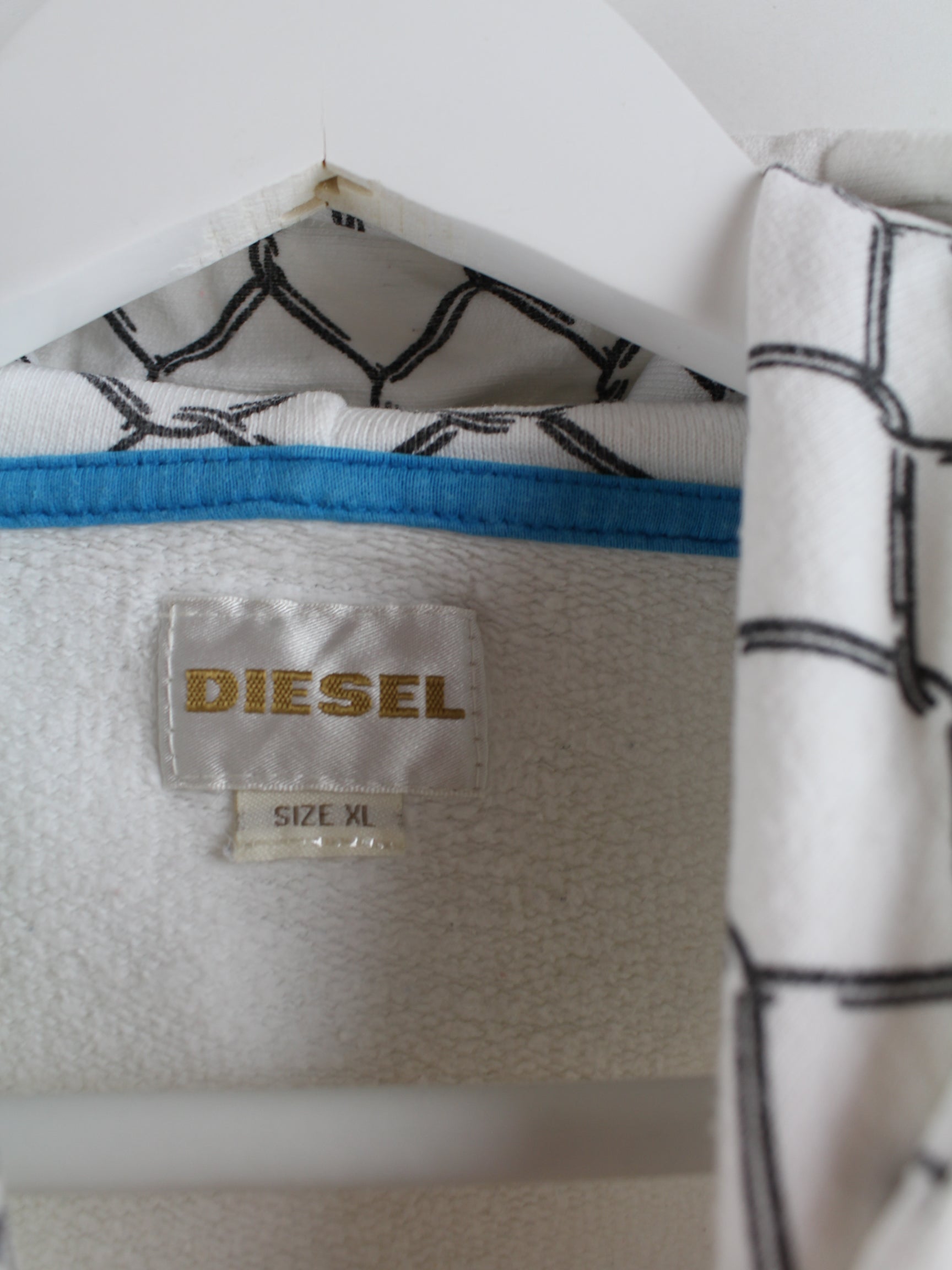 Hoodie vom Brand Diesel in Größe L aus Anfang der 2000'er. Er ist aus einer Baumwollmischung hergestellt und in Weiß bei uns vorrätig. Mit schickem y2k Print.