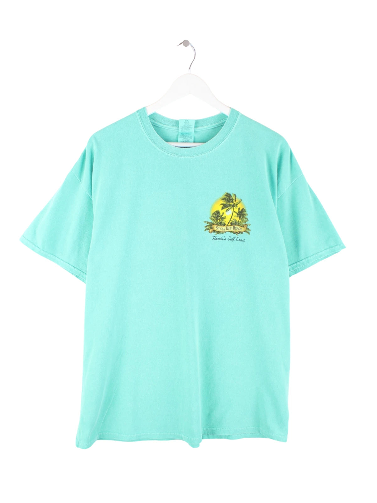 Türkisfarbenes T-Shirt der Brand Gildan in Größe XL. Es ist aus Baumwolle gefertigt und in sehr gutem Zustand im Bestand. Mit schickem Florida Print.