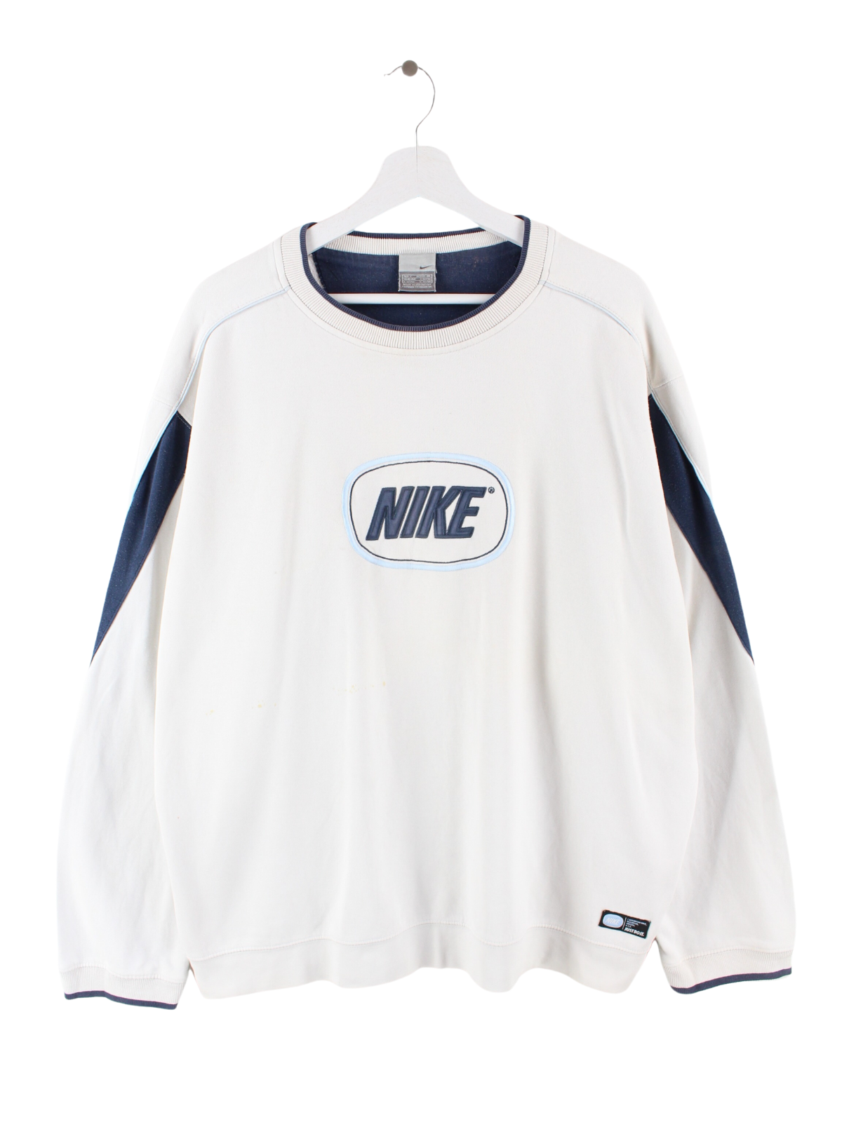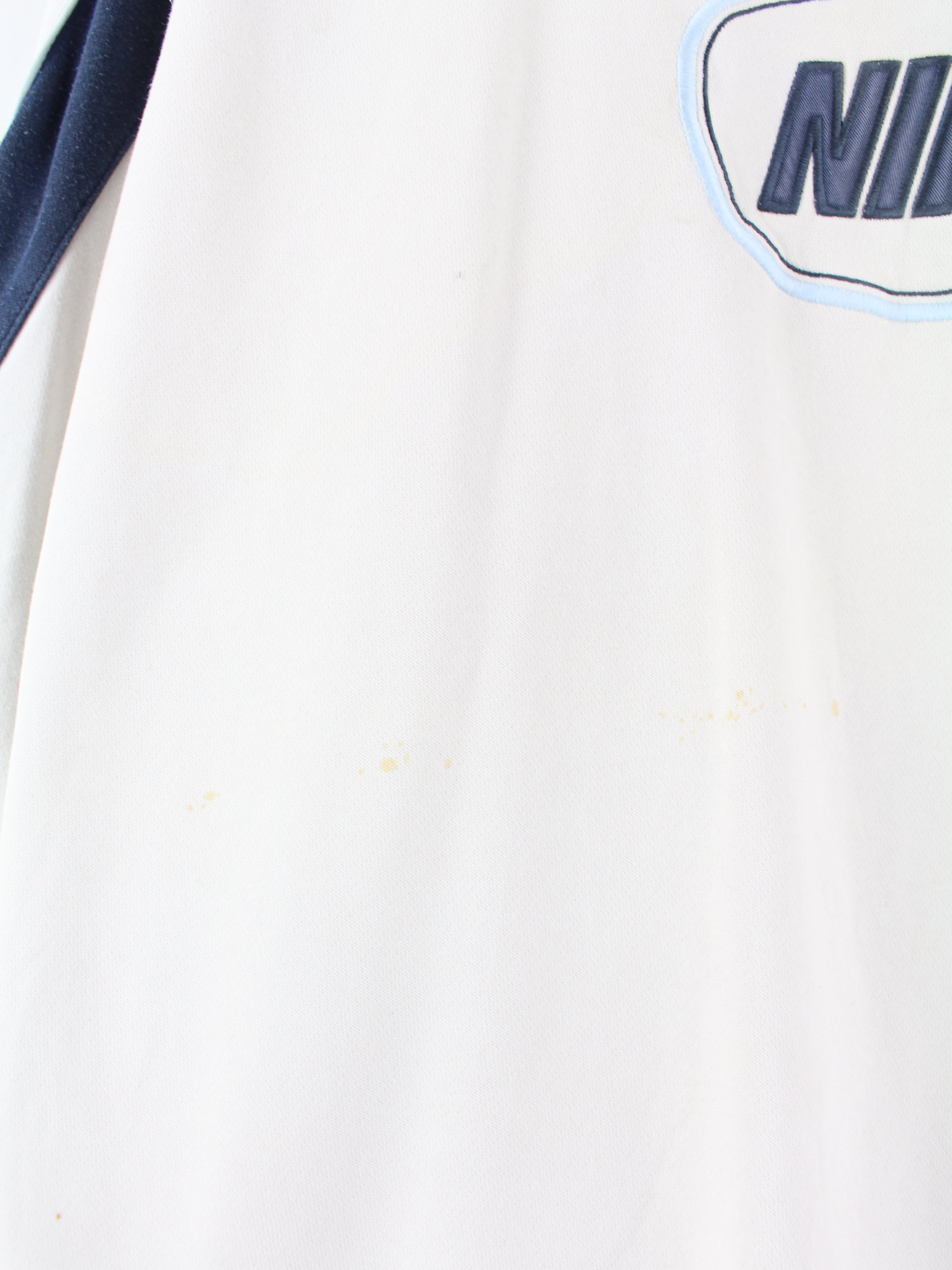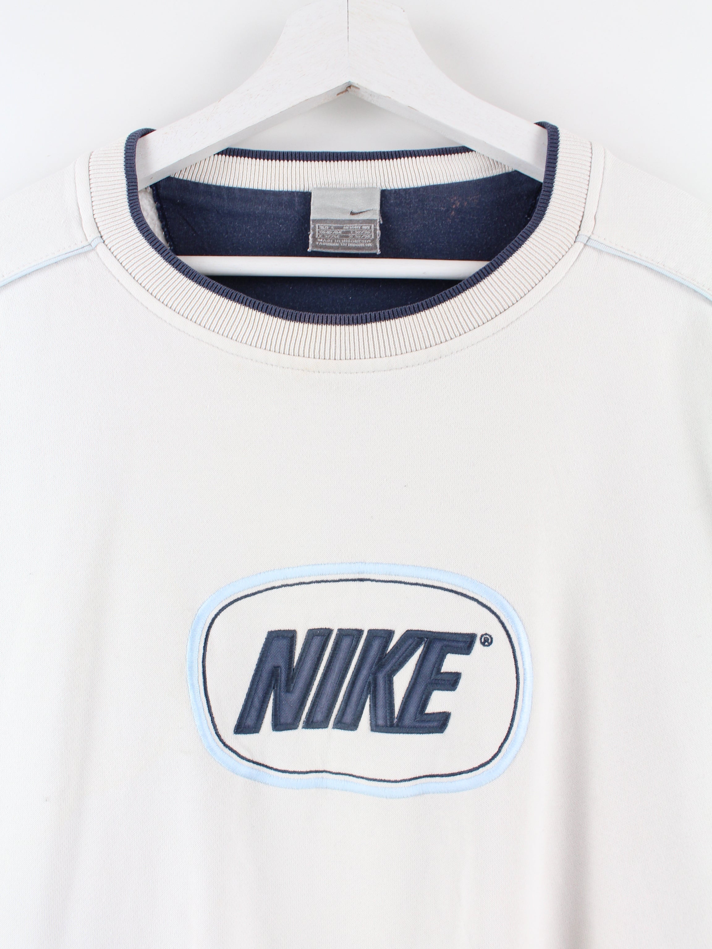 Weißer Vintage Nike Sweater mit aufgesticktem Logo.