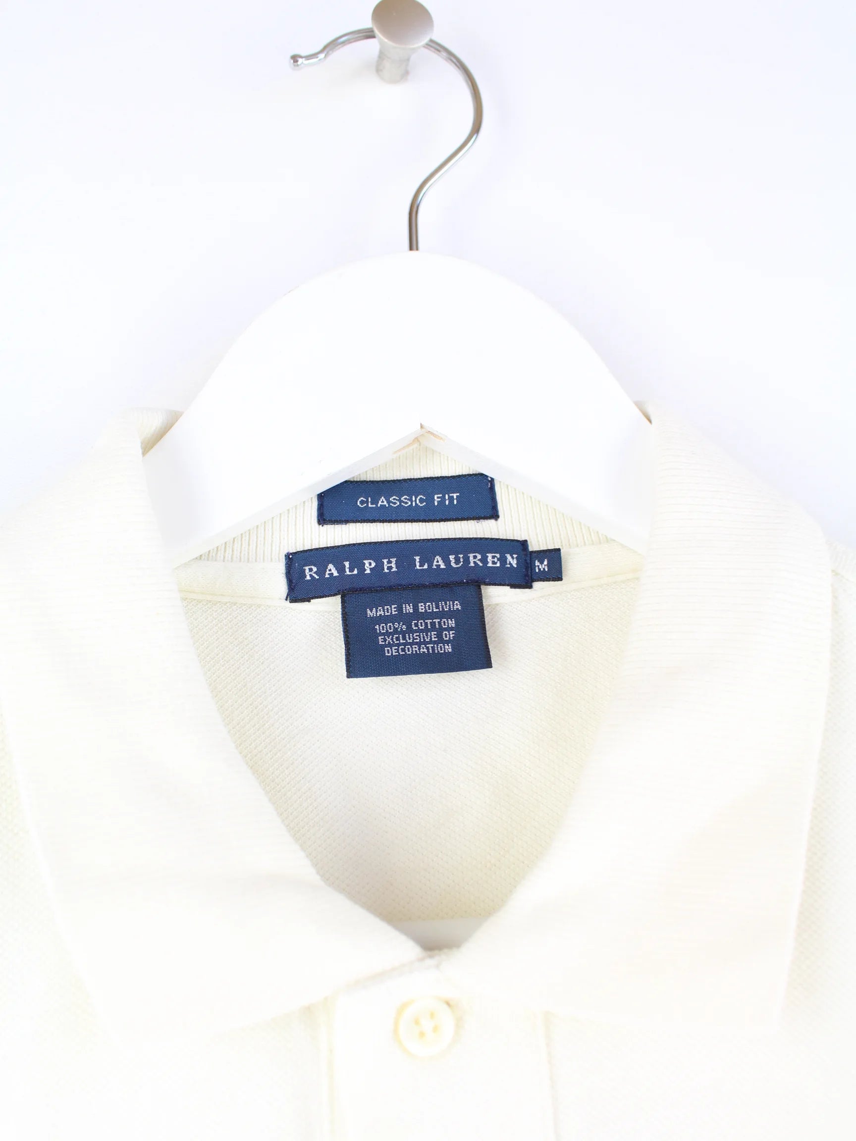 Weißes Poloshirt des Labels Ralph Lauren in Größe M. Es ist aus Baumwolle und in sehr gutem Zustand bei uns zu bekommen.